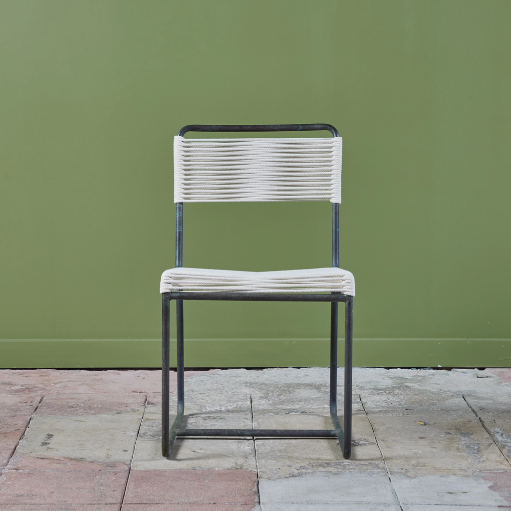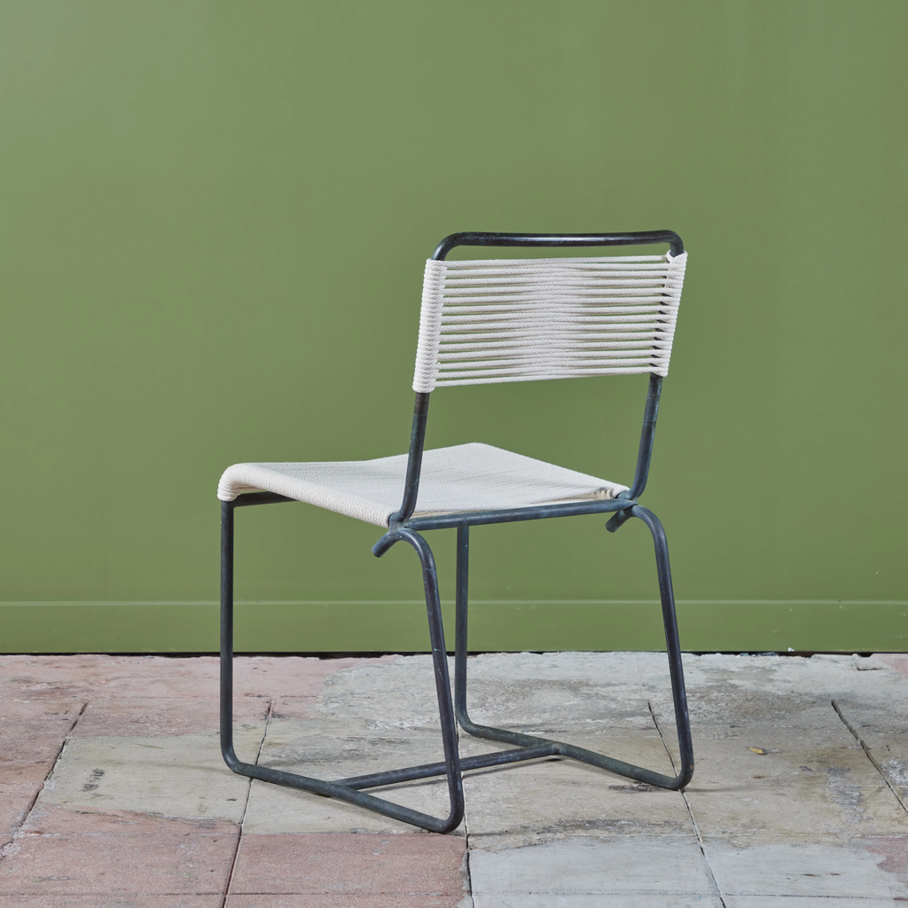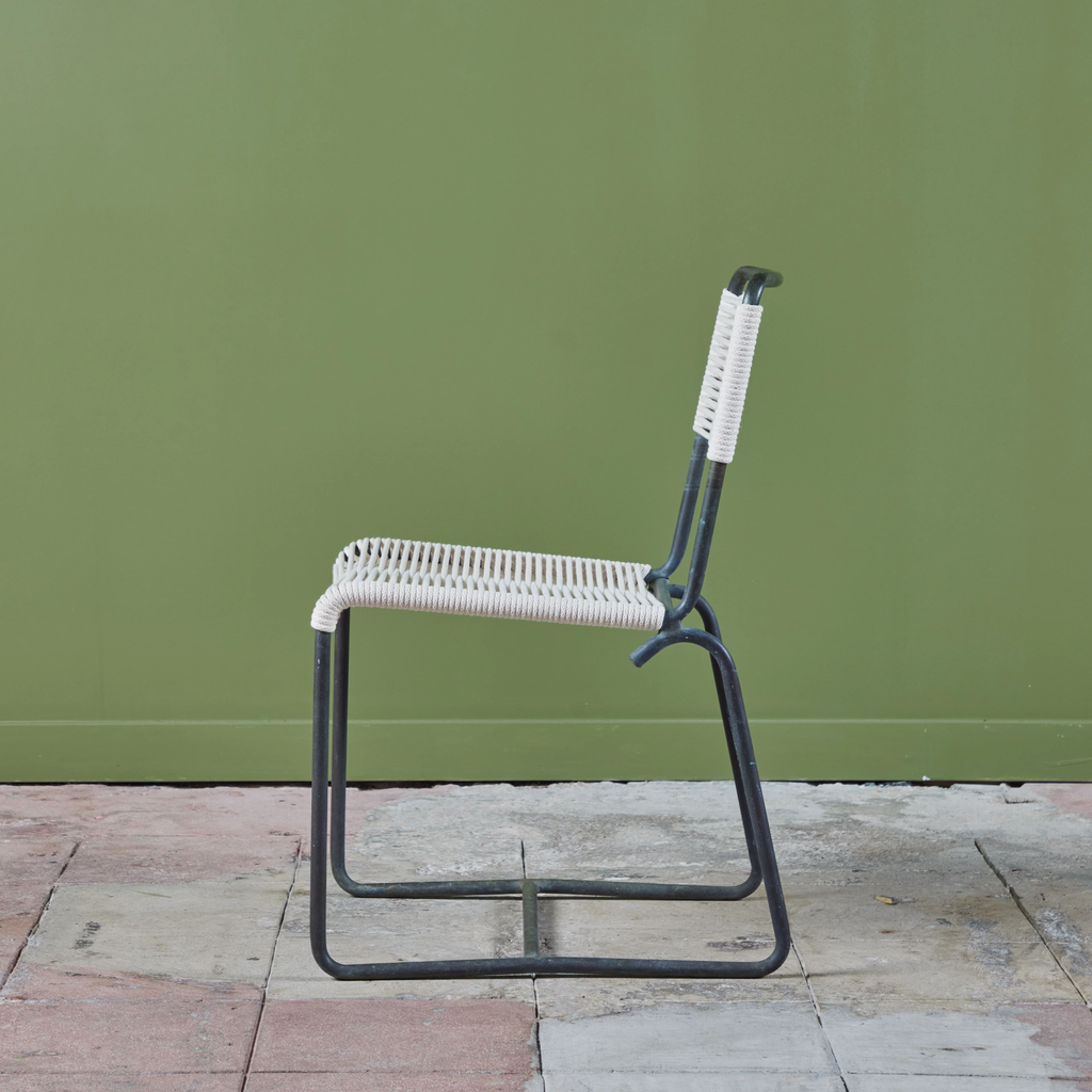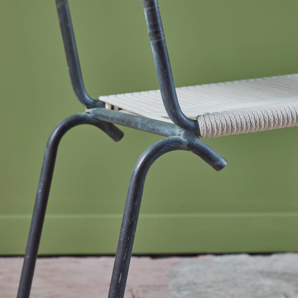 A model C1700 patio dining side chair in patinated bronze, designed by Walter Lamb and produced by Brown Jordan. The chair has a tubular frame supported by a bent bronze runner, terminating in a decorative curl just below the seat. The frame is roped with a cotton-nylon sail cord.