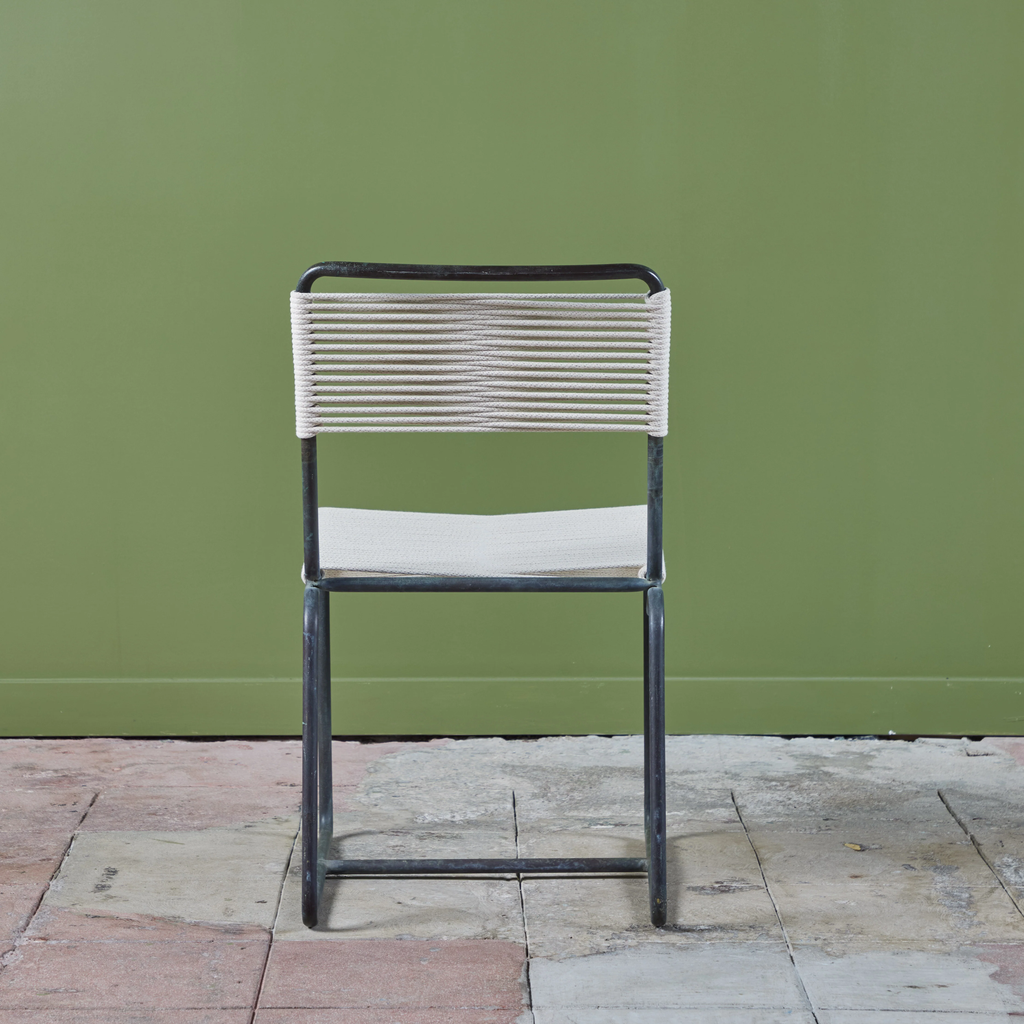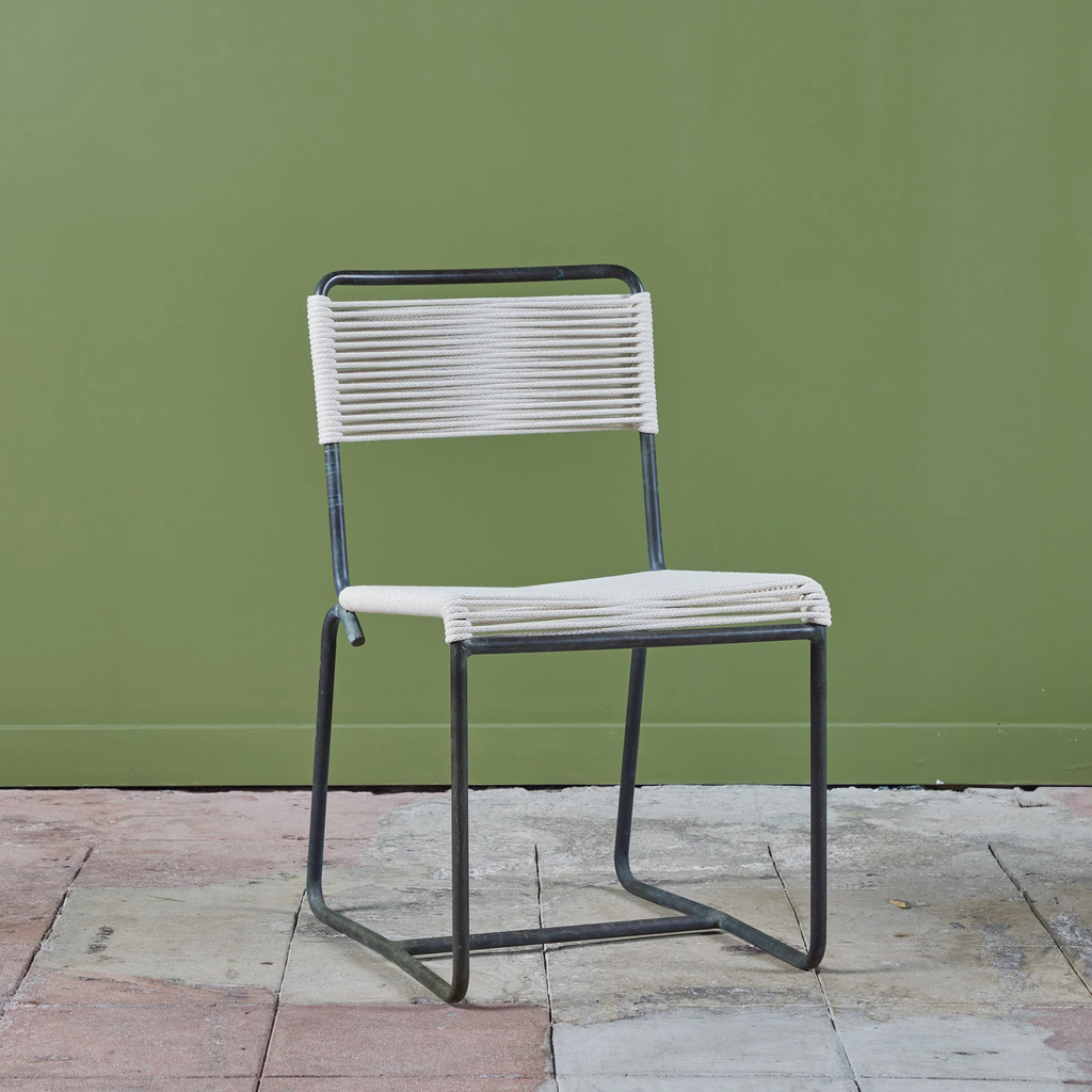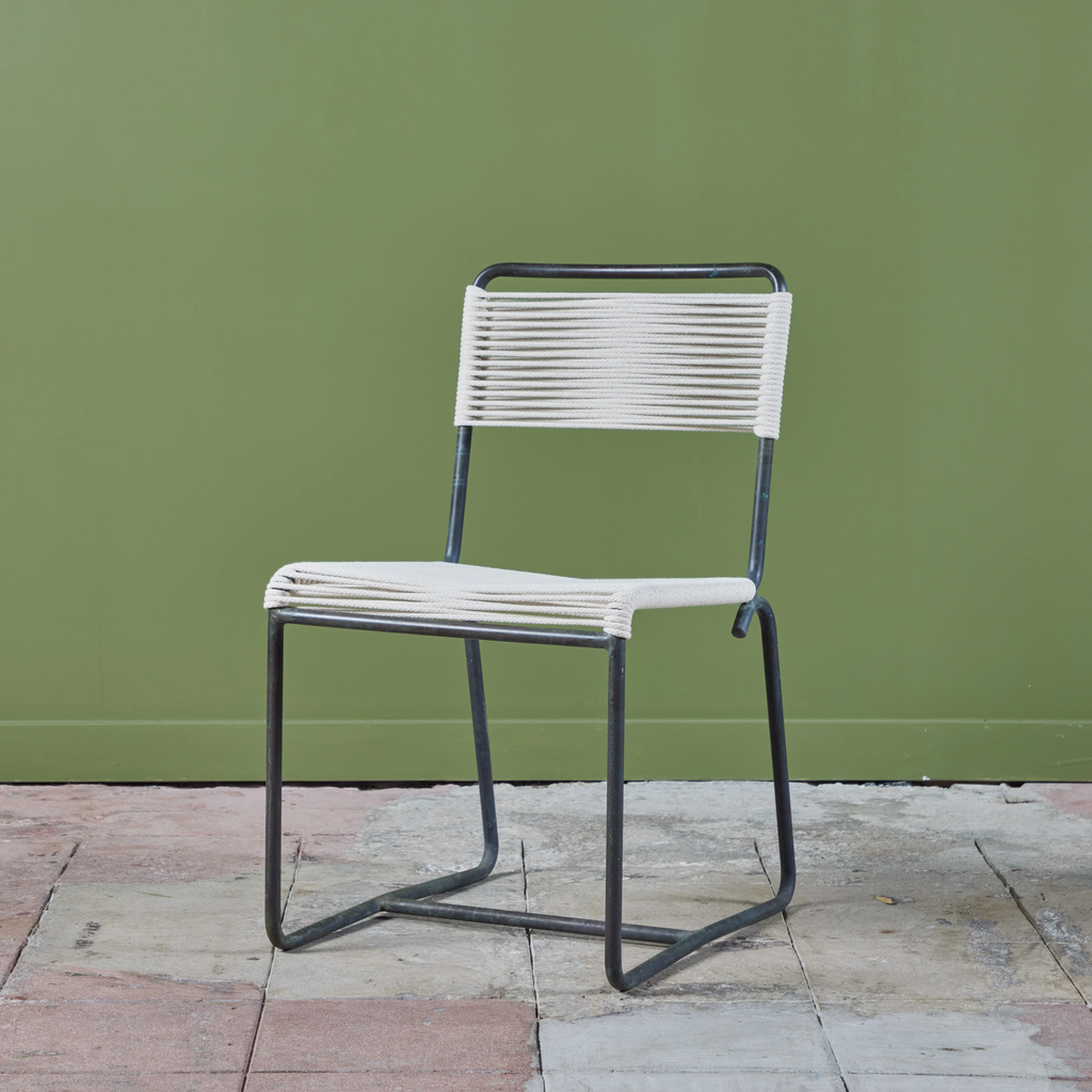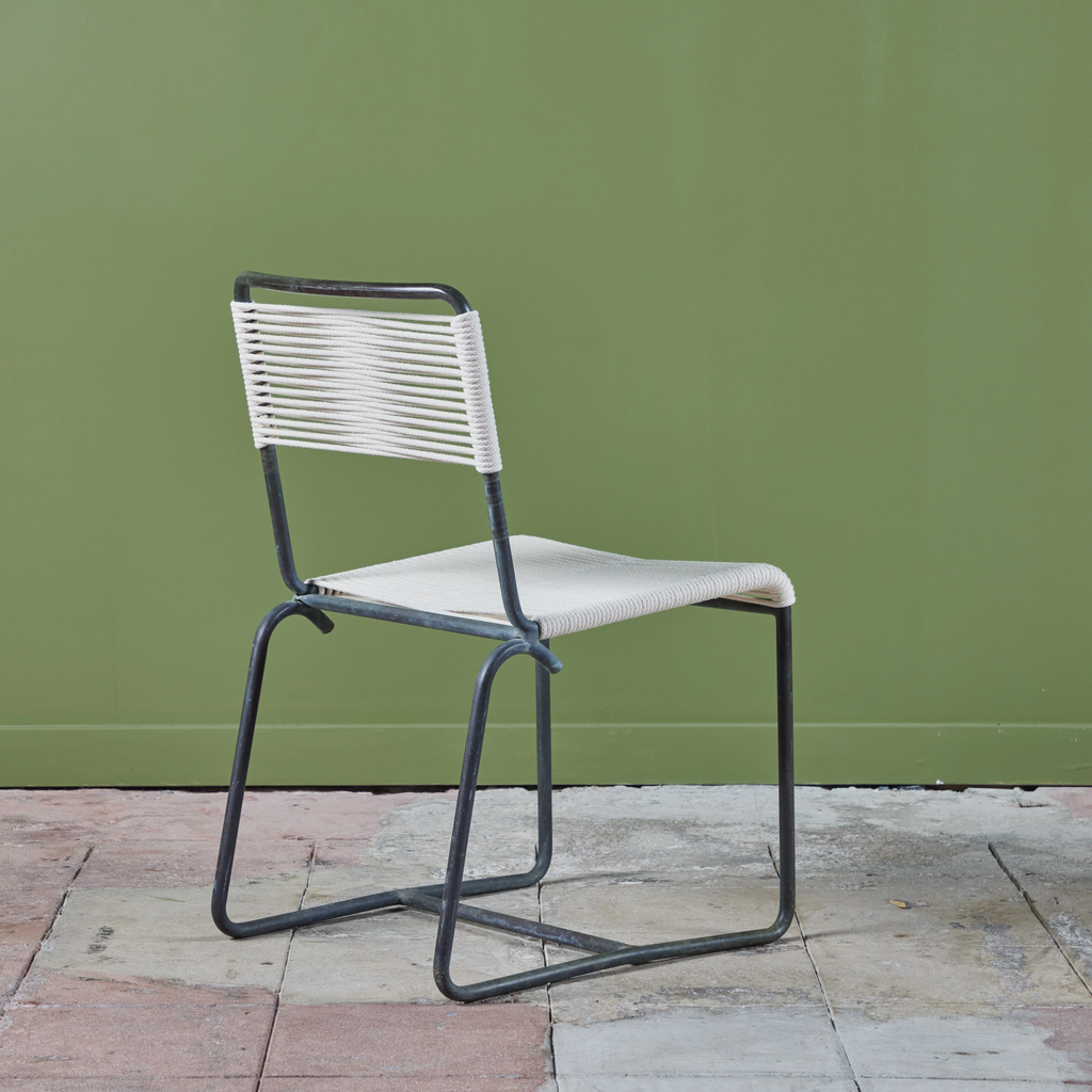 A model C1700 patio dining side chair in patinated bronze, designed by Walter Lamb and produced by Brown Jordan. The chair has a tubular frame supported by a bent bronze runner, terminating in a decorative curl just below the seat. The frame is roped with a cotton-nylon sail cord.