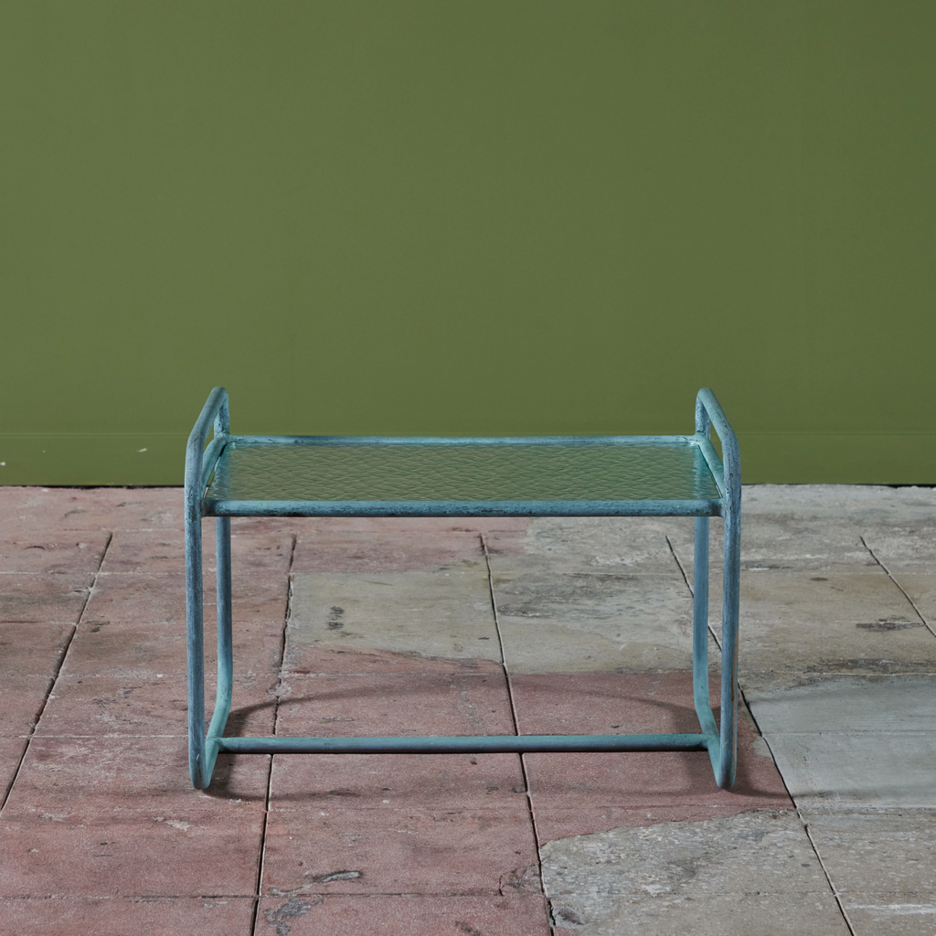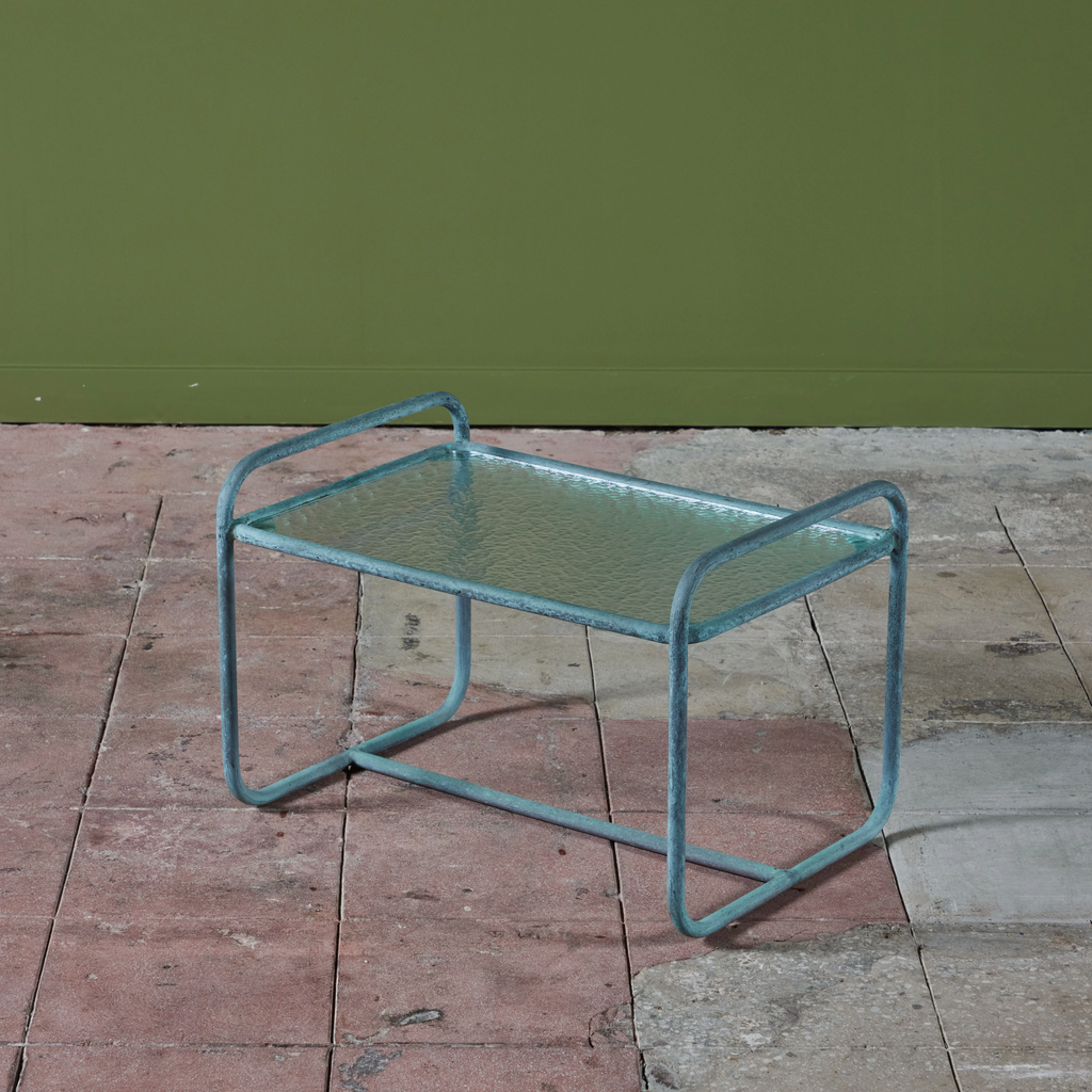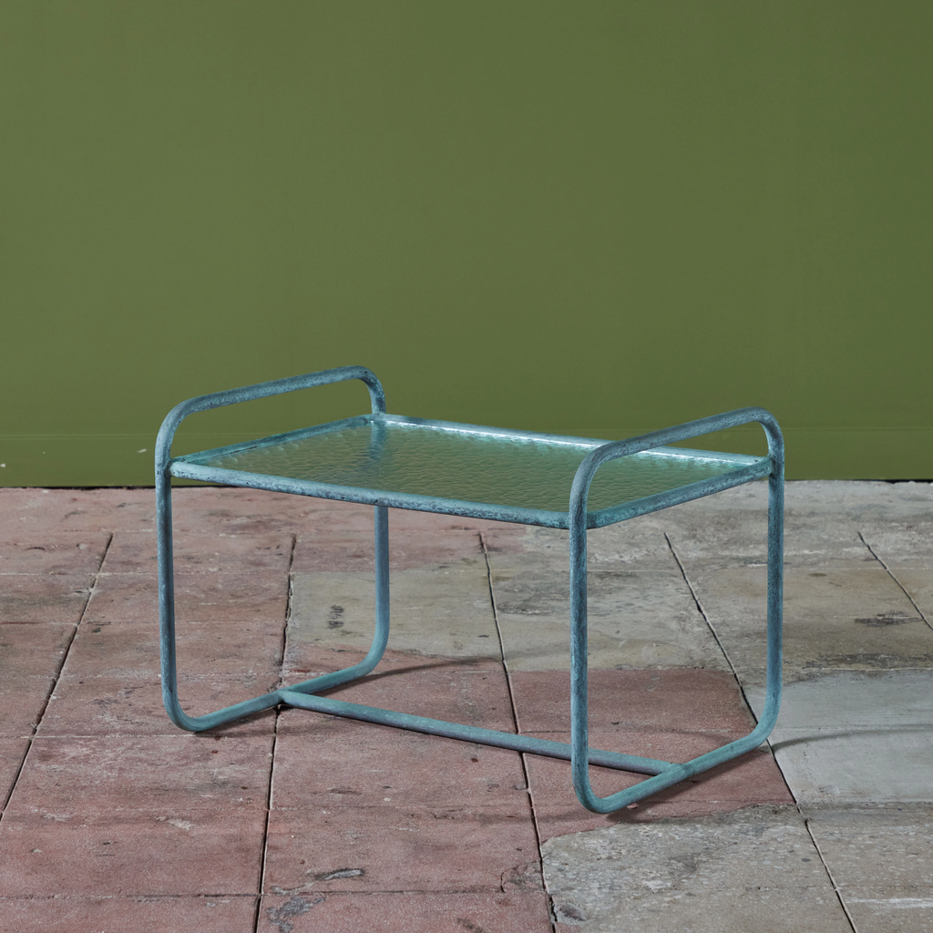 Patio side table designed by Walter Lamb and produced by Brown Jordan. The table frame at 25.5" width is bronze tubing with a verdigris patina with an inset hammered glass tabletop. Two curved rails form the legs and create the “handles” on either side of the table surface.