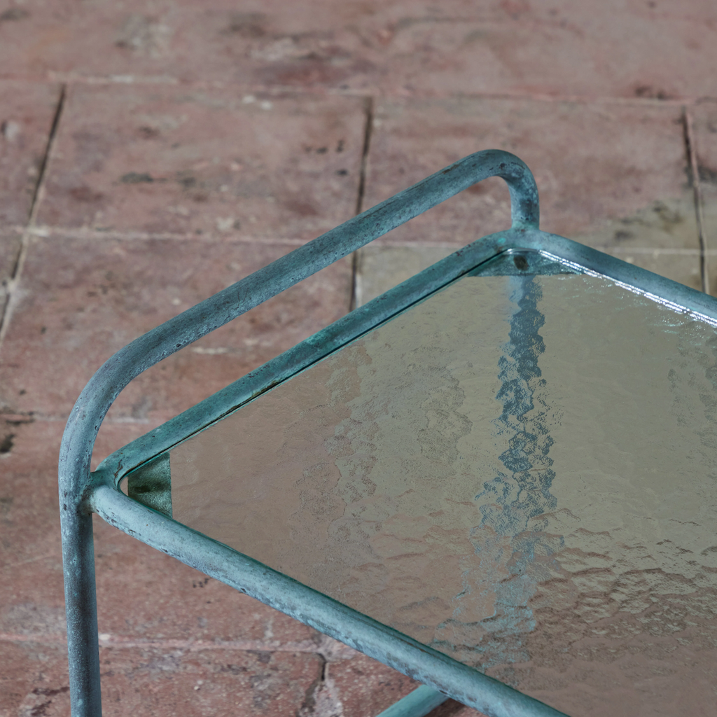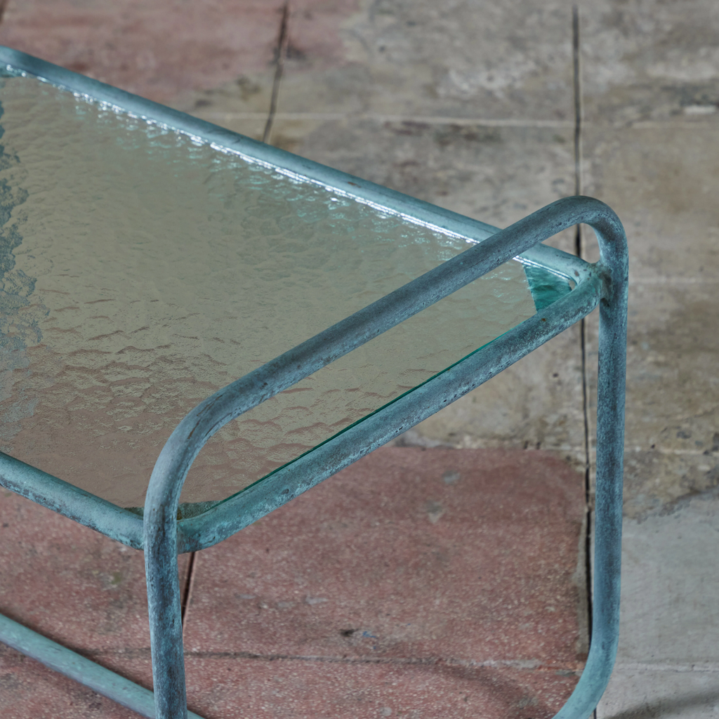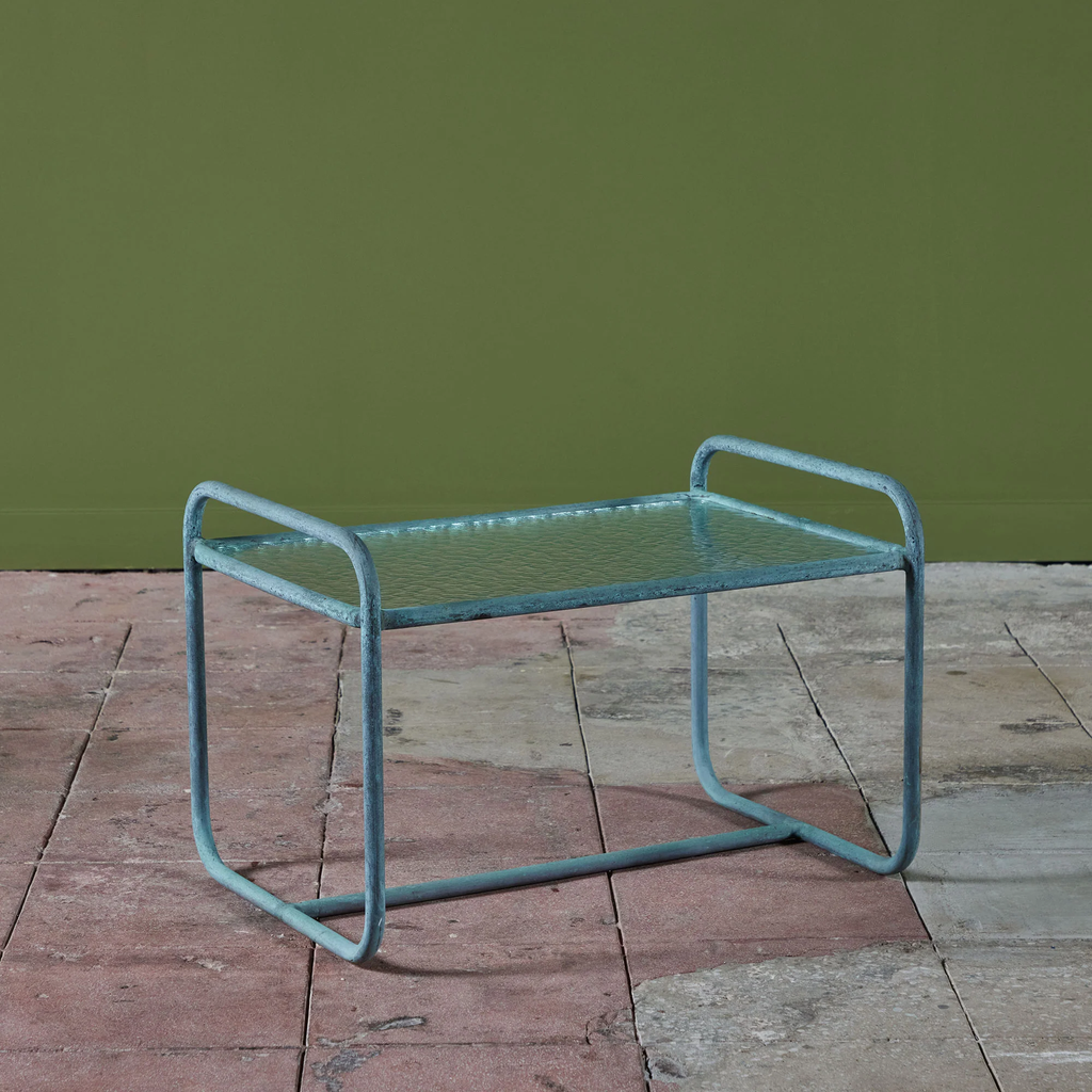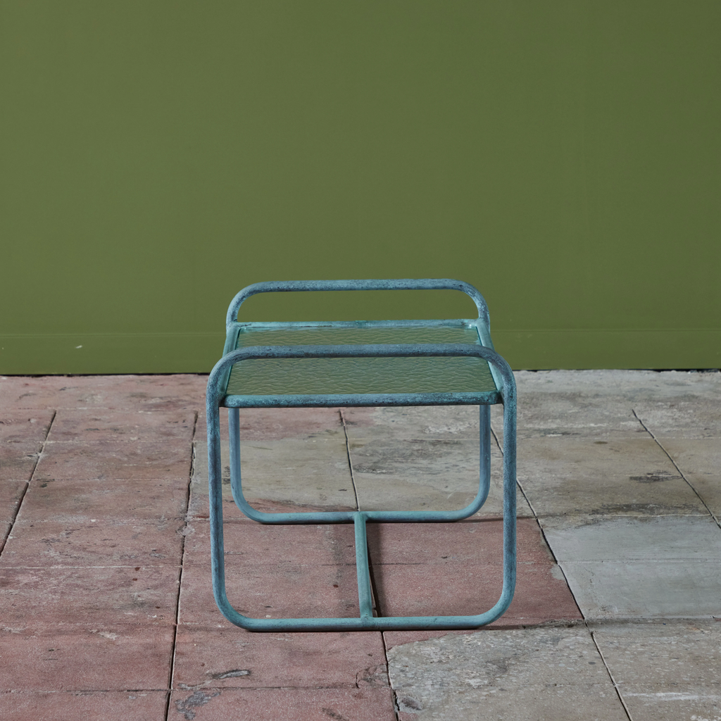 Patio side table designed by Walter Lamb and produced by Brown Jordan. The table frame at 25.5" width is bronze tubing with a verdigris patina with an inset hammered glass tabletop. Two curved rails form the legs and create the “handles” on either side of the table surface.