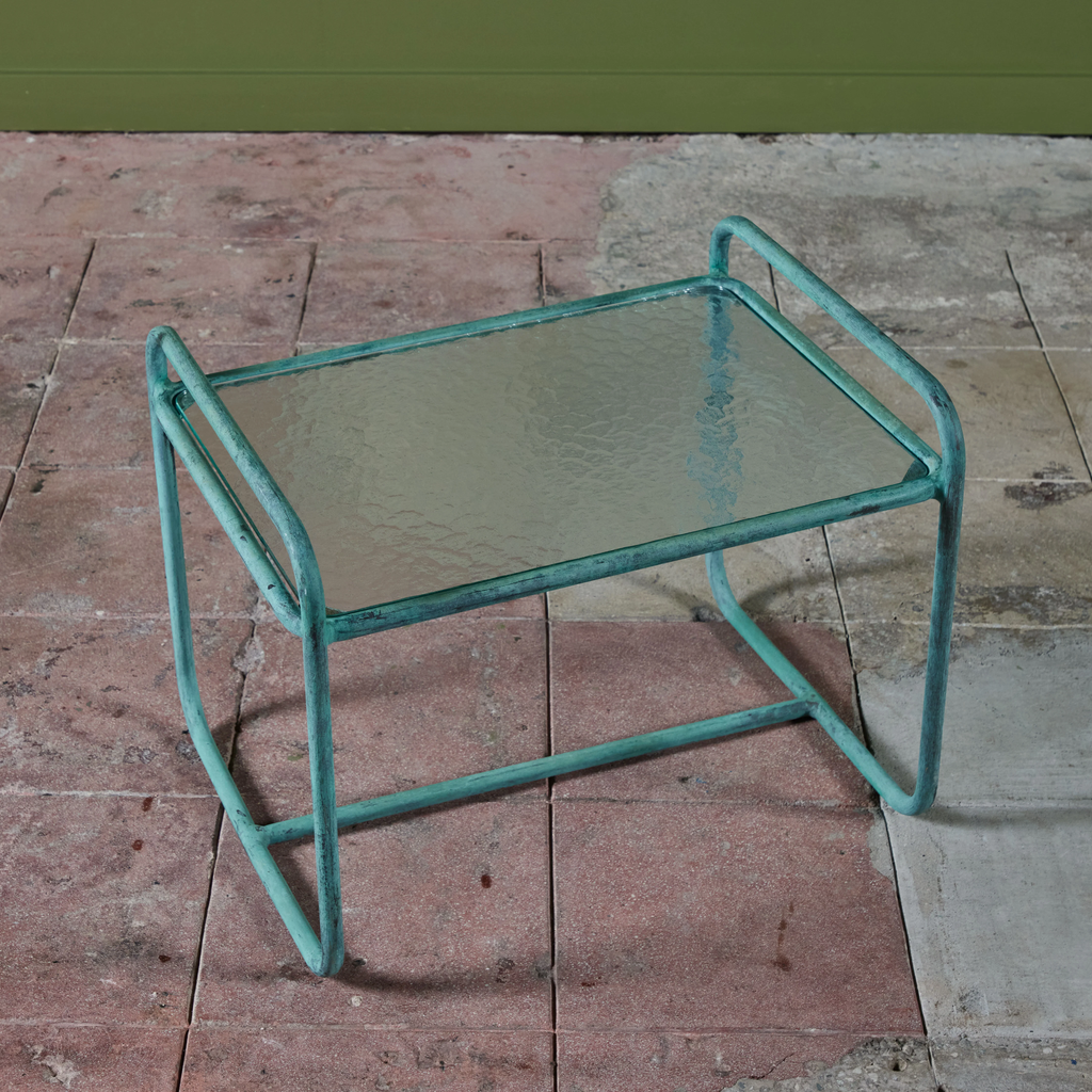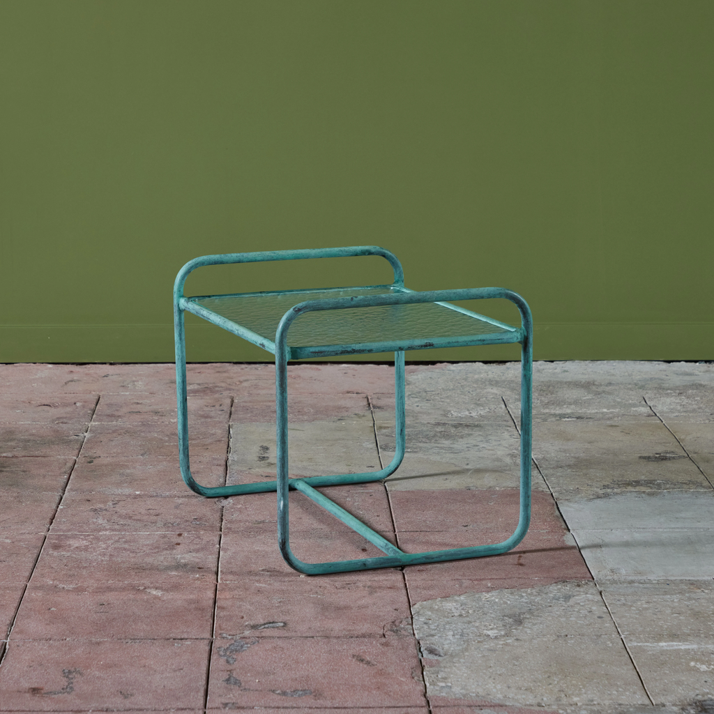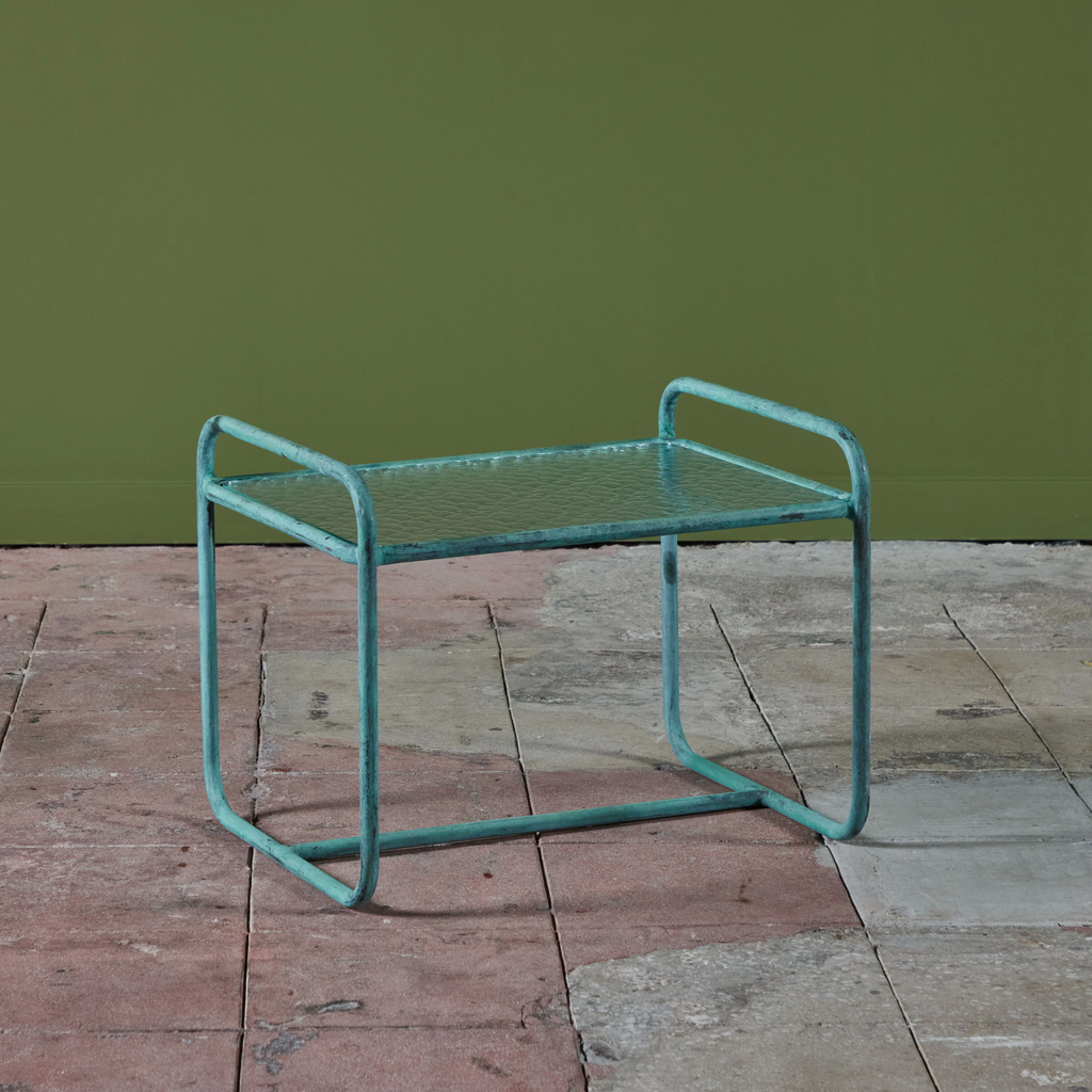 Patio side table designed by Walter Lamb and produced by Brown Jordan. The table frame at 23.5" width is bronze tubing with a verdigris patina with an inset hammered glass tabletop. Two curved rails form the legs and create the “handles” on either side of the table surface.