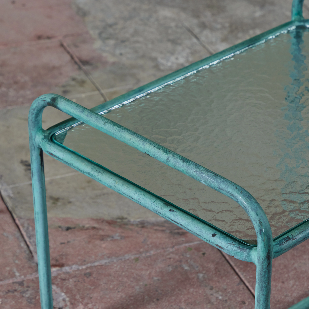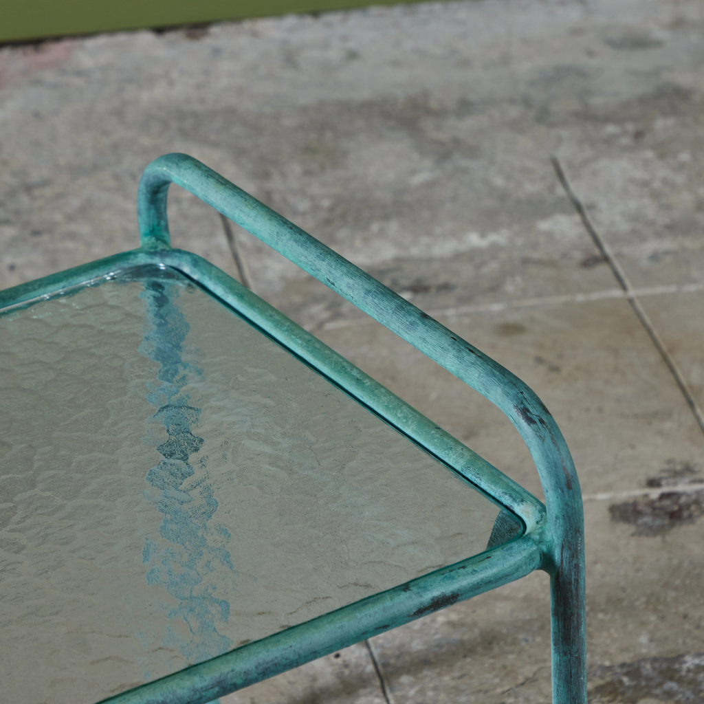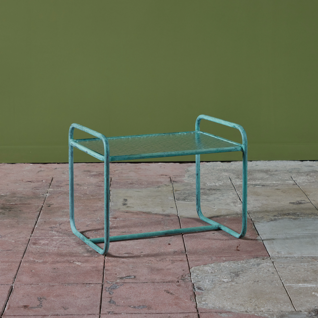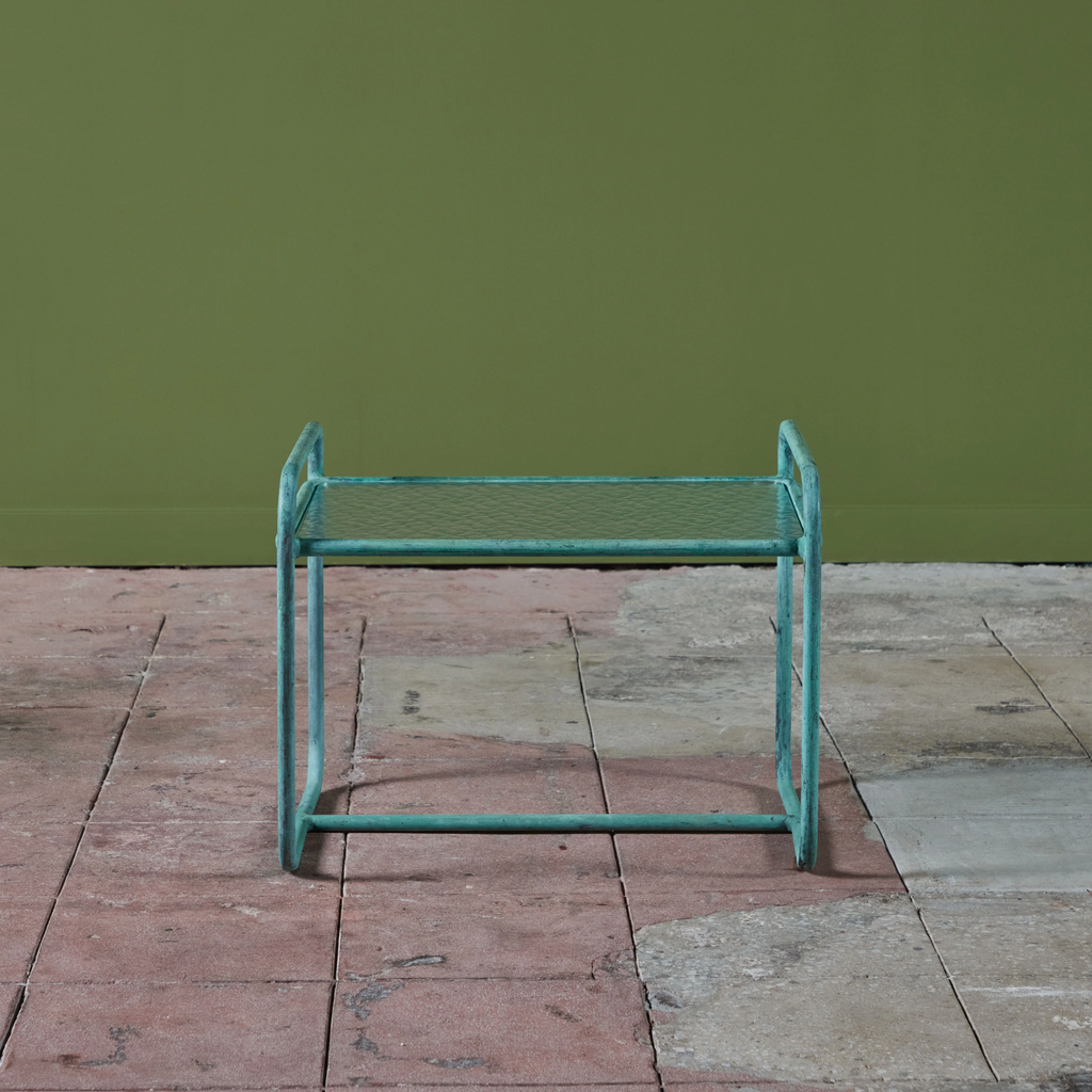 Patio side table designed by Walter Lamb and produced by Brown Jordan. The table frame at 23.5" width is bronze tubing with a verdigris patina with an inset hammered glass tabletop. Two curved rails form the legs and create the “handles” on either side of the table surface.