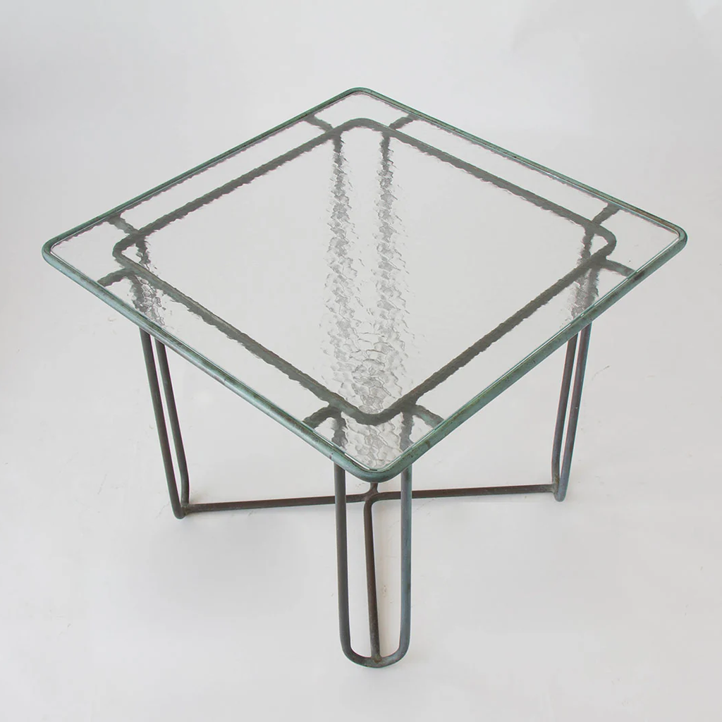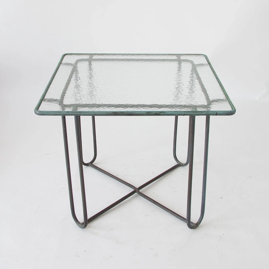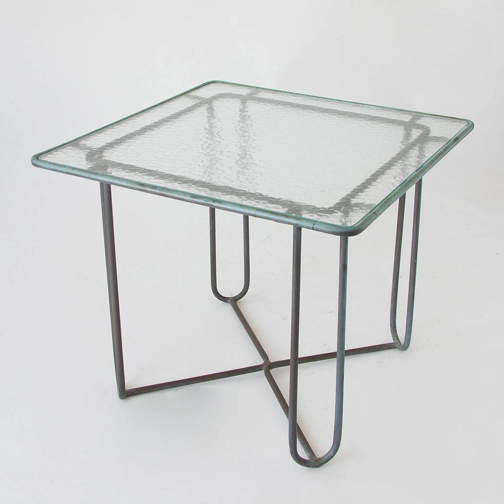 A small patio dining or a card table in patinated bronze designed by Walter Lamb and produced by Brown Jordan. The table has a square shape with rounded corners, supported by four hairpin legs in matching bronze. The legs are joined by diagonal stretchers that sit on the ground for support. The tabletop is a single piece of hammered glass that fits inside the bronze frame.