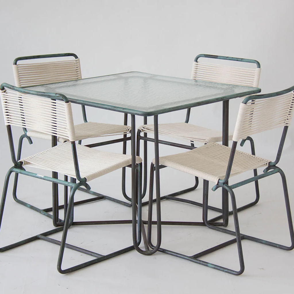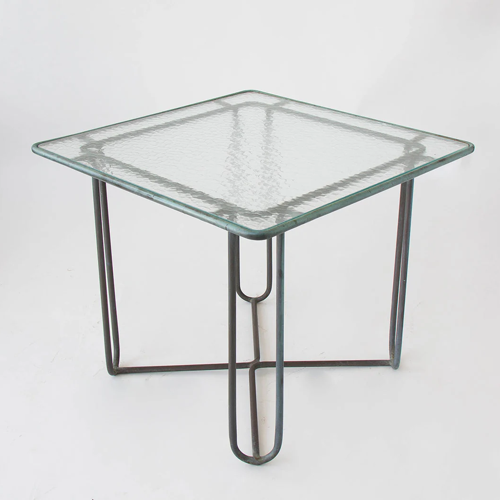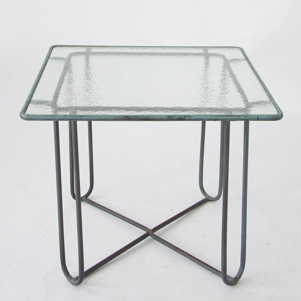 A small patio dining or a card table in patinated bronze designed by Walter Lamb and produced by Brown Jordan. The table has a square shape with rounded corners, supported by four hairpin legs in matching bronze. The legs are joined by diagonal stretchers that sit on the ground for support. The tabletop is a single piece of hammered glass that fits inside the bronze frame.