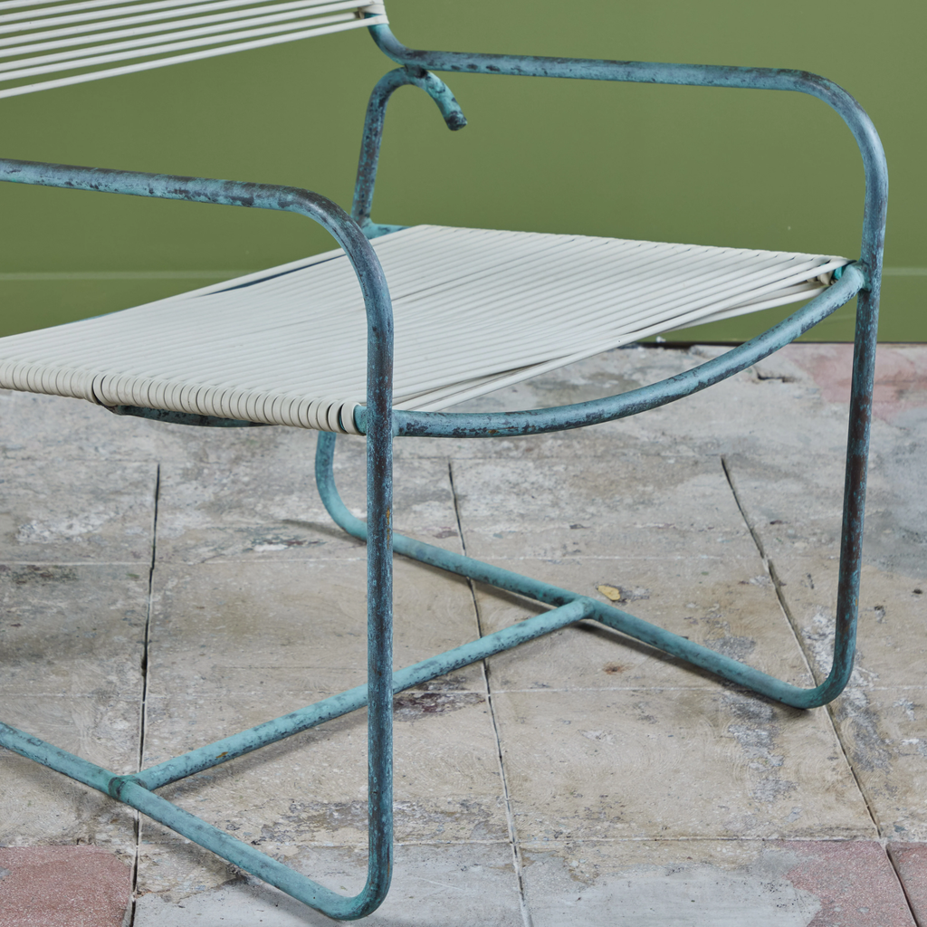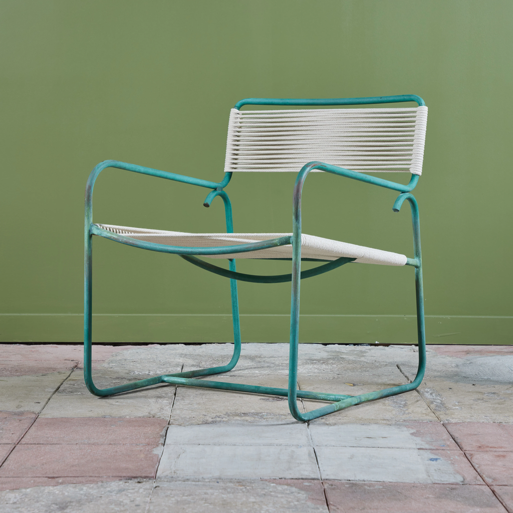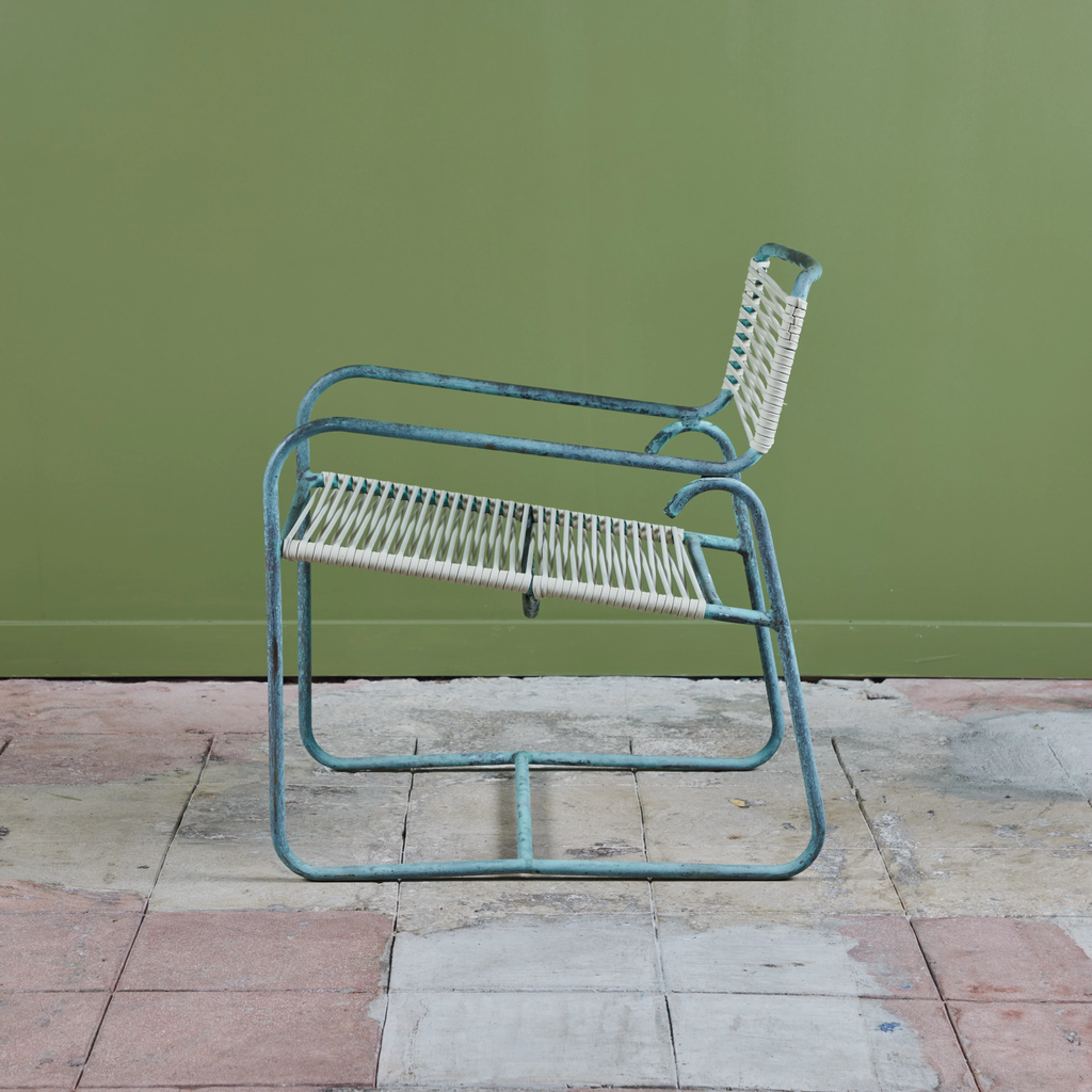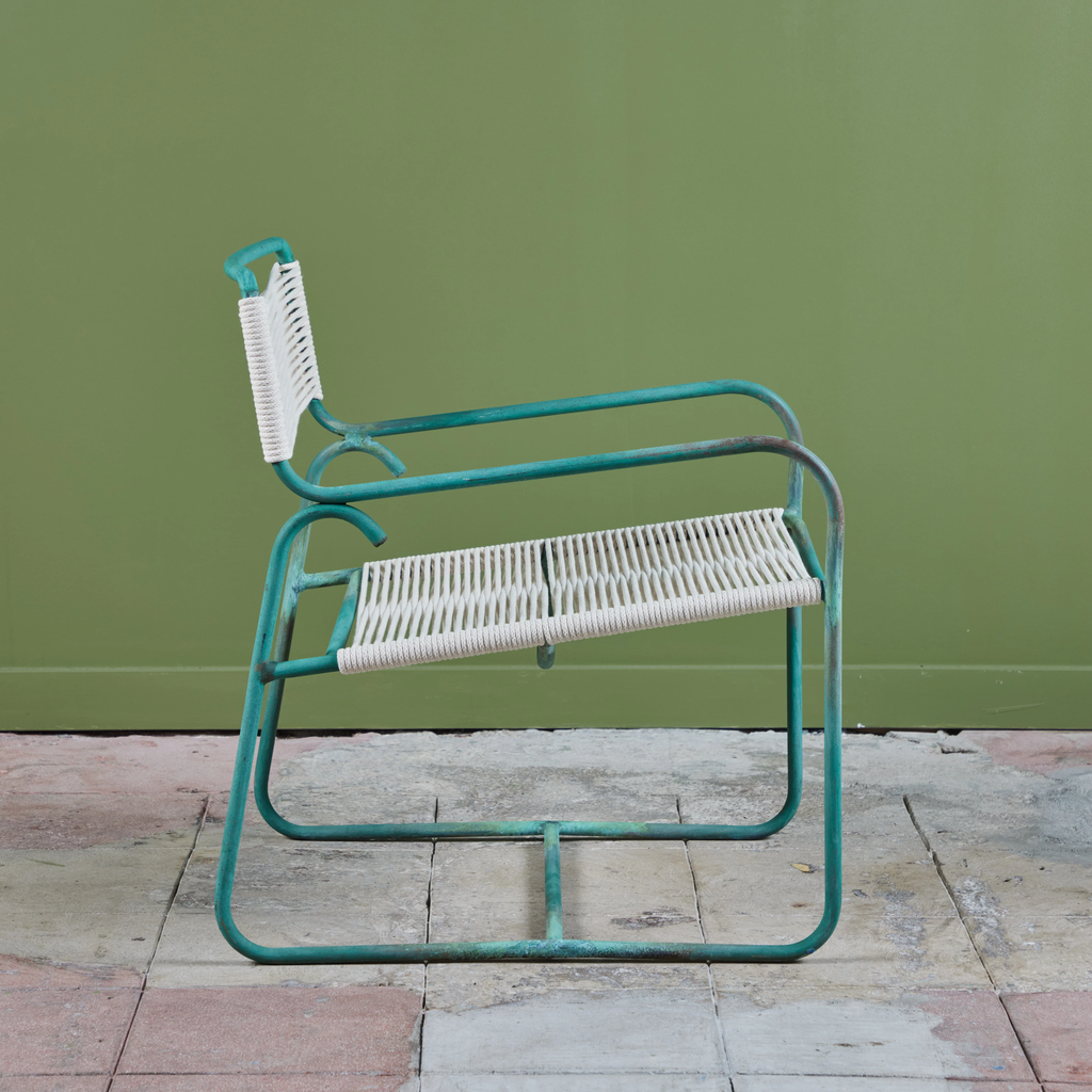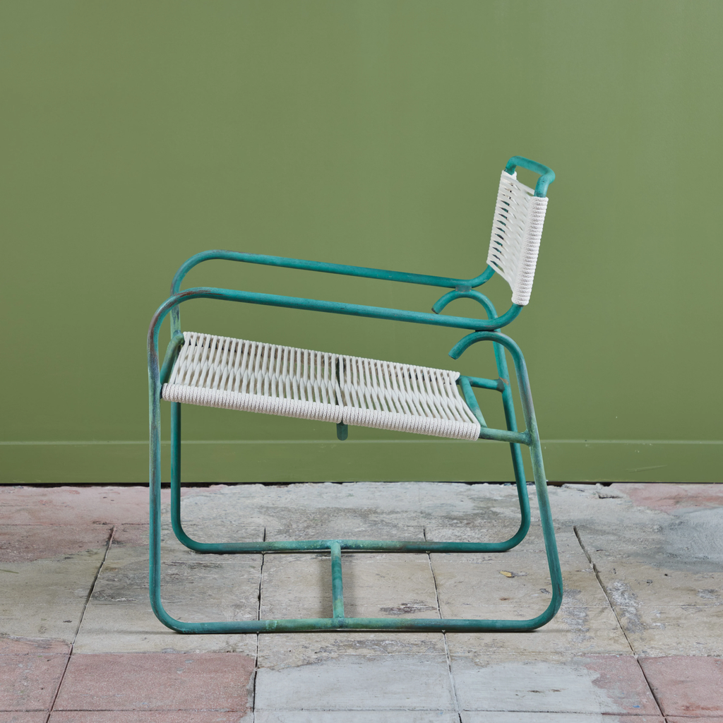 A wide patio lounge chair by Walter Lamb for Brown Jordan. The chair has a simple construction in tubular bronze with a patinated finish, with rounded squares serving as runners on each side. The backrest and seat are both woven in cotton sail cord.