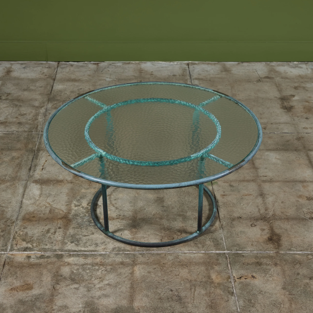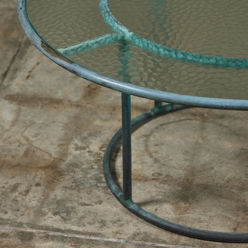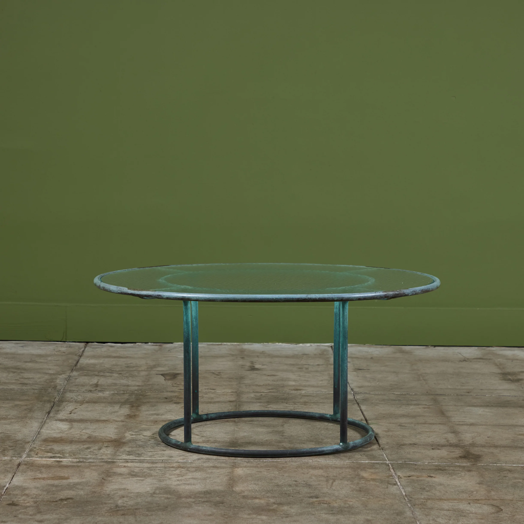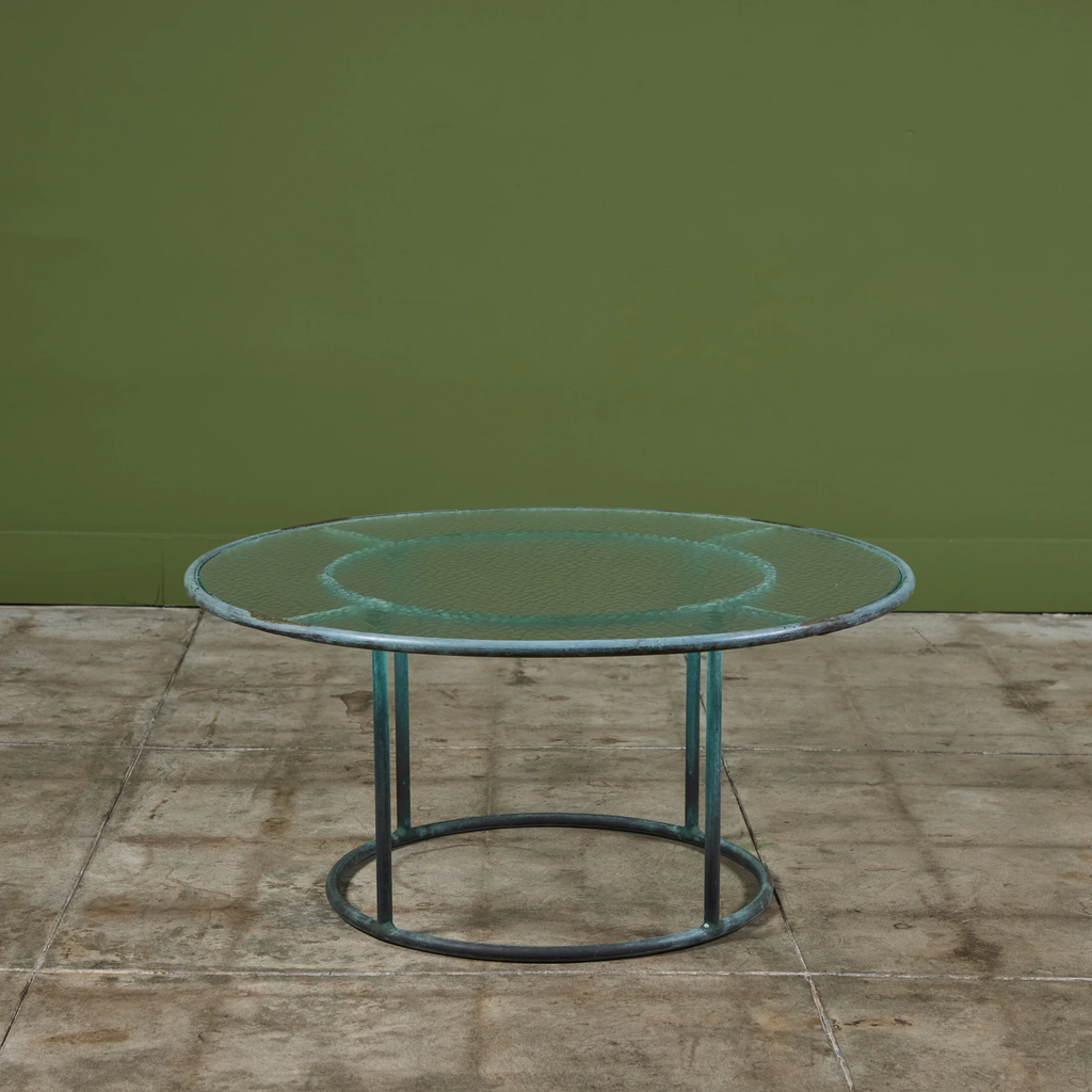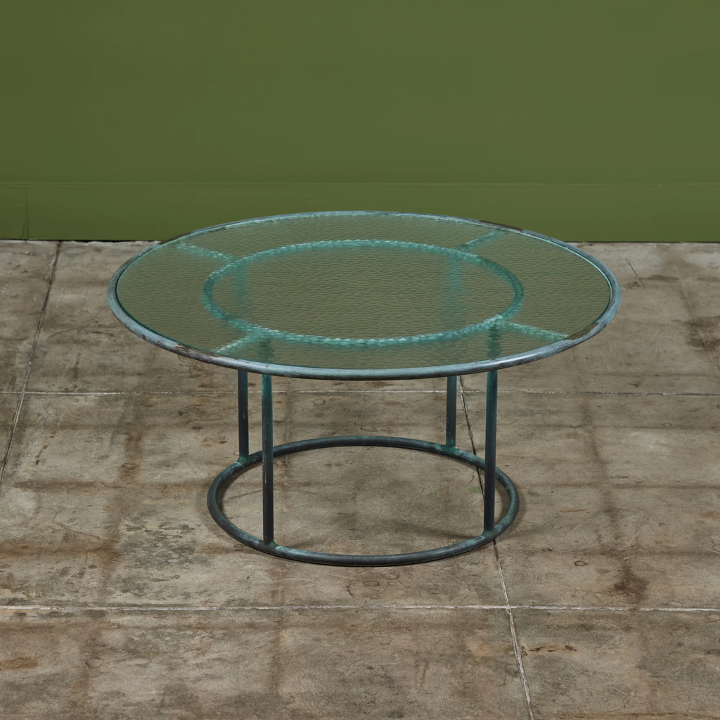 Patio coffee table in patinated bronze designed by Walter Lamb and produced by Brown Jordan. The frame is described by two concentric rings of bronze with radial supports and a circular bronze base. The round tabletop is a single piece of hammered glass that fits inside the bronze frame.