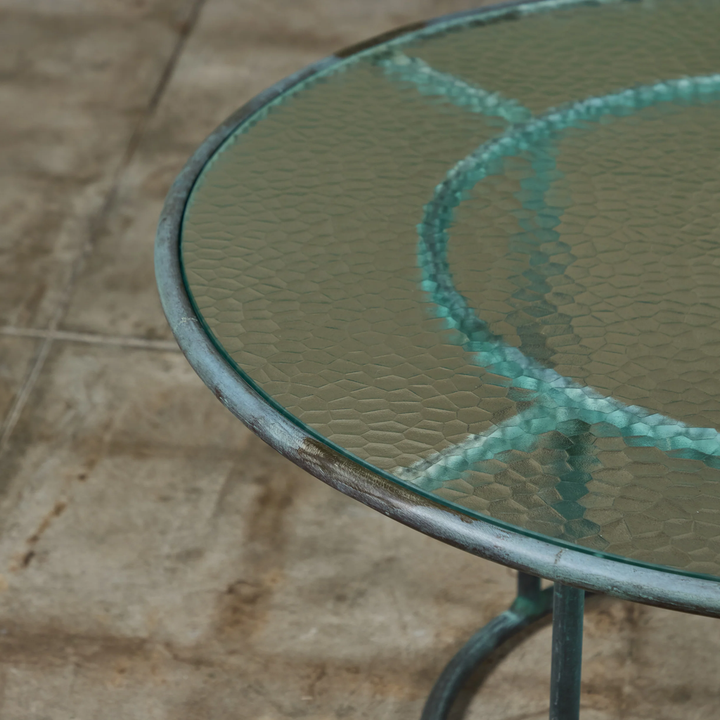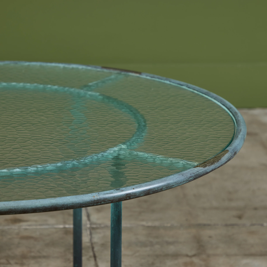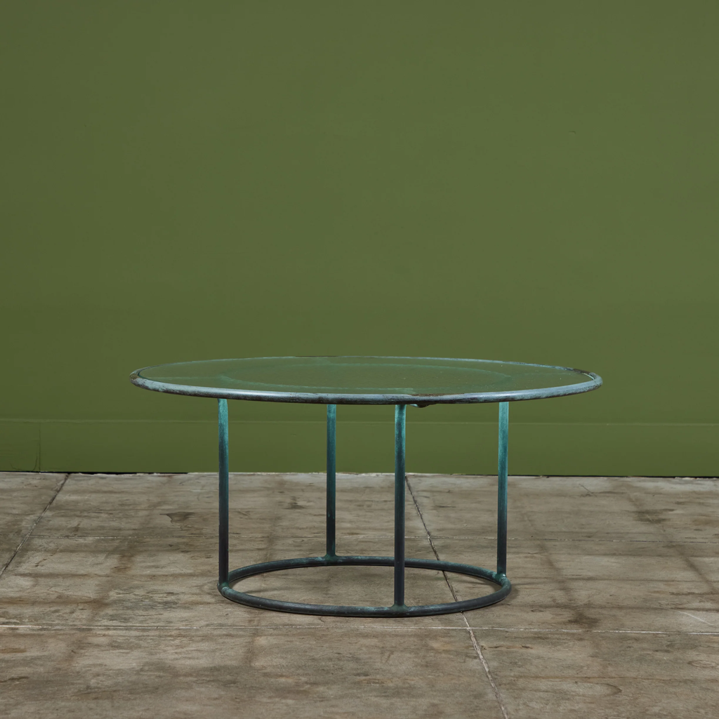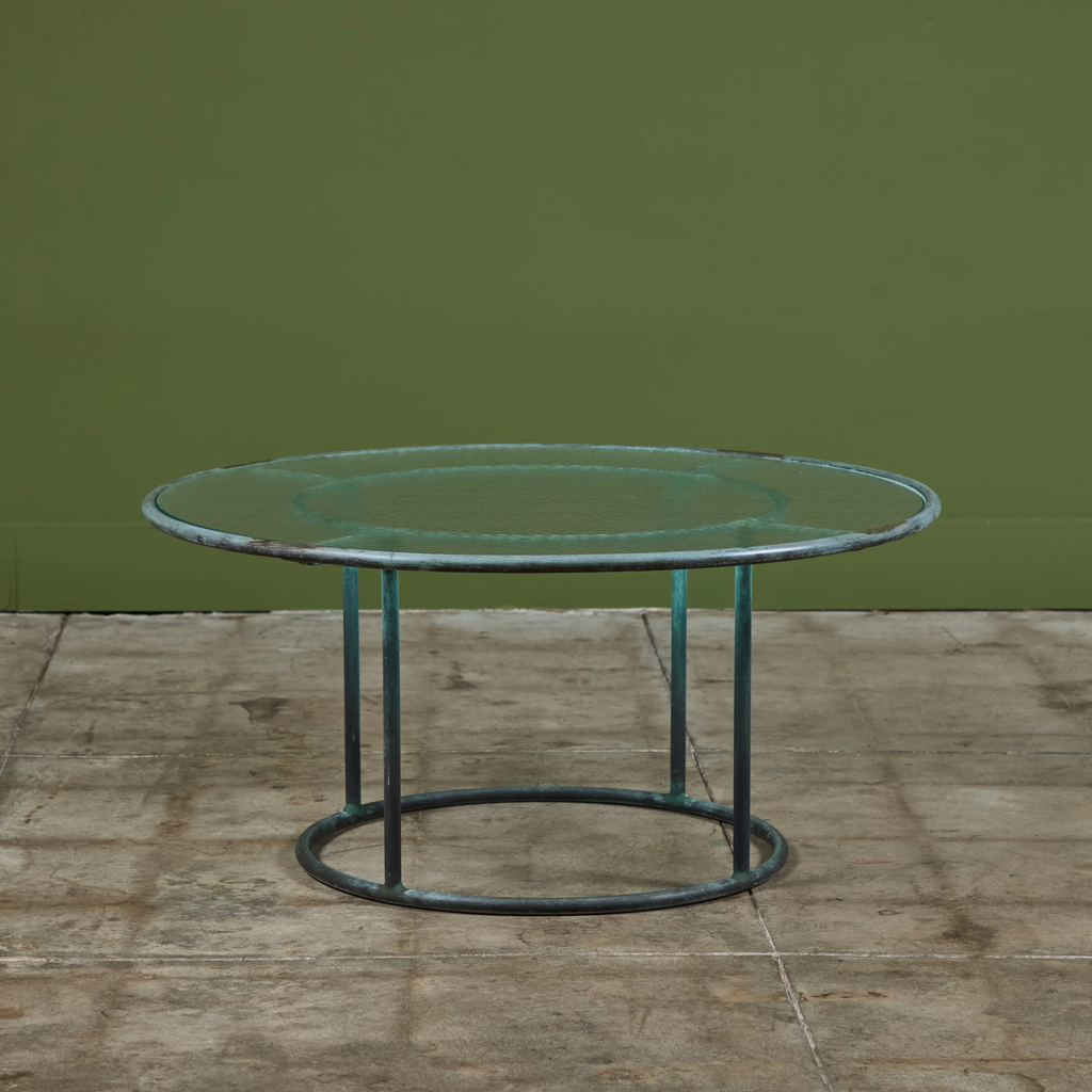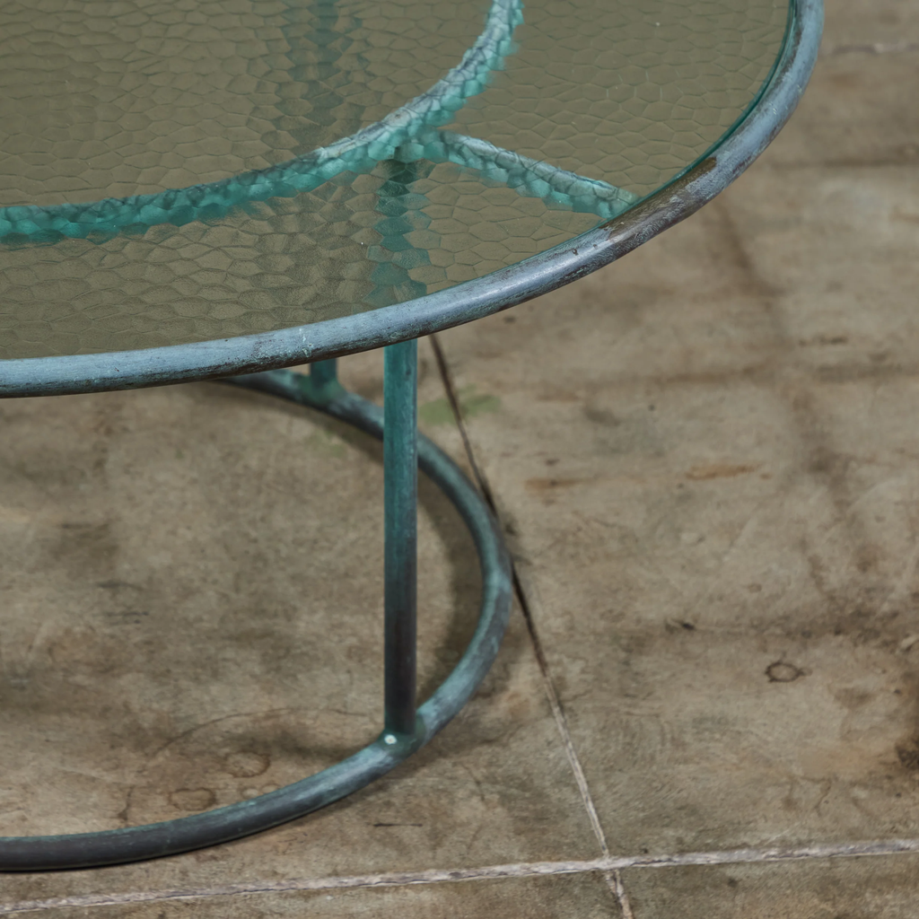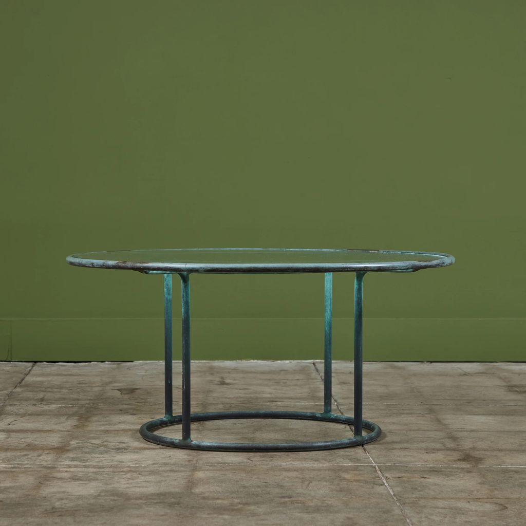 Patio coffee table in patinated bronze designed by Walter Lamb and produced by Brown Jordan. The frame is described by two concentric rings of bronze with radial supports and a circular bronze base. The round tabletop is a single piece of hammered glass that fits inside the bronze frame.