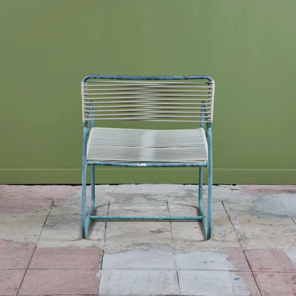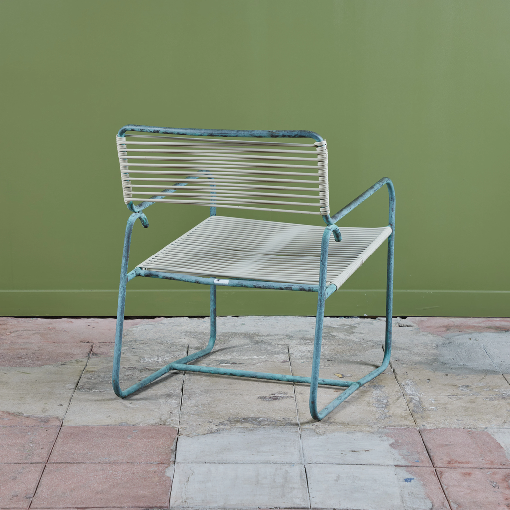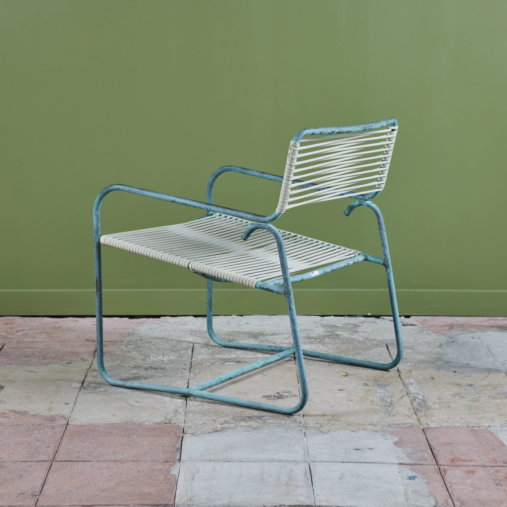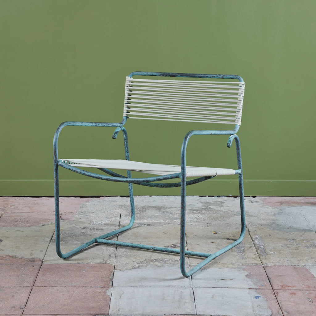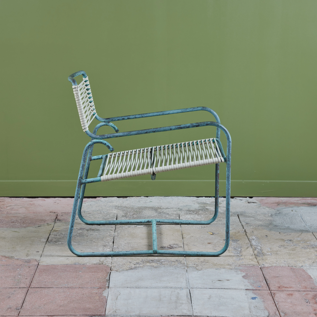 A wide patio lounge chair by Walter Lamb for Brown Jordan. The chair has a simple construction in tubular bronze with a patinated finish, with rounded squares serving as runners on each side. The backrest and seat are both original vinyl cord.