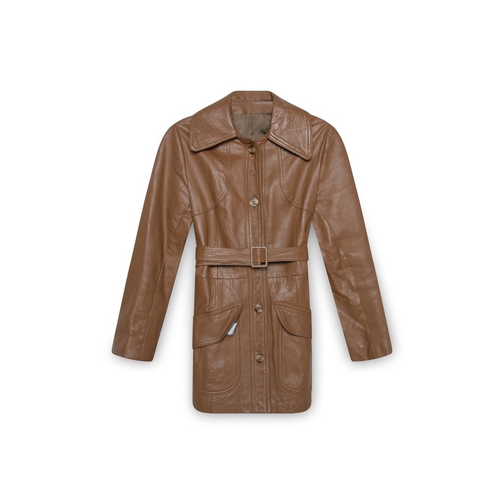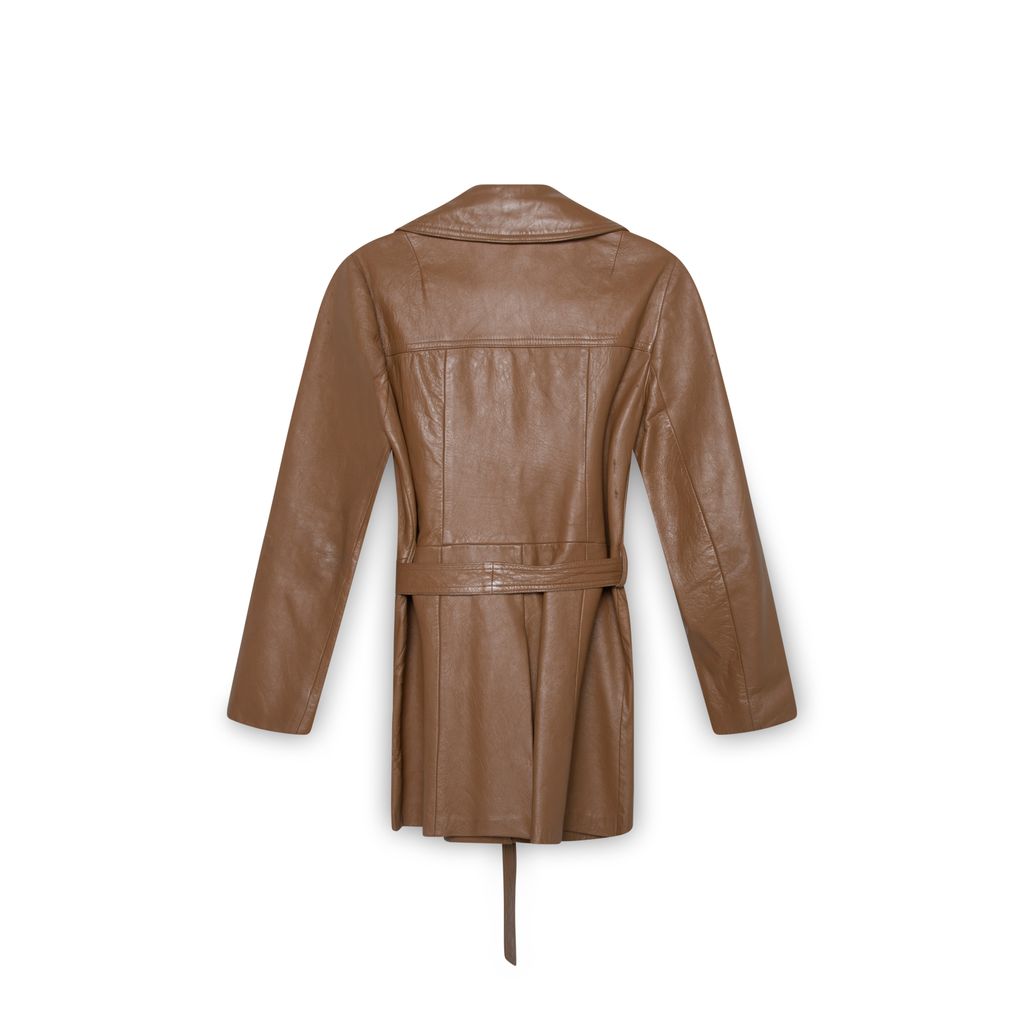 Brown Belted Leather Coat features matching belt, front button closure, single back vent, and 2 side pockets.
