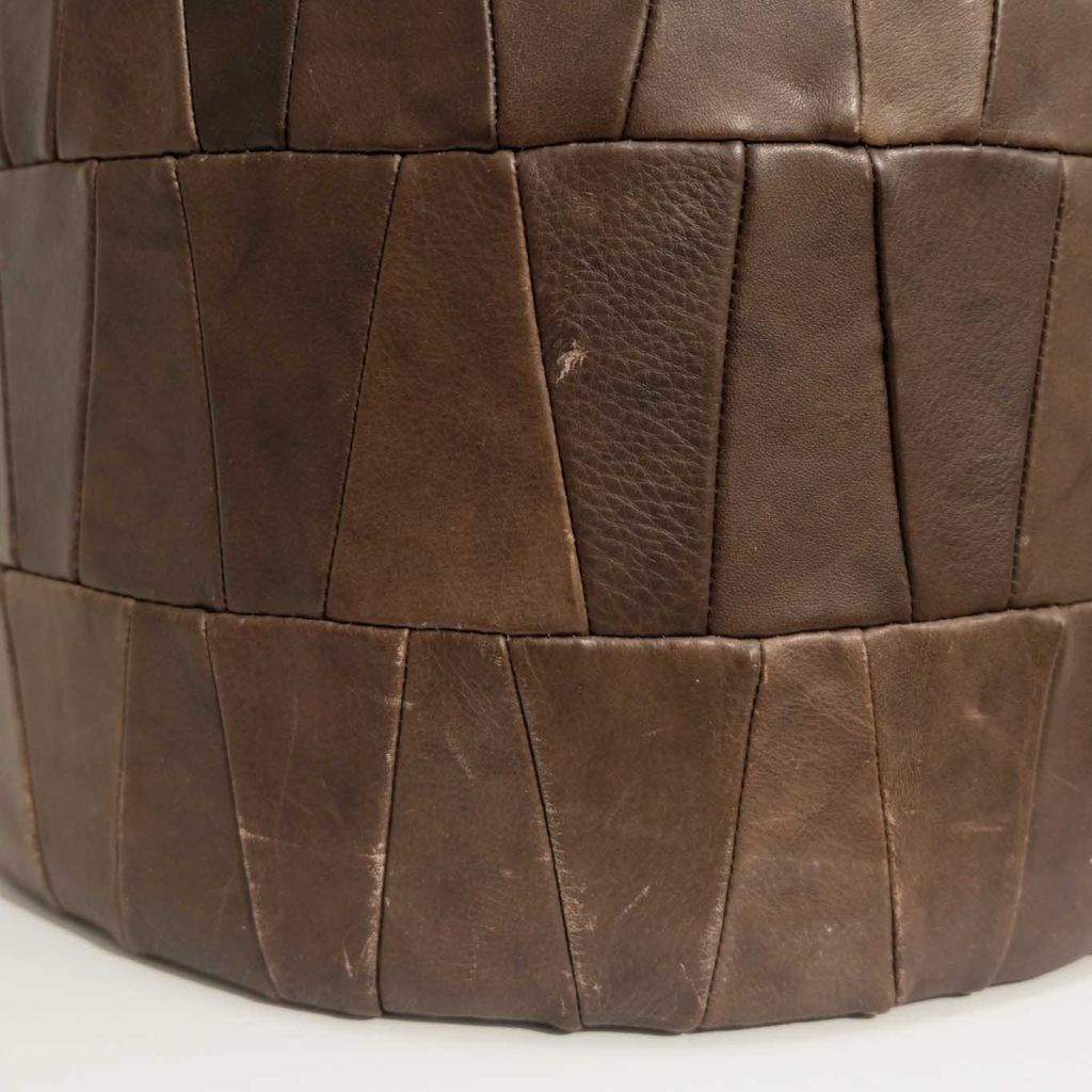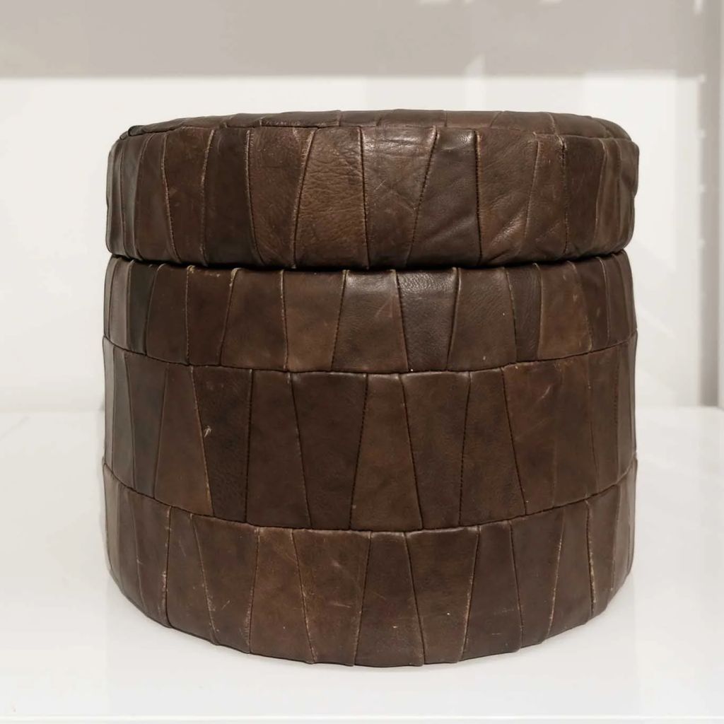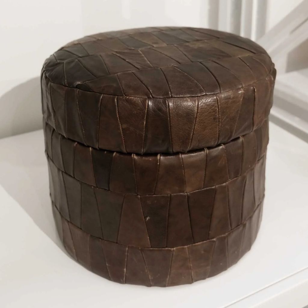 Brown patchwork leather ottoman that doubles as a small storage bin. Top of ottoman removes to reveal a lined storage space.