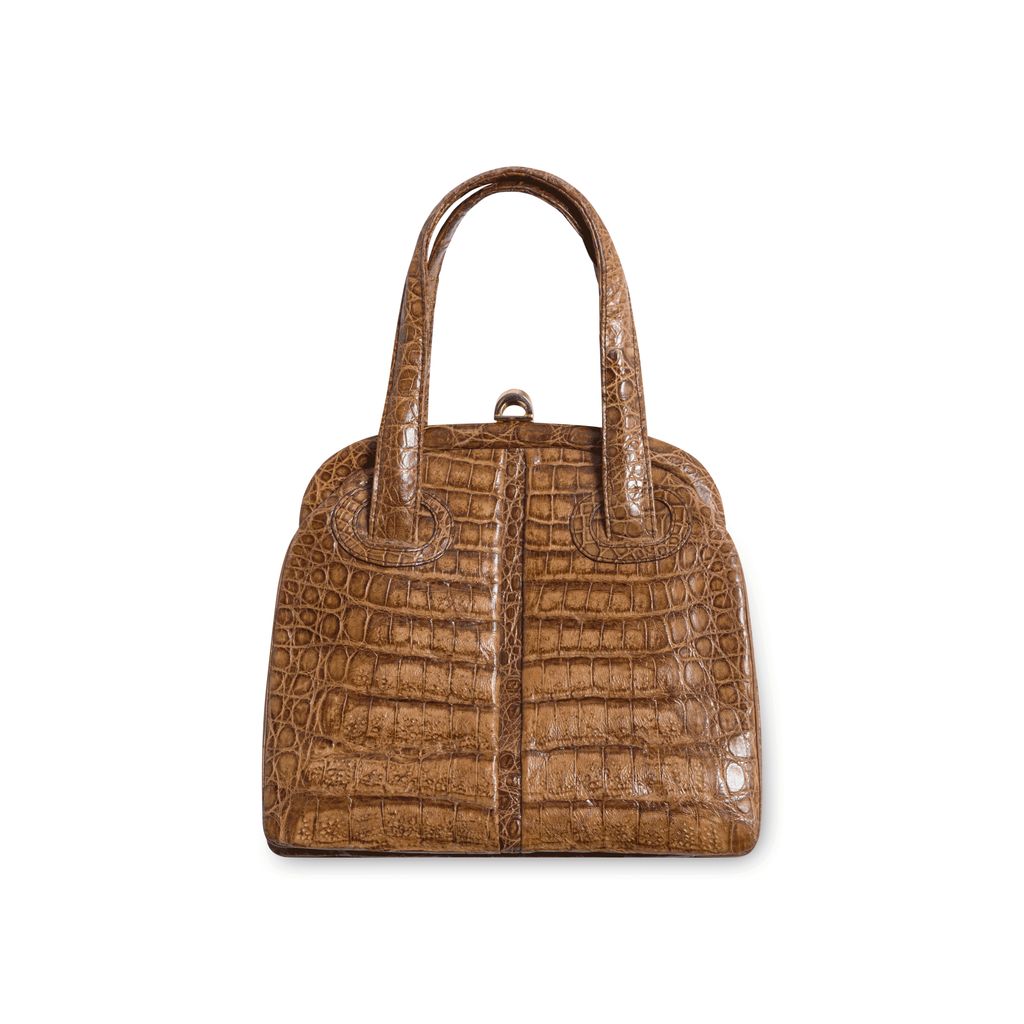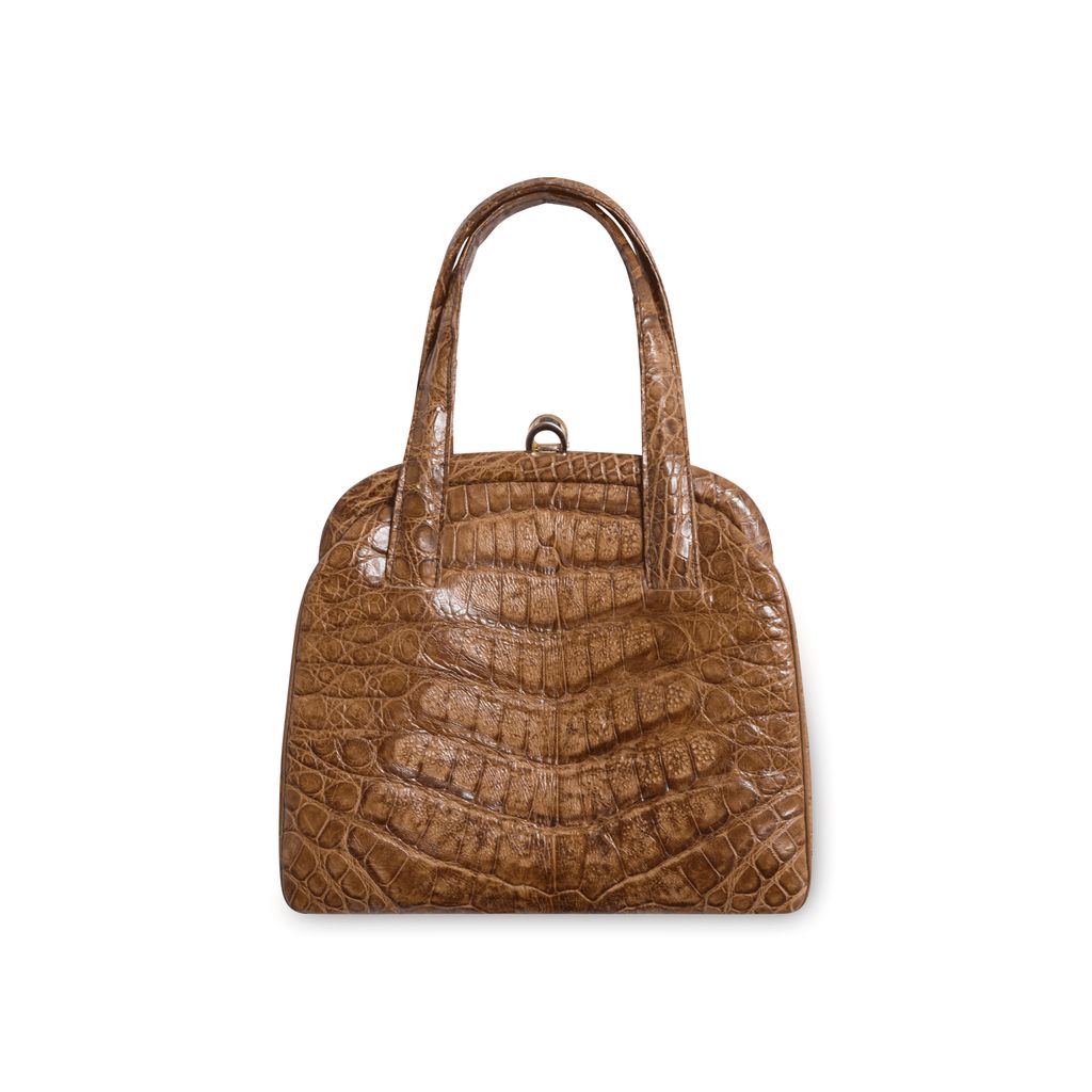Brown snakeskin bag with one major large pocket held in place by a gold-plated clasp.