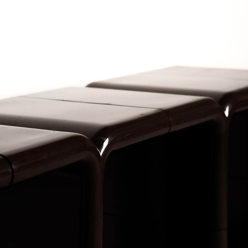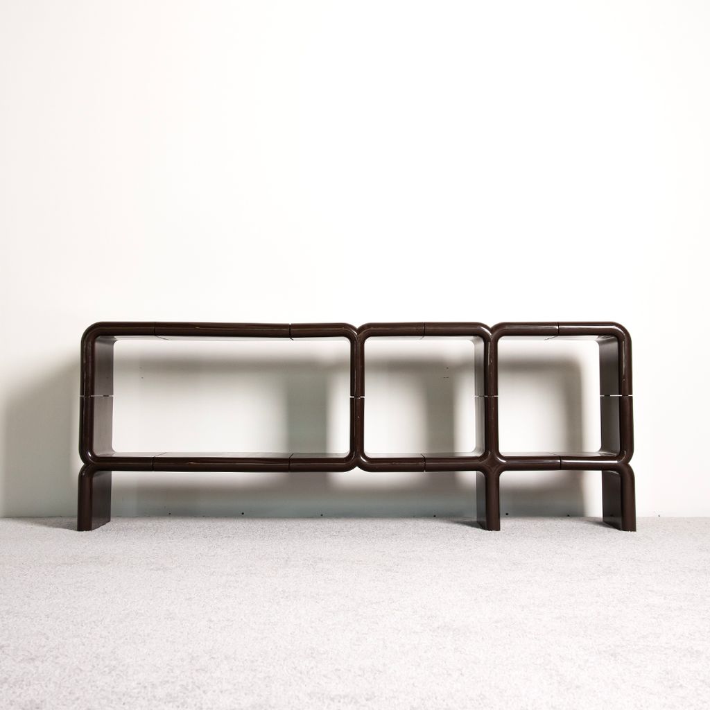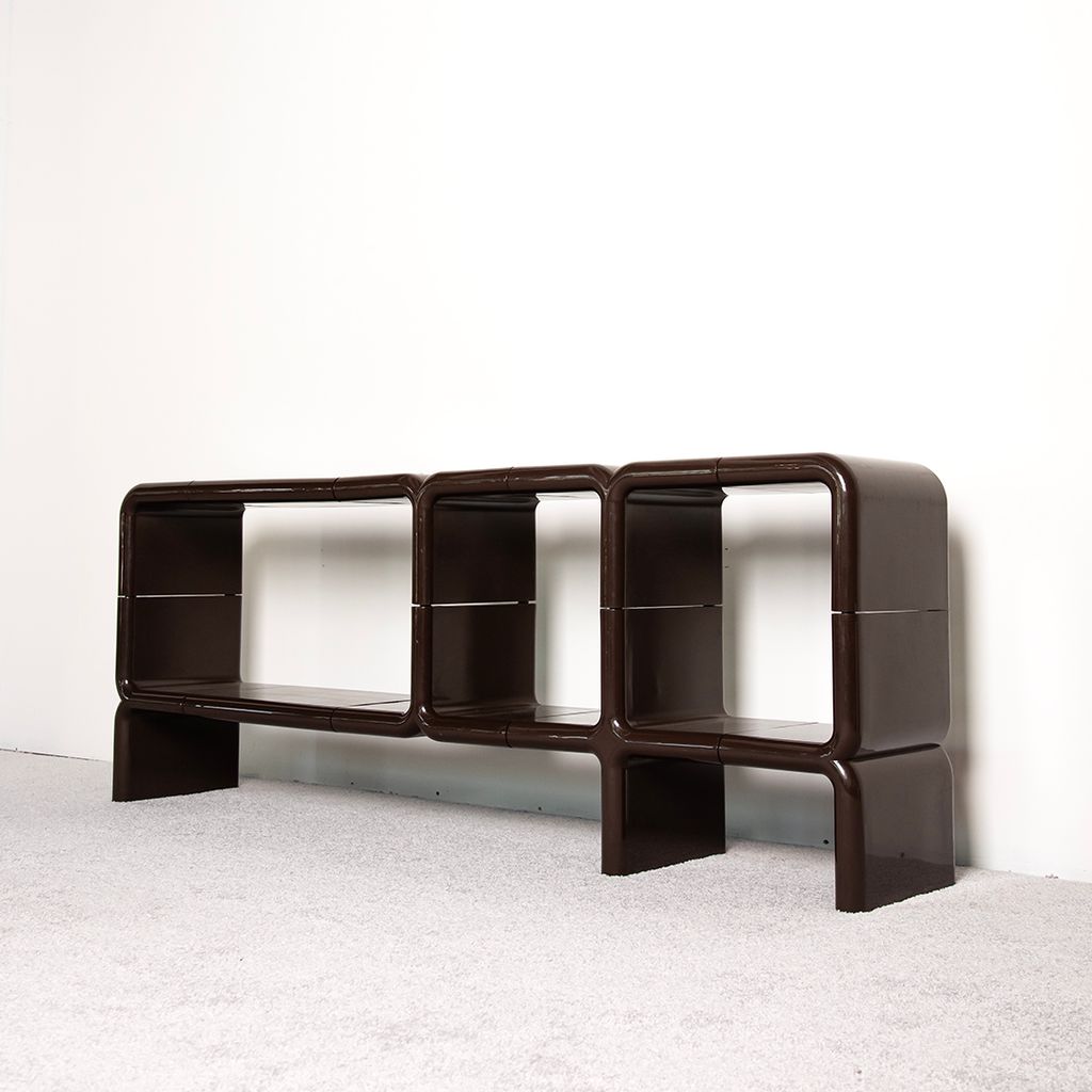 The Umbo shelving system was designed by Kay Leroy Ruggles and produced by Directional in 1970. The system is made entirely of ABS plastic and comprised of multiple modular pieces that can be reconfigured.