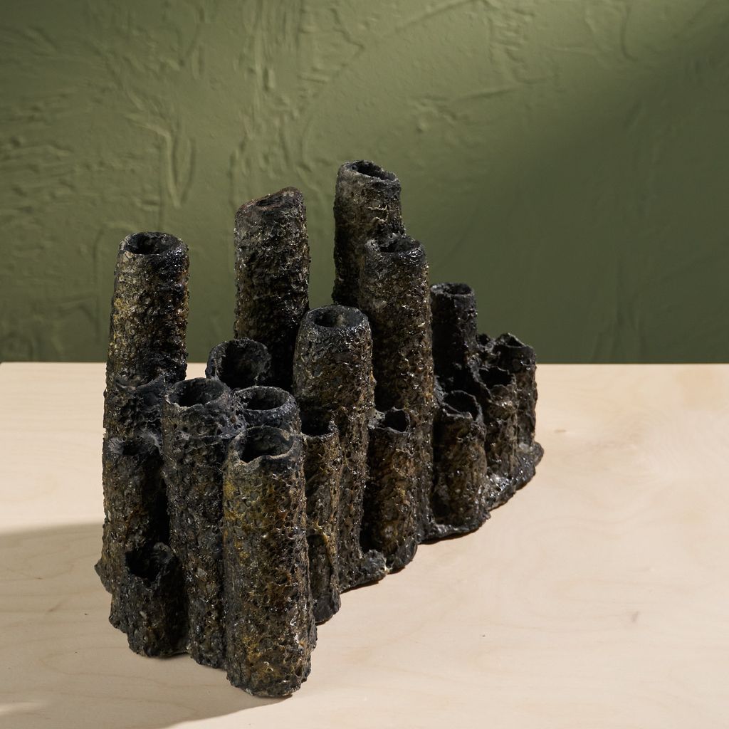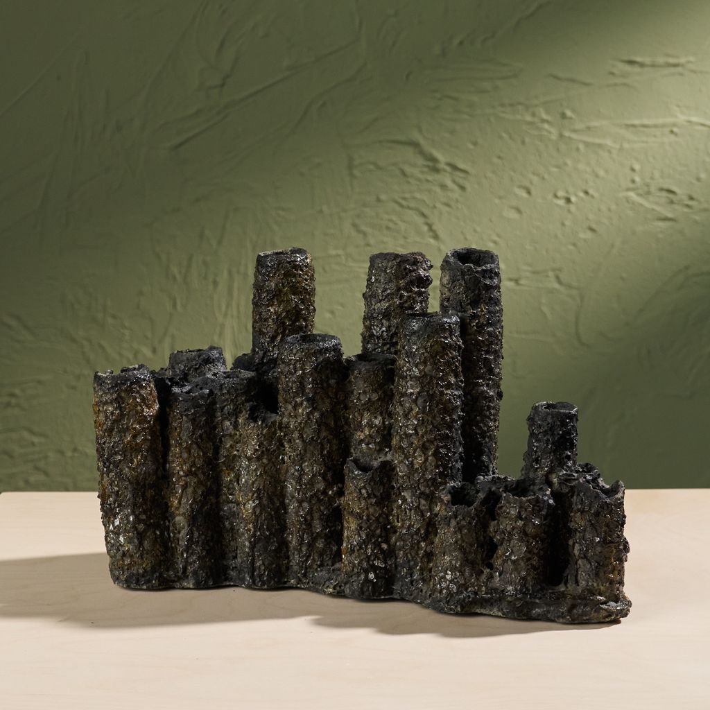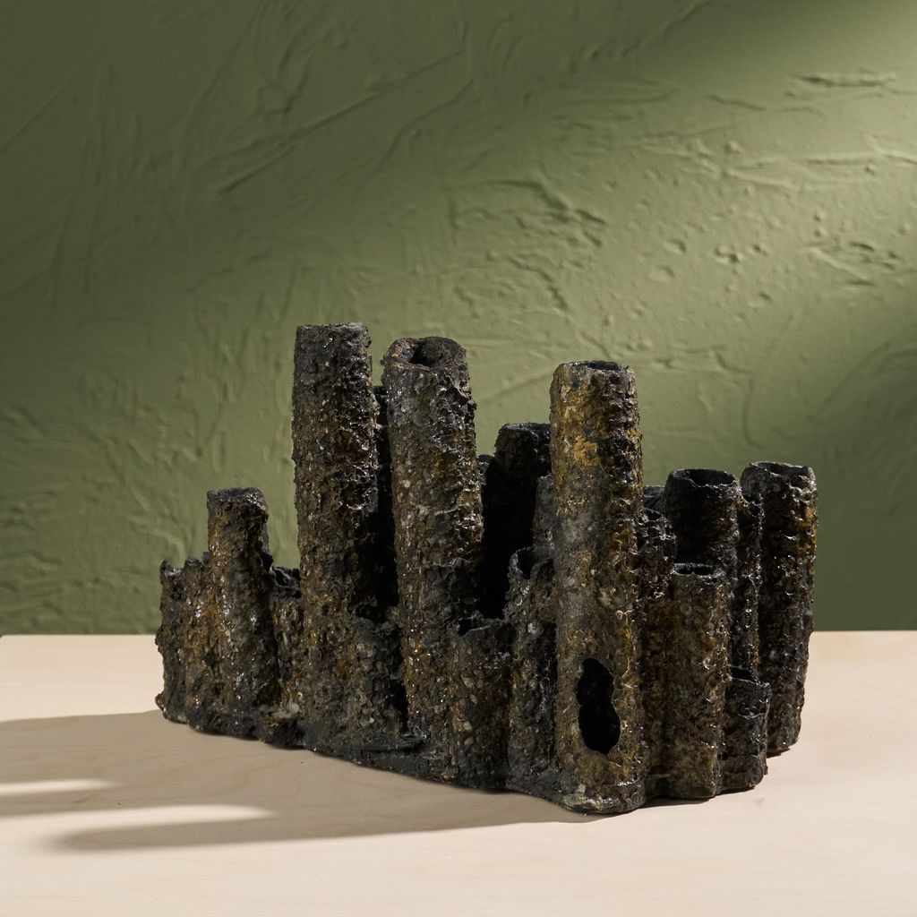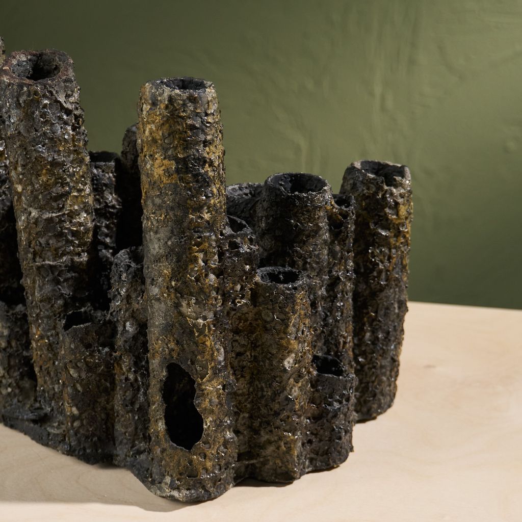 Ceramic object produced by Pia Manu, Belgium, circa 1970s. Sculptural ceramic composition composed of vertically oriented cylindrical forms, emphasizing rhythm, mass, and surface texture. The work reflects the experimental and architectural tendencies within Belgian ceramic practice of the post-war period.