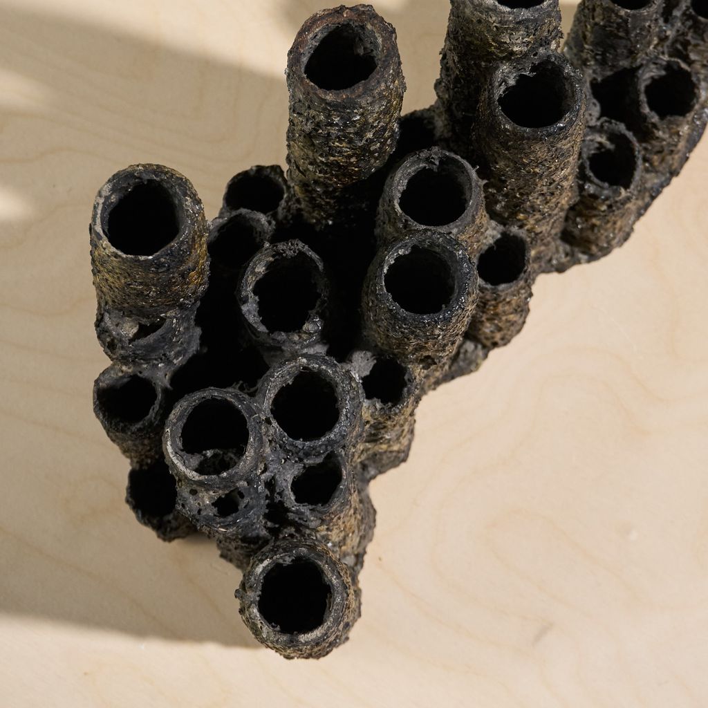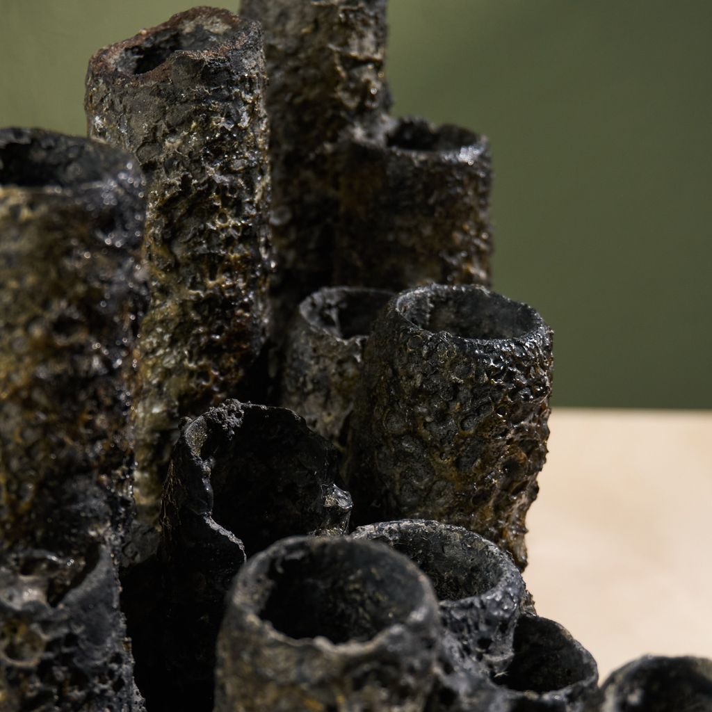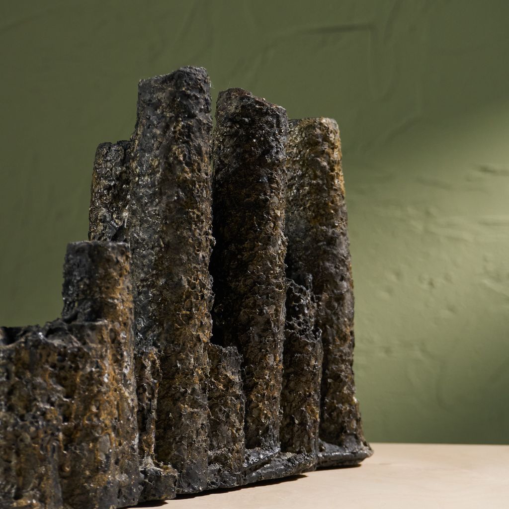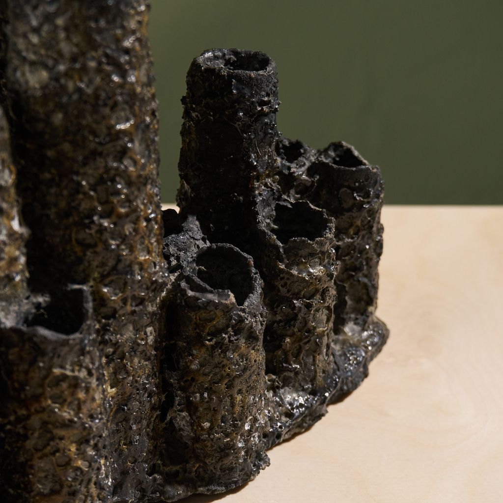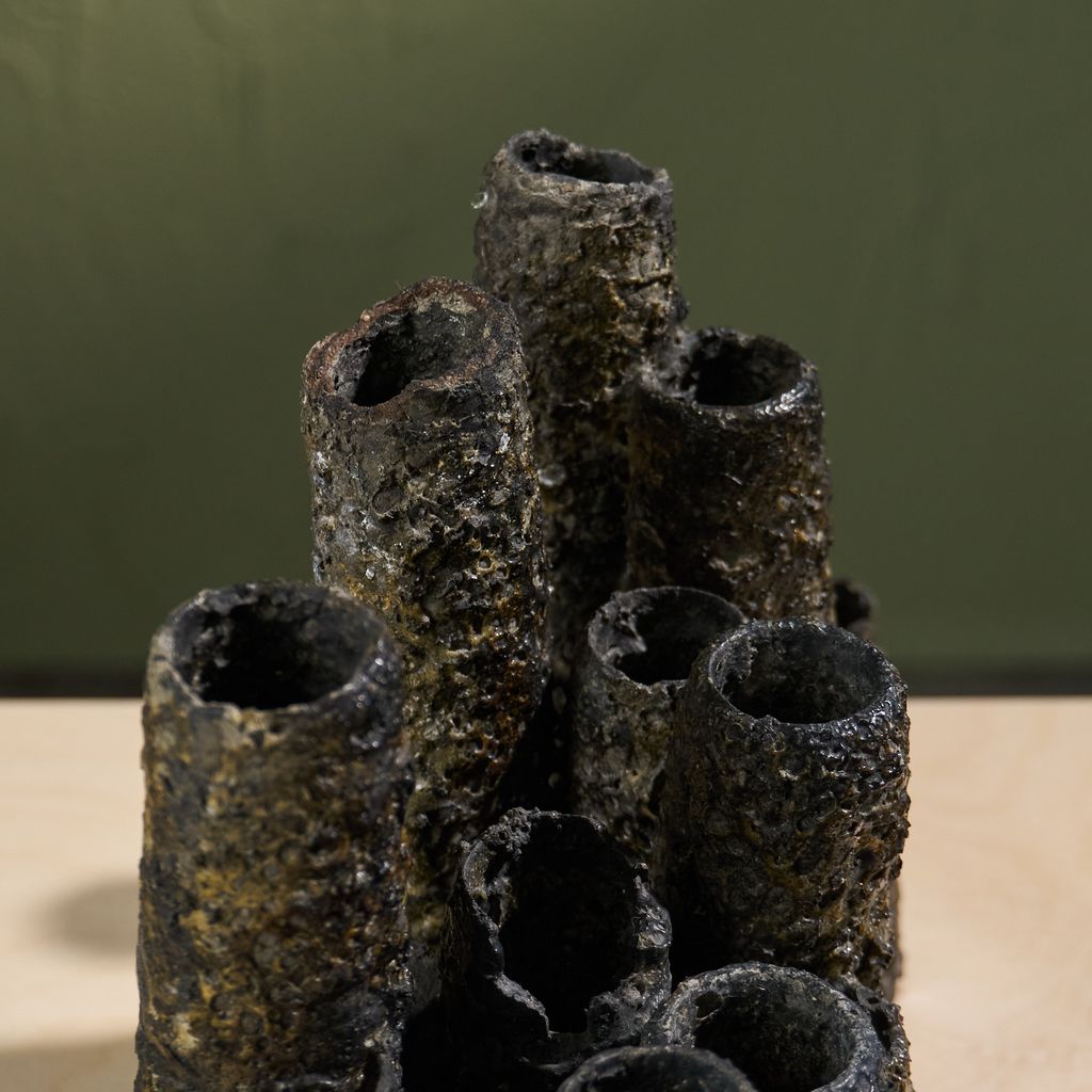 Ceramic object produced by Pia Manu, Belgium, circa 1970s. Sculptural ceramic composition composed of vertically oriented cylindrical forms, emphasizing rhythm, mass, and surface texture. The work reflects the experimental and architectural tendencies within Belgian ceramic practice of the post-war period.
