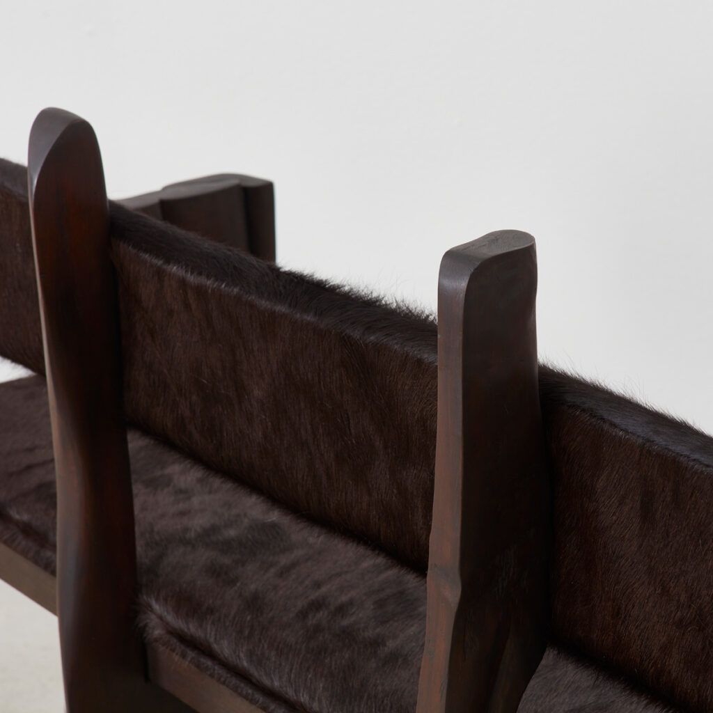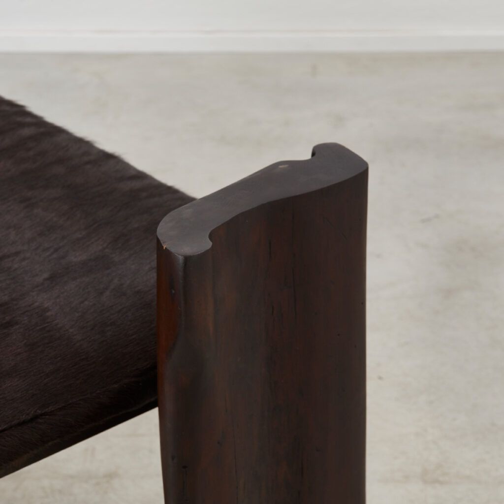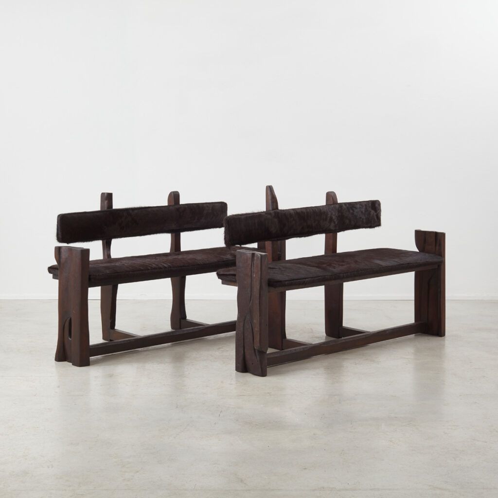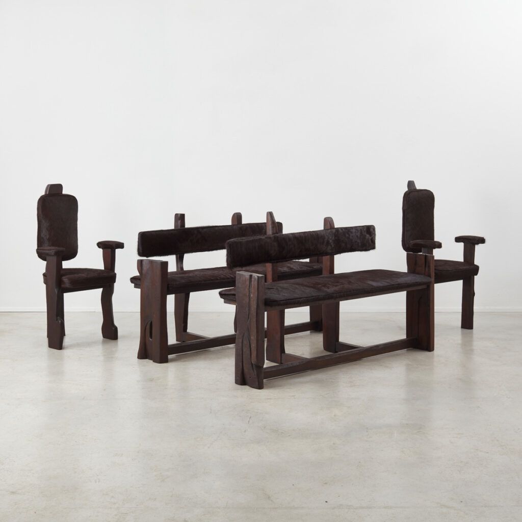 A 1970s French chunky-wood dining seating set, consisting of two benches and two carver chairs in ‘ponyhair’. The construction is rudimentary but incredibly solid, and it expresses a strangely contemporary form. Matches a dark oak refectory table in our collection beautifully.