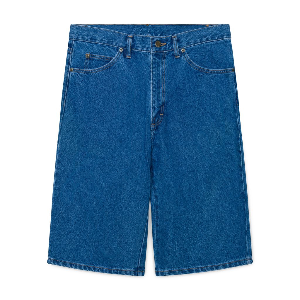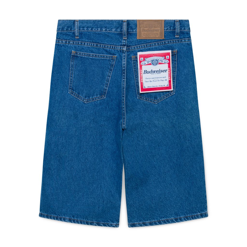 Budweiser Long Jean Shorts features mid rise, mid wash denim, Budweiser logo patch on back.