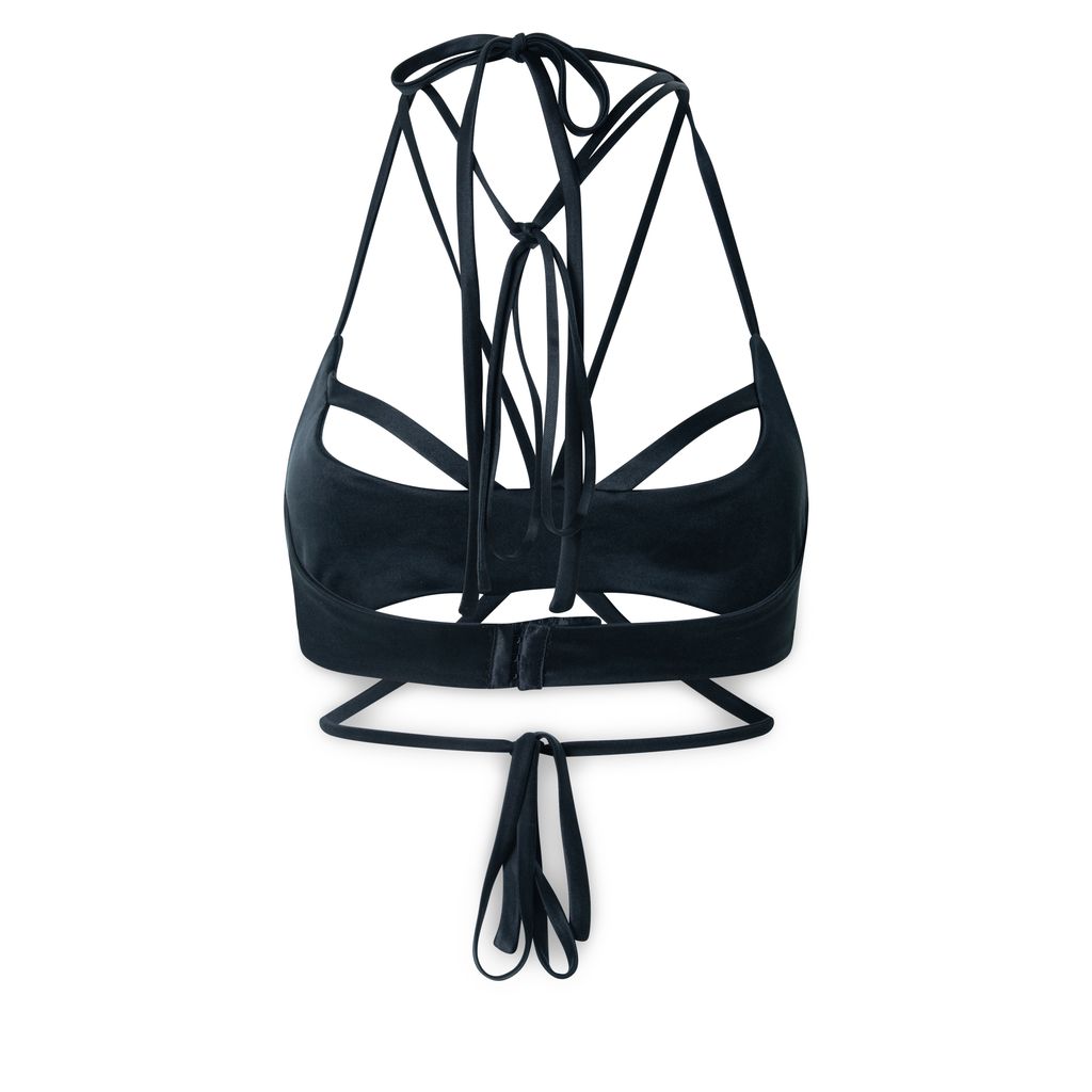 Inspired by the form of a butterfly. A statement bralette designed to be worn on its own or layered under a shirt or blazer. Made in a silky lux fabric, featuring an adjustable hook, eye closure, and strings that tie around the neck and waist.