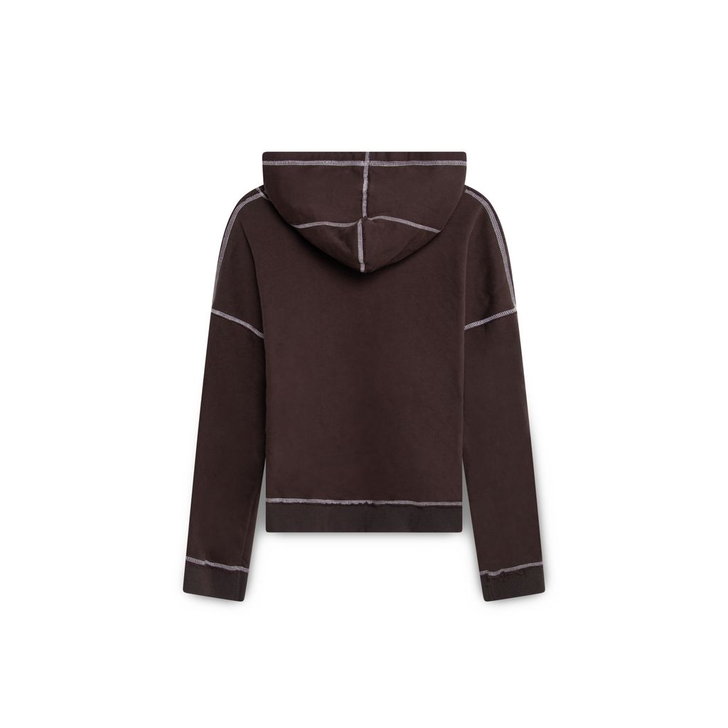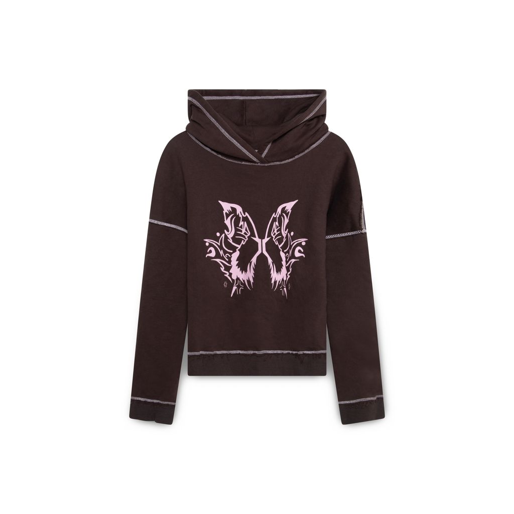 Butterfly Logo Hoodie features pink contrast stitching, slight distressing around seams, and pink butterfly logo graphic on front.