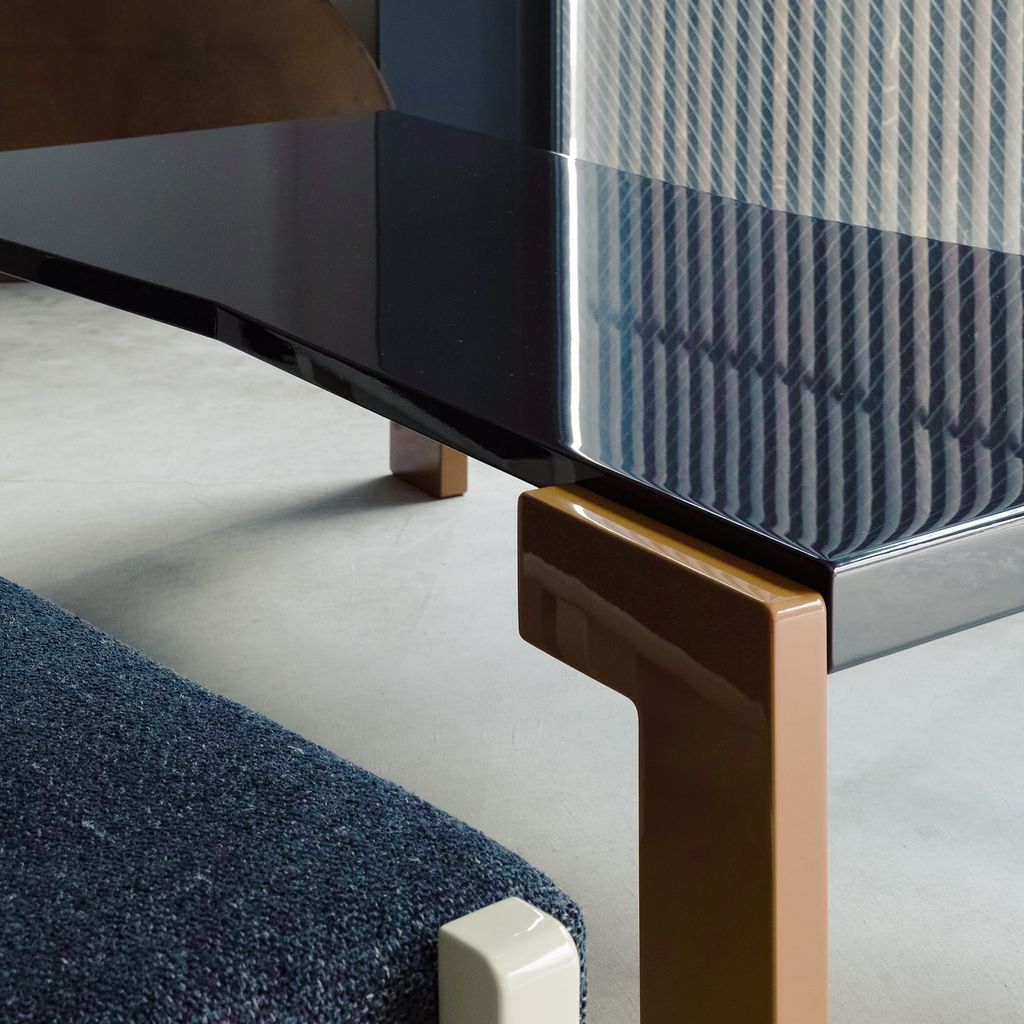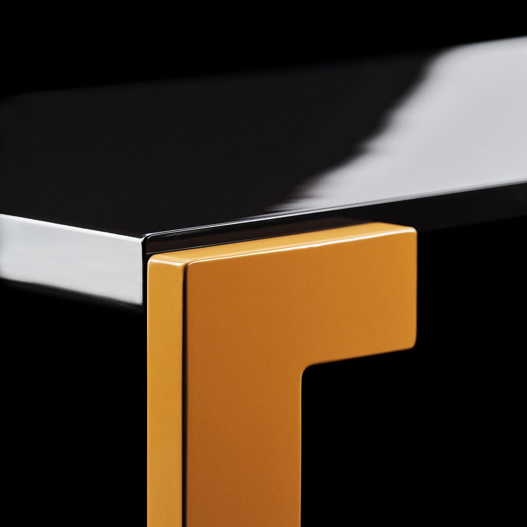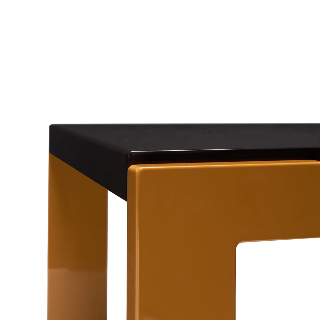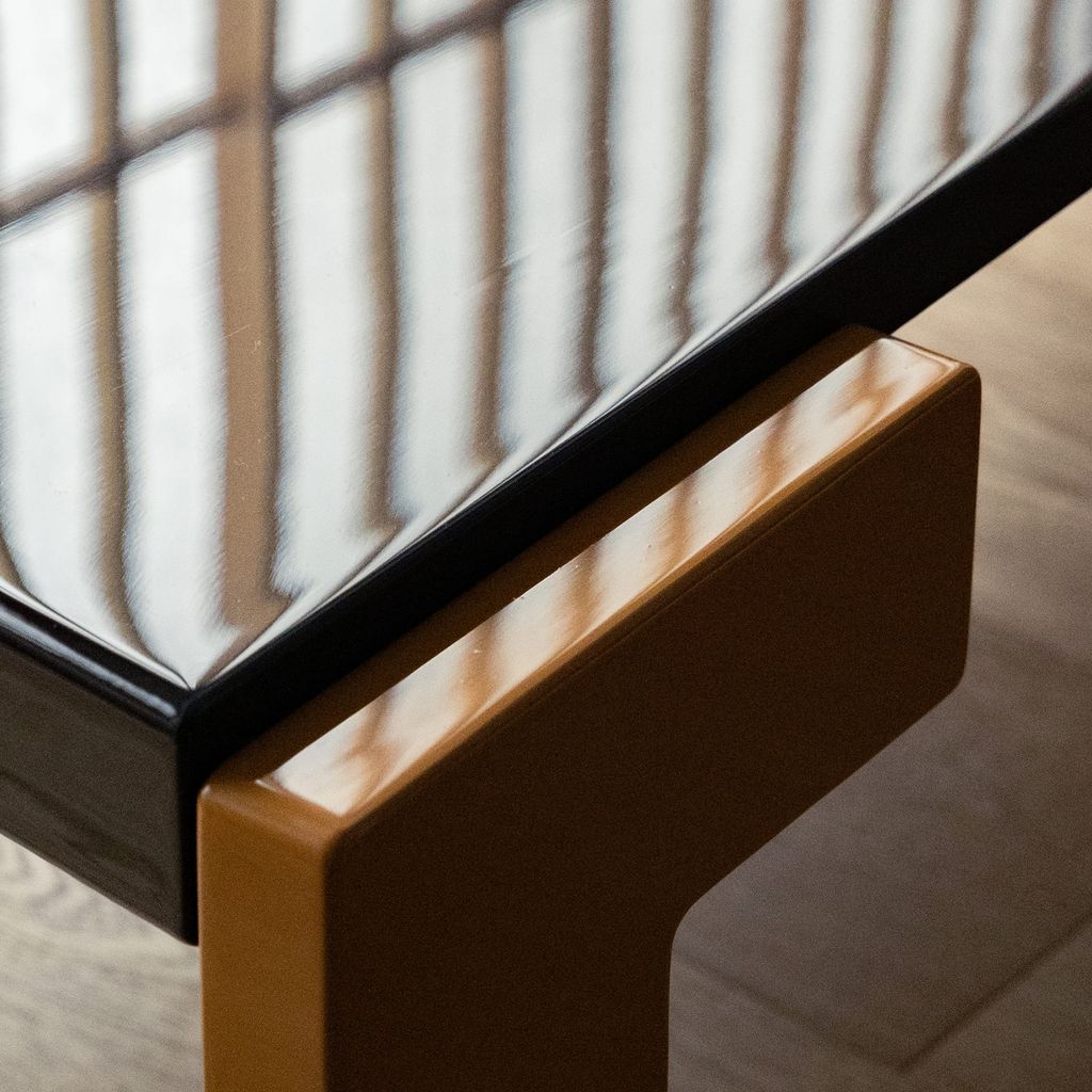 MDF with glossy black top, butterscotch legs, polyester polish finish.
