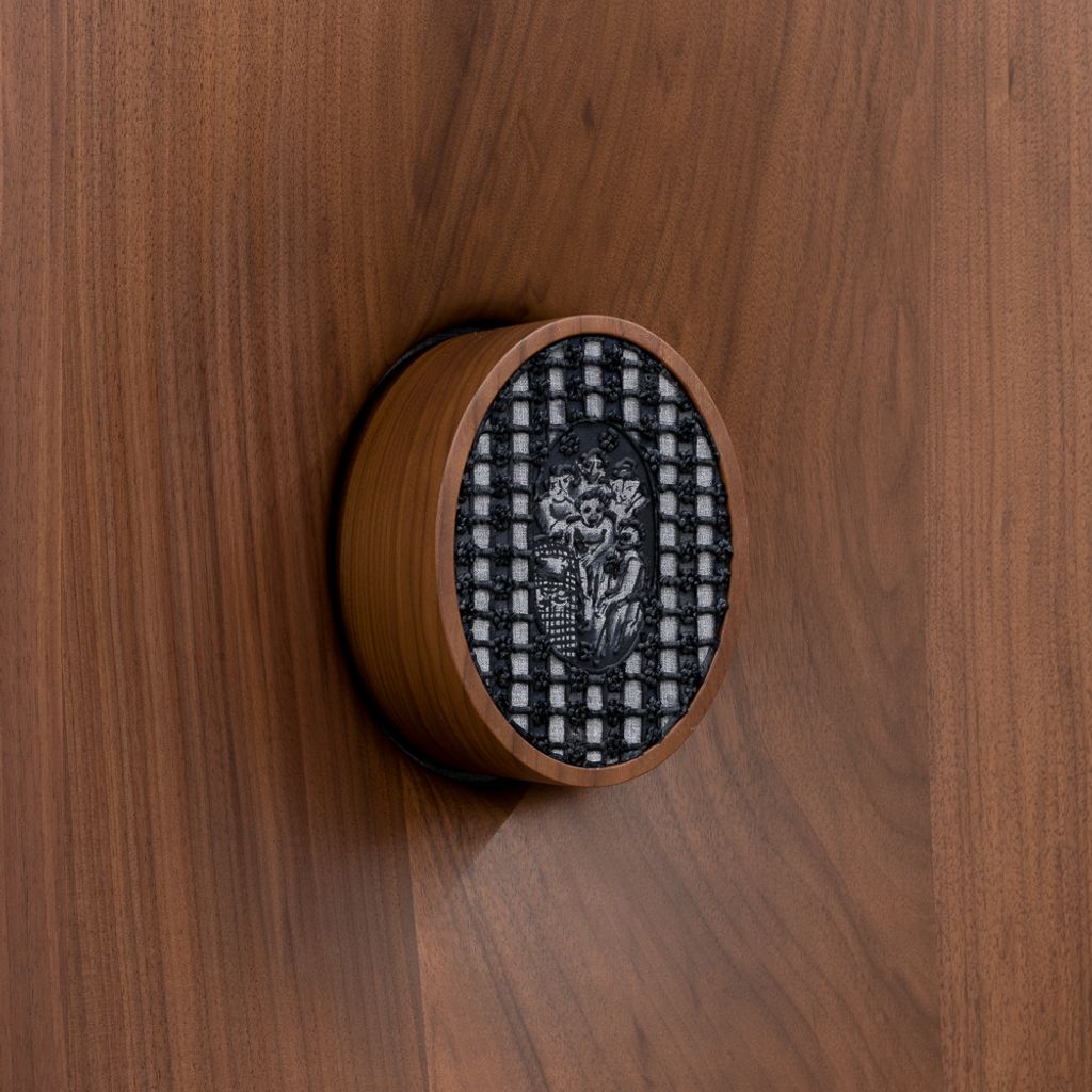 Carved walnut wall sculpture with inset oil painting on upholstery.
