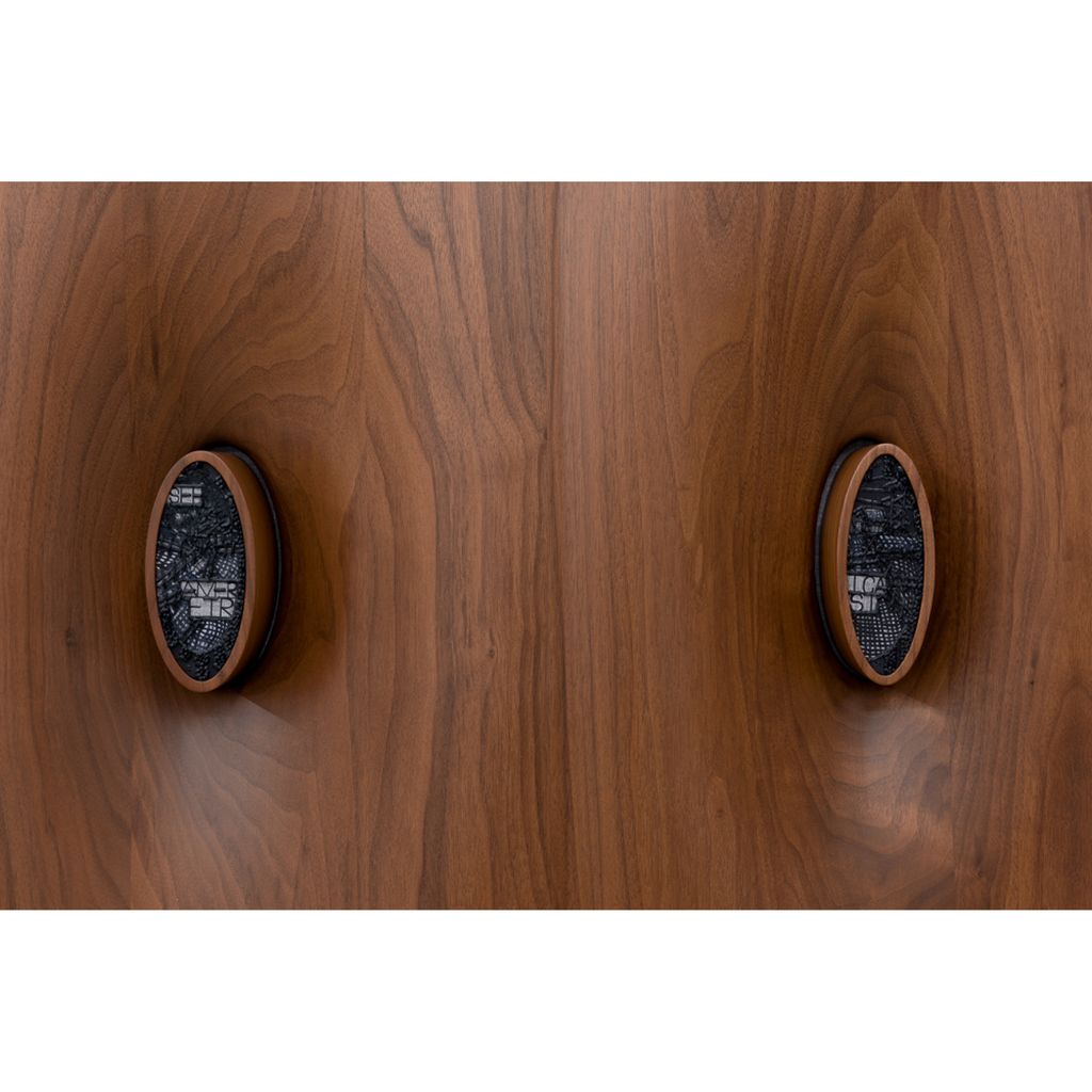 Carved walnut wall sculpture with inset oil painting on upholstery.