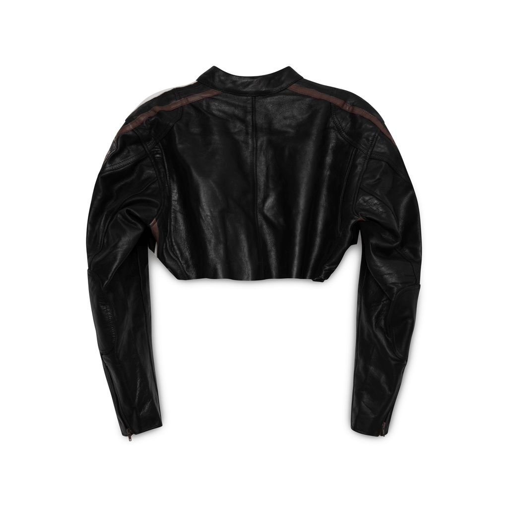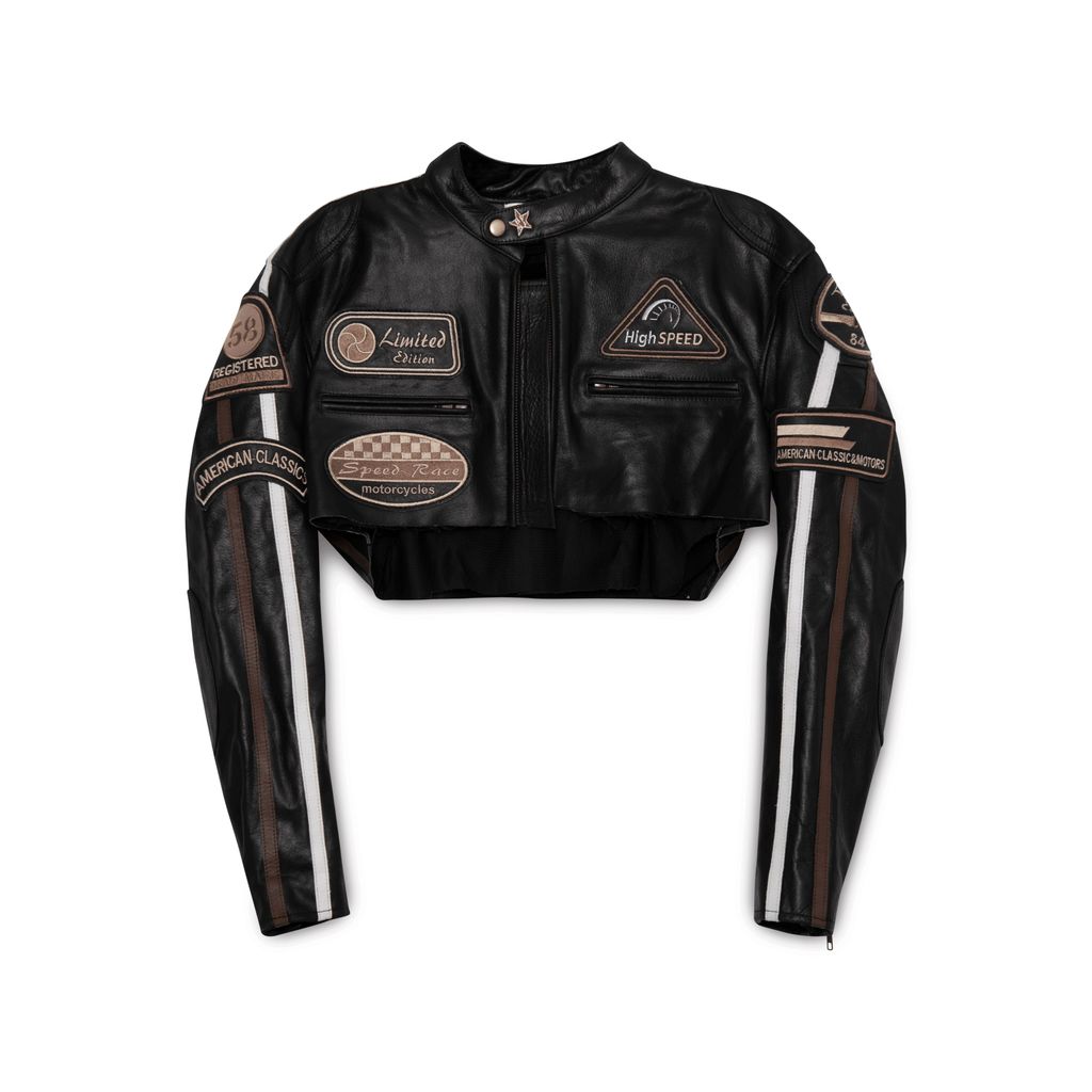 BVNY Black Cropped Leather Motorcycle Jacket features various patchwork detail, zip closure, two chest pockets, adjustable collar.