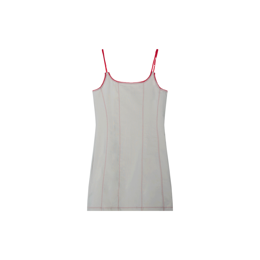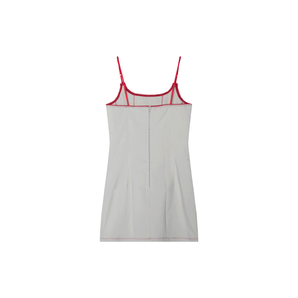 Bwear Tan Mini Dress features red lace trim, red contrast stitching, adjustable spaghetti straps, back zipper, and stretchy material.