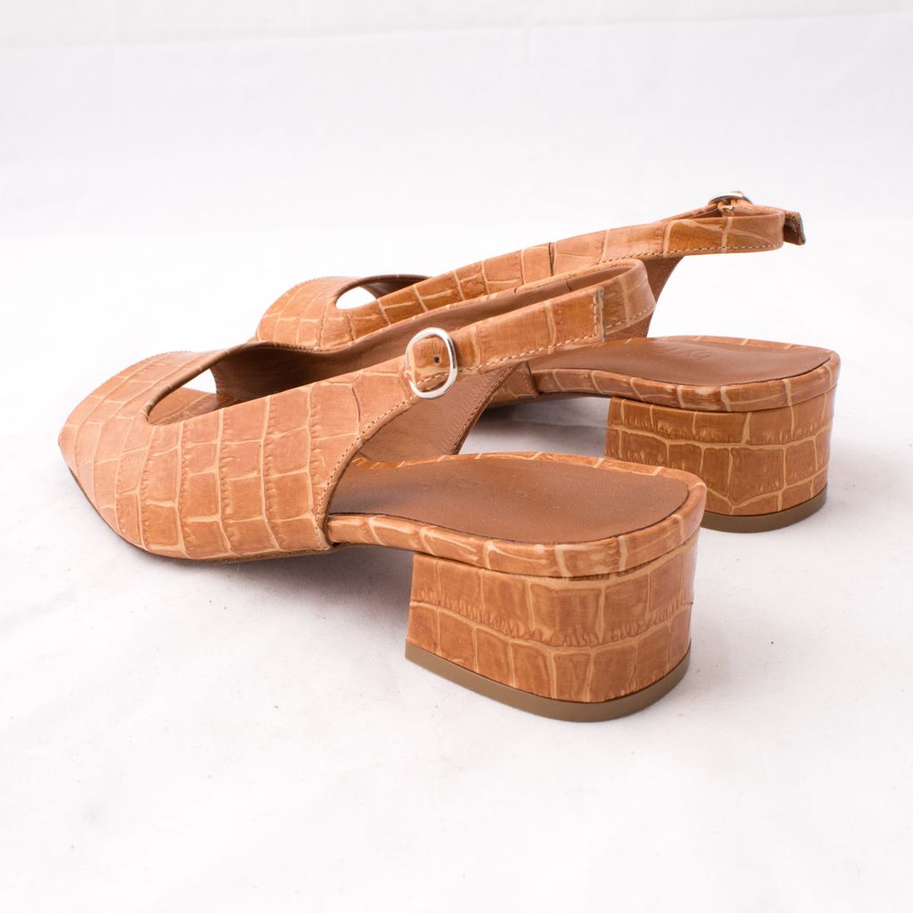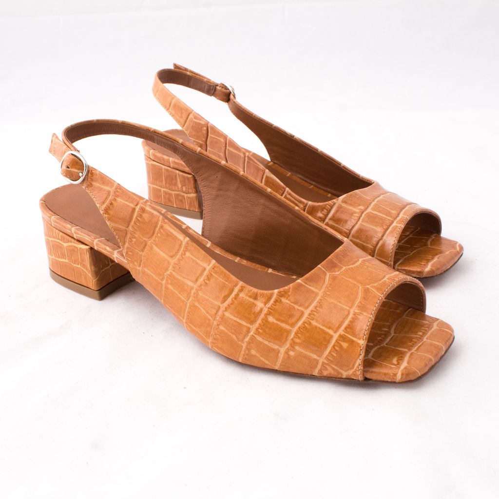 Gently worn Caroline croco sandal from BY FAR. Made from 100% Italian sustainable leather, featuring a hand-crafted and hand-painted leather sole and an 100% polished goatling leather insole.