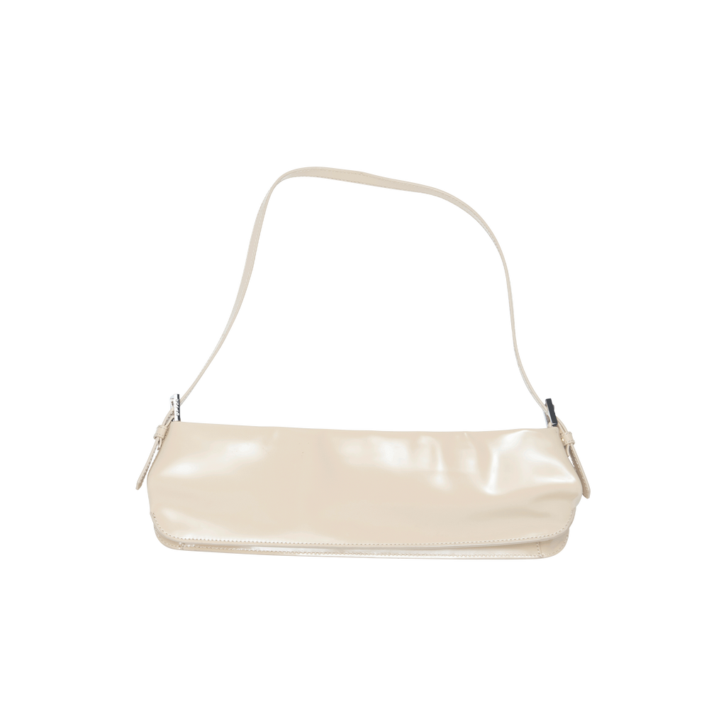 By Far Dulce Long Beige Shoulder Bag features biege patent leather, adjustable shoulder strap, and top zip closure.