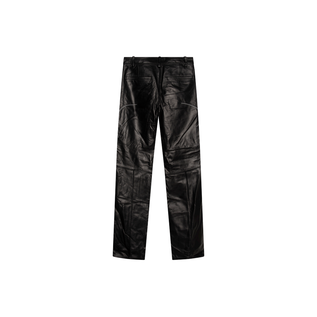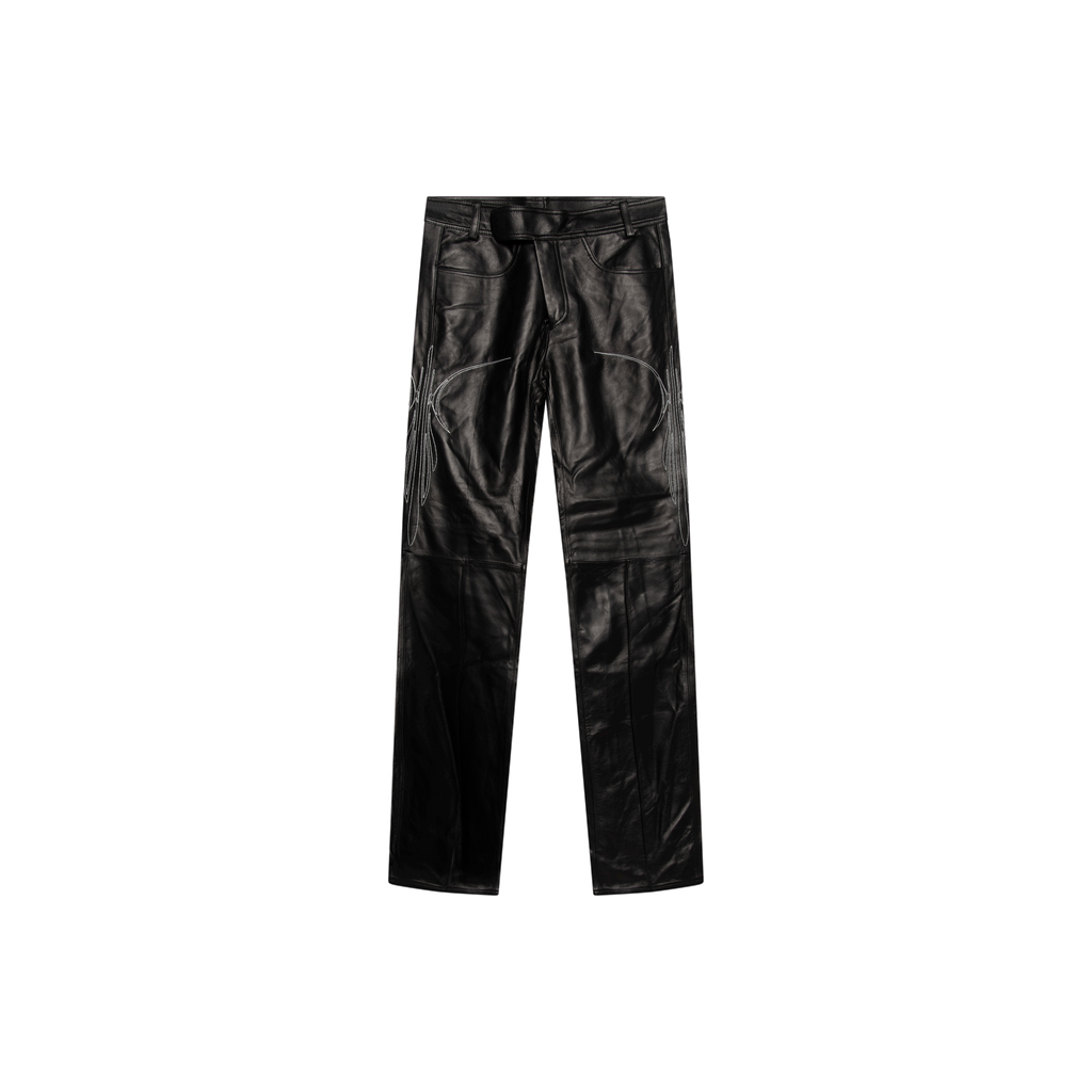 C0D3 Black Leather Flare Pants features black lambskin leather, satin lining, high waist, leg flare detail, velcro strap closure, and signature embroidered detailing.