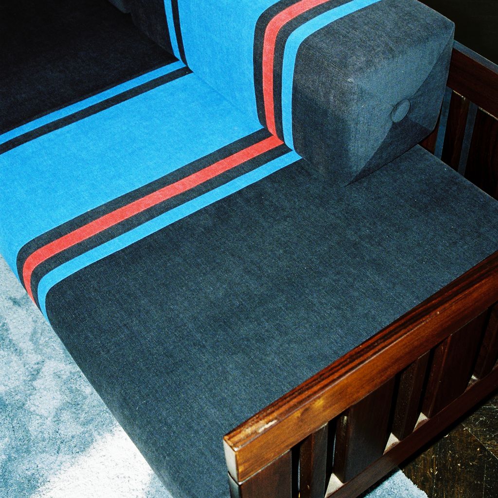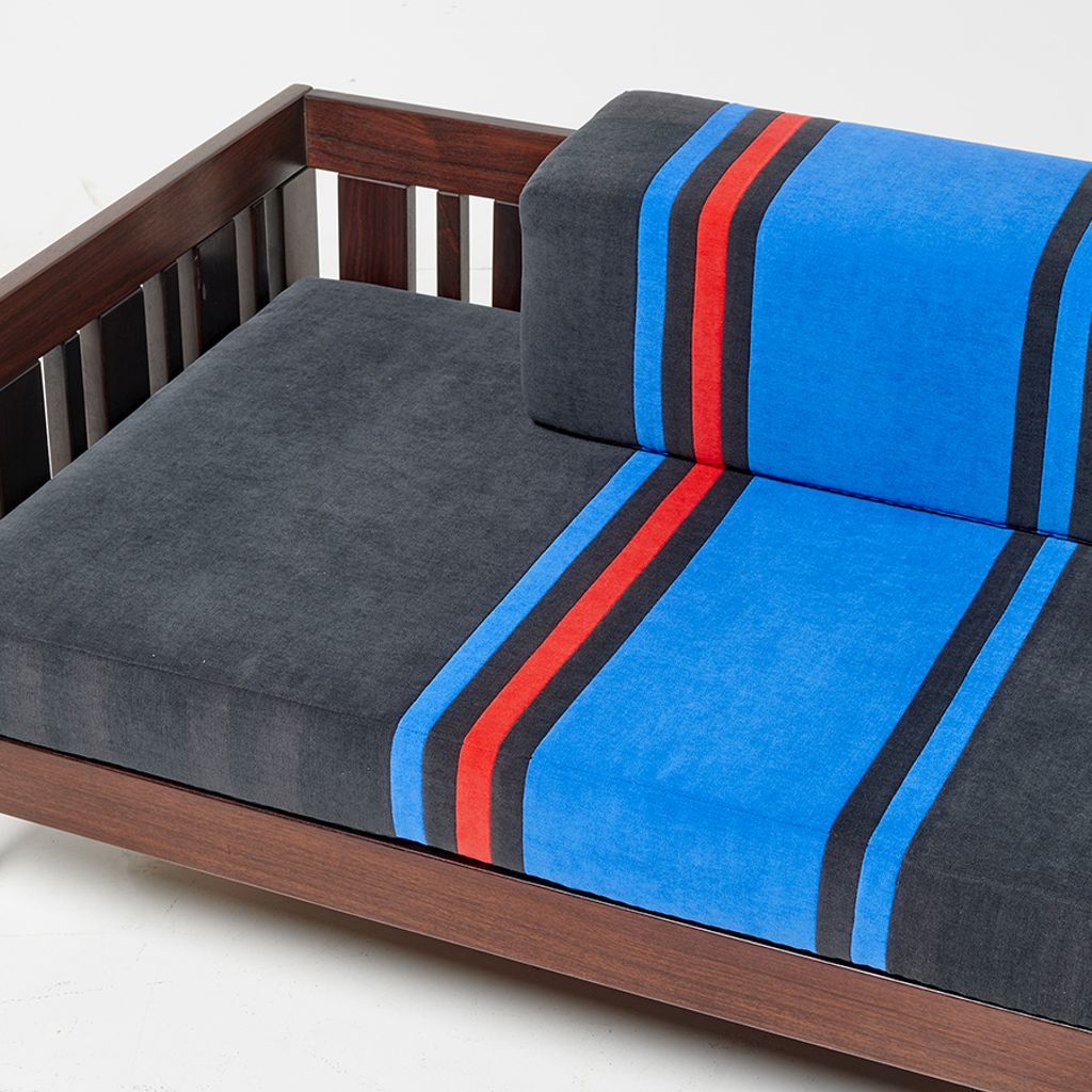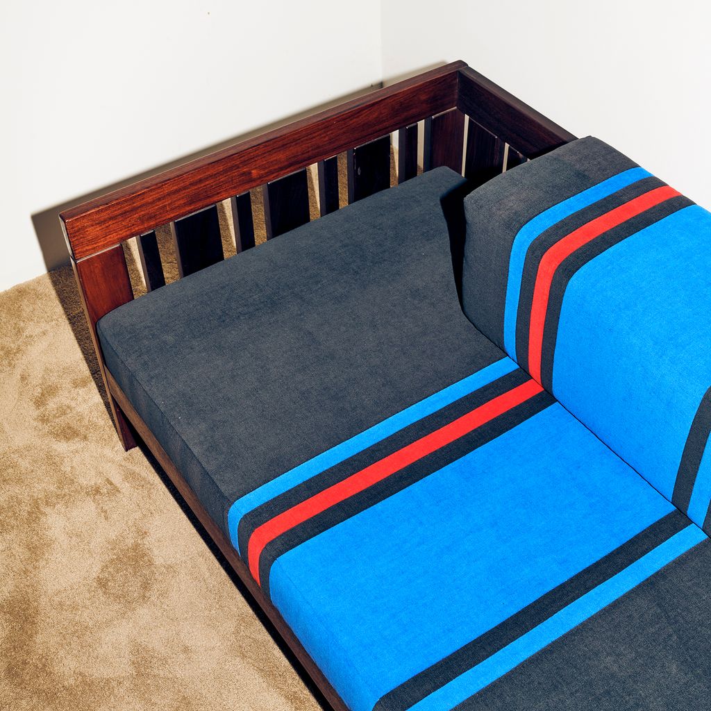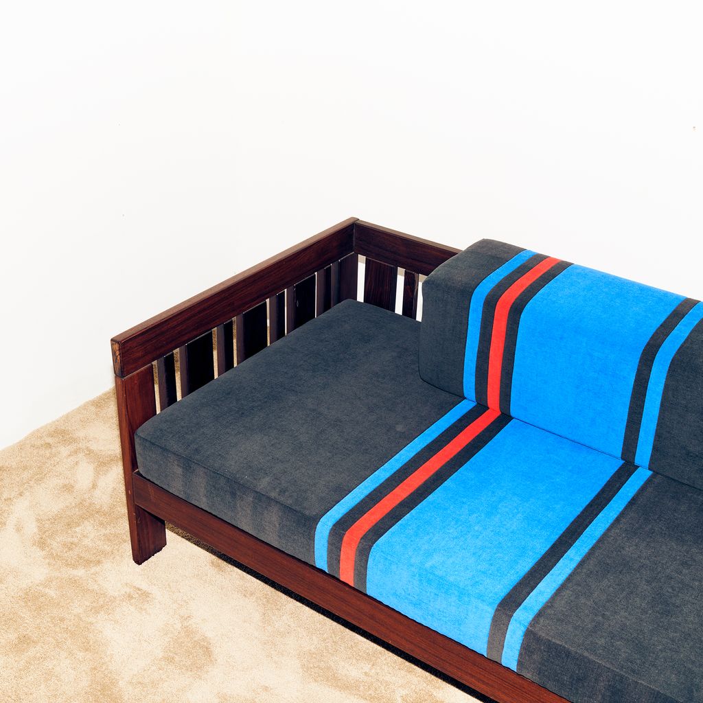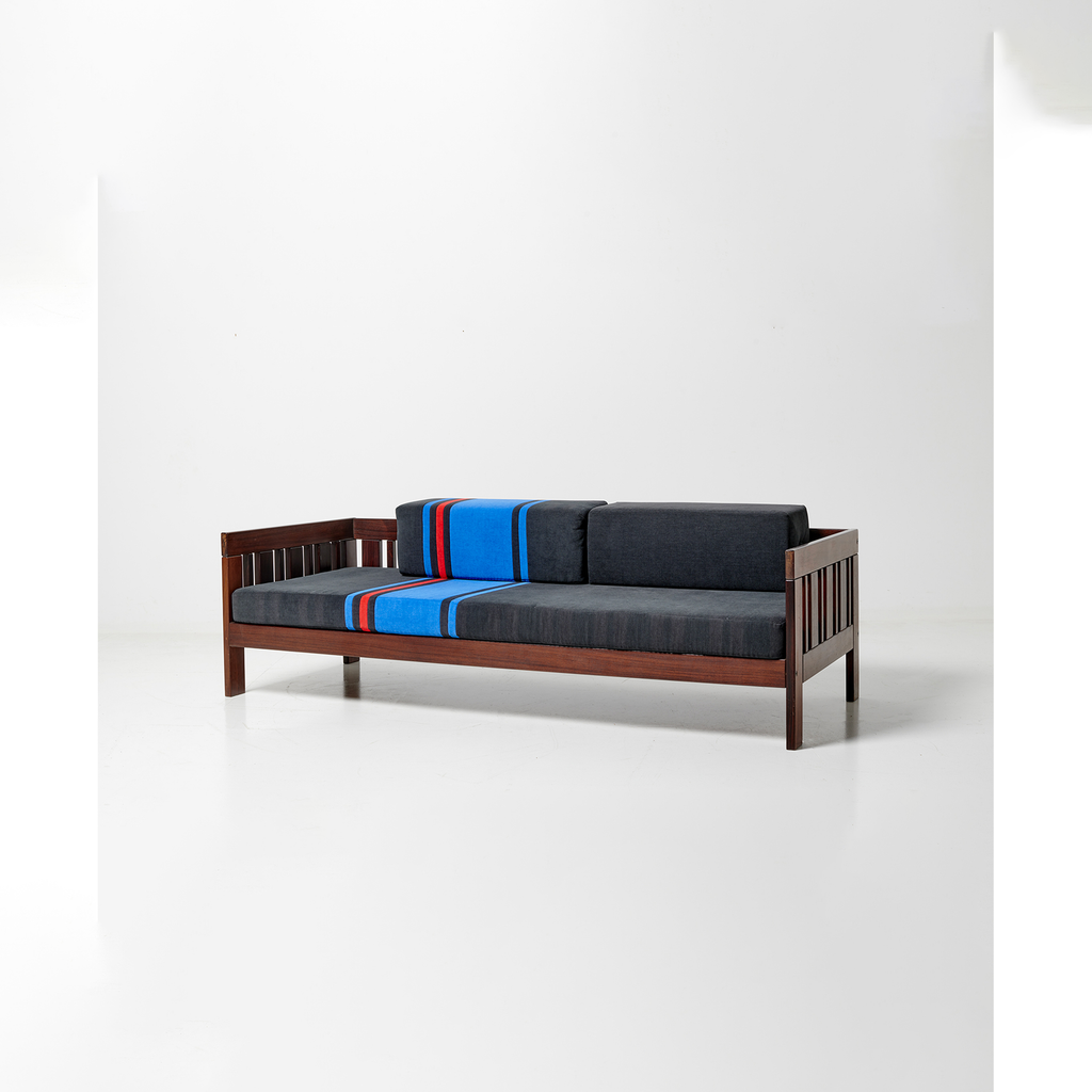 Lacquered rosewood and polyurethane foam cushions covered with original fabric.
