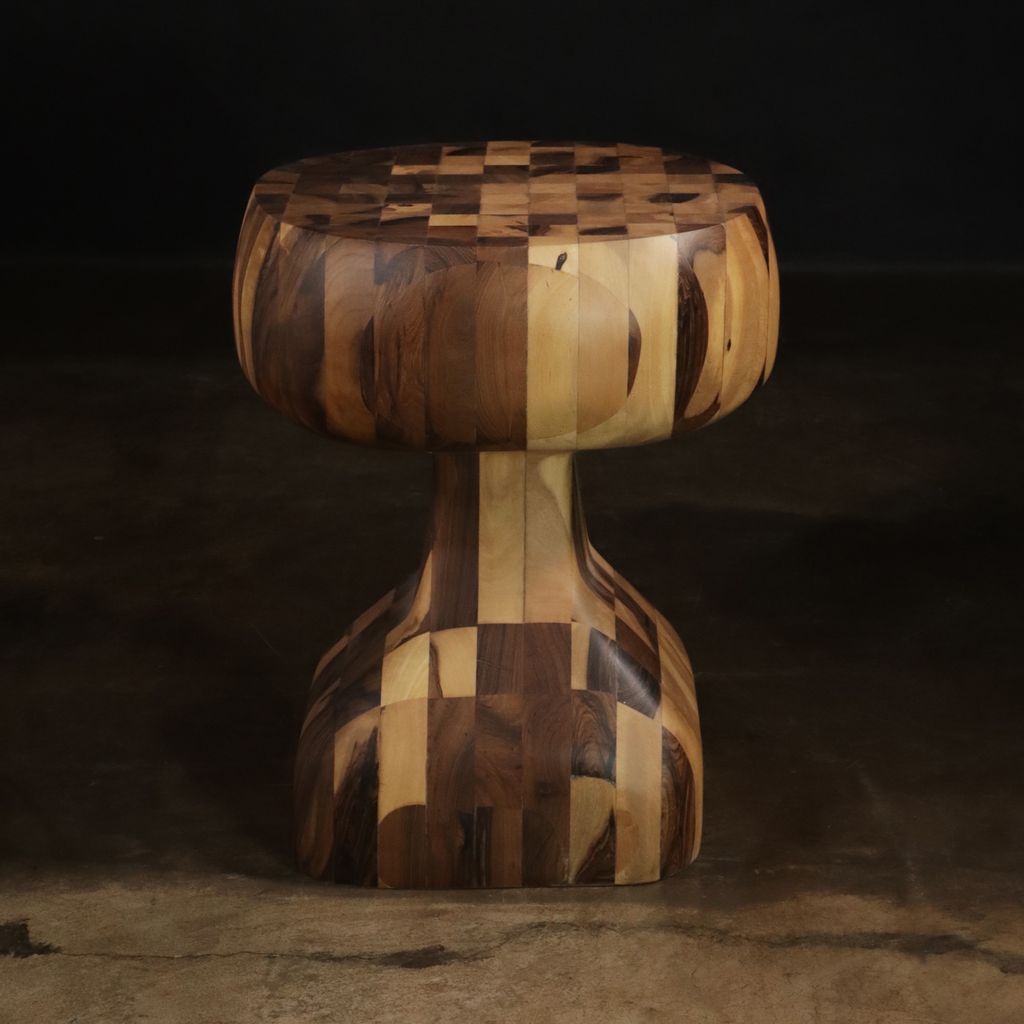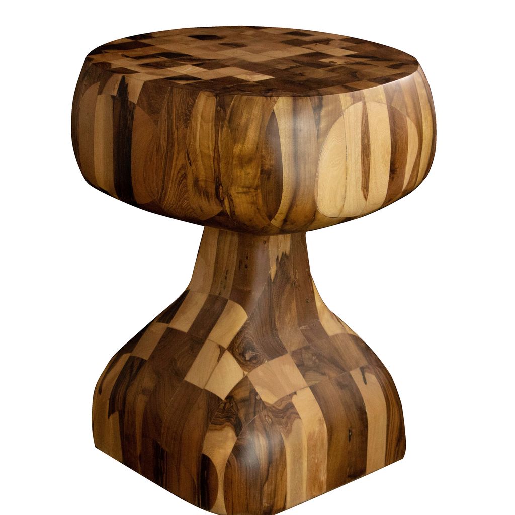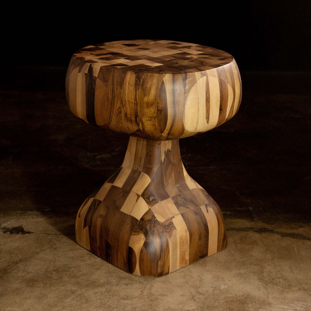 This one-of-a-kind solid wood side table is an experiment from Costantini based on their popular Caliz side table. We glued together dozens of solid pieces of wood, then carved it with a chainsaw, then hand sanded it and lightly finished it to preserve the raw look. Available as shown for immediate delivery or as a custom piece made to your specifications.