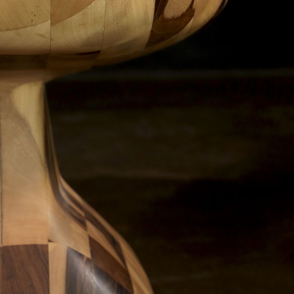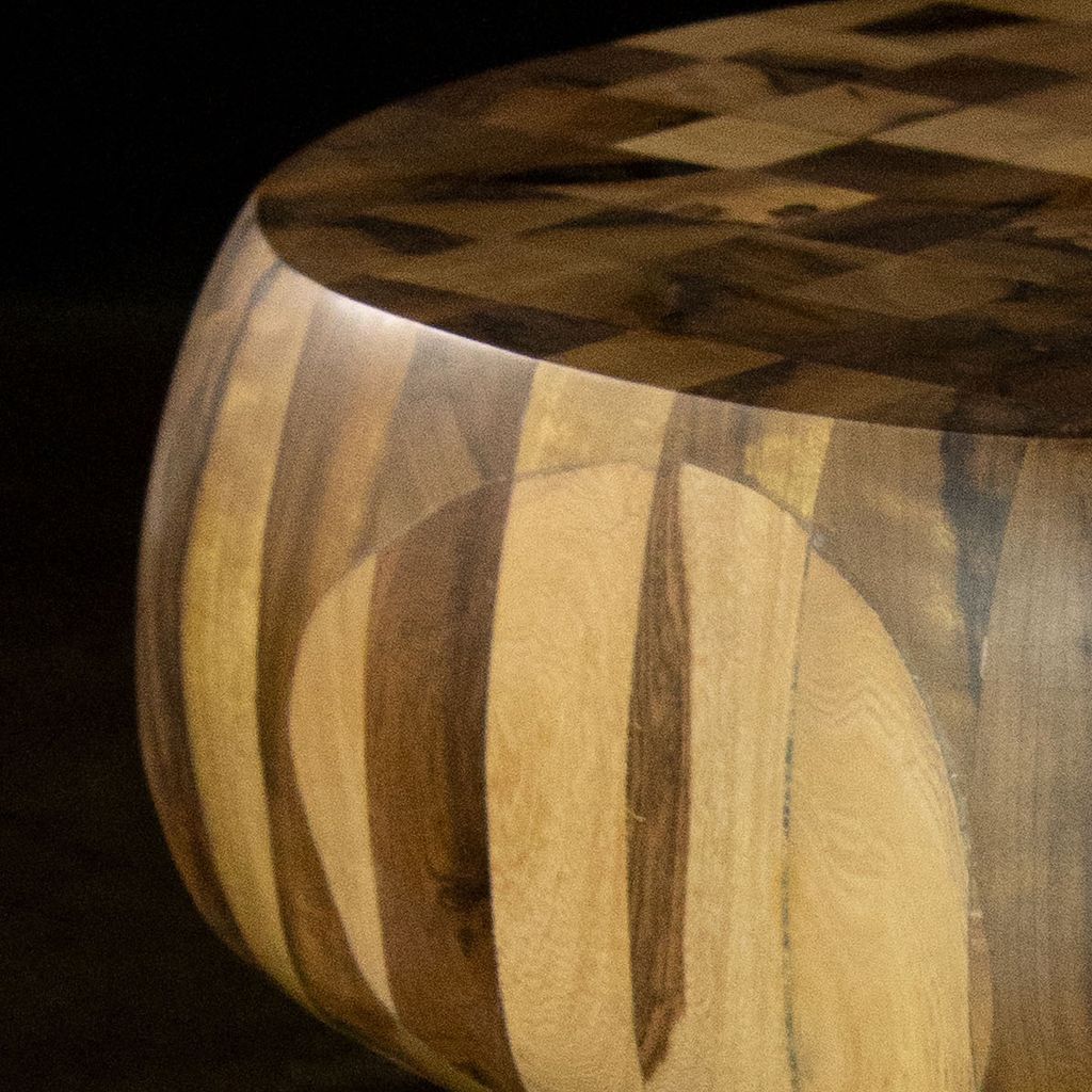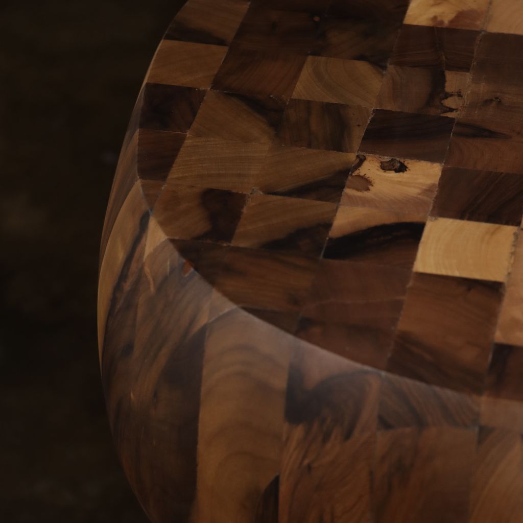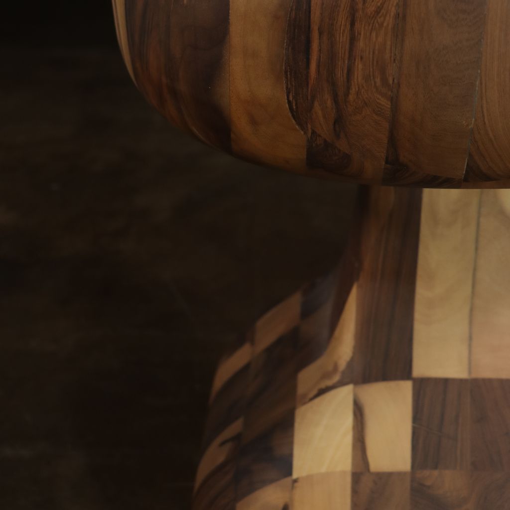 This one-of-a-kind solid wood side table is an experiment from Costantini based on their popular Caliz side table. We glued together dozens of solid pieces of wood, then carved it with a chainsaw, then hand sanded it and lightly finished it to preserve the raw look. Available as shown for immediate delivery or as a custom piece made to your specifications.