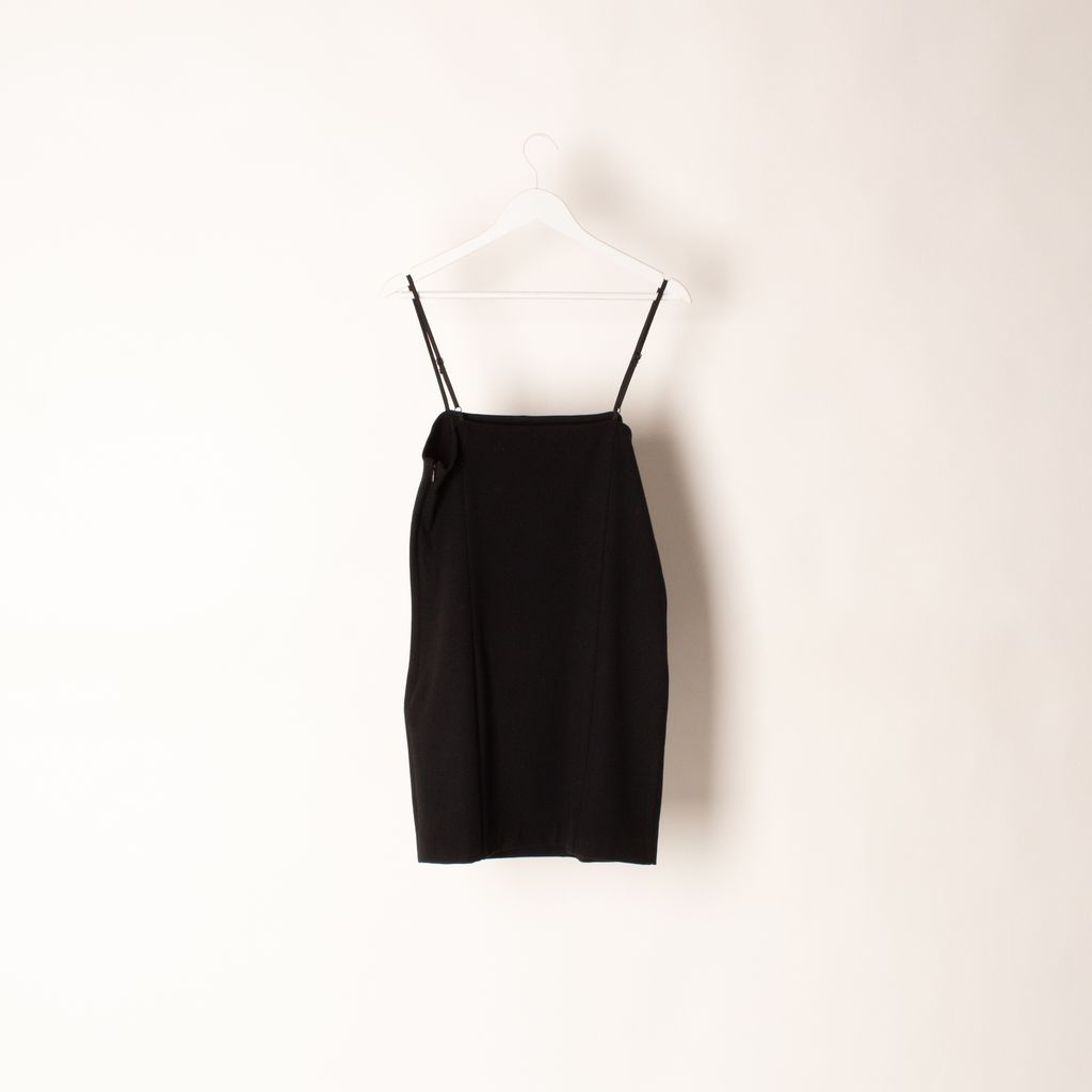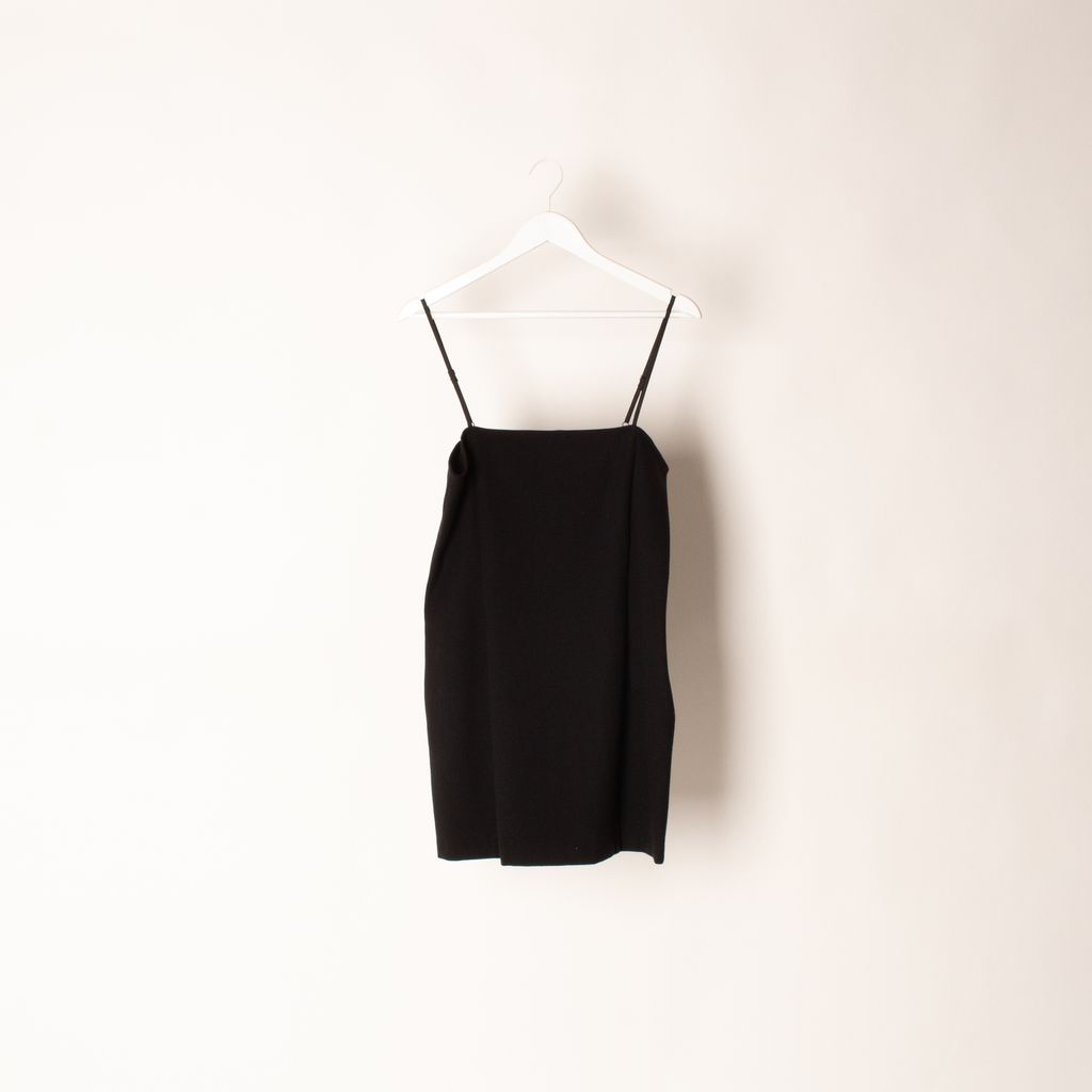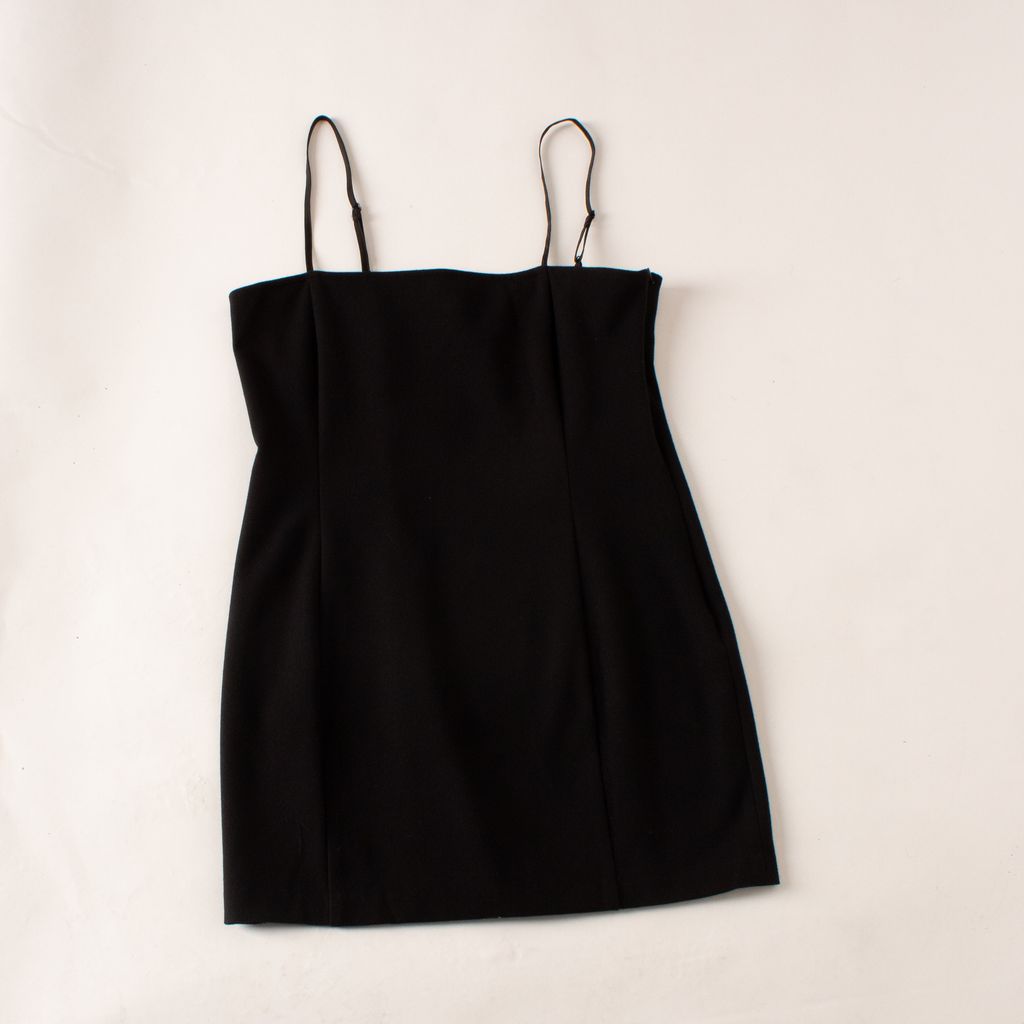 This 90s-inspired cami style mini dress from Callipygian features stretch fabric for comfortable wear, square neckline, adjustable skinny straps, has a hidden zip closure, and has a mini silhouette. In good condition.