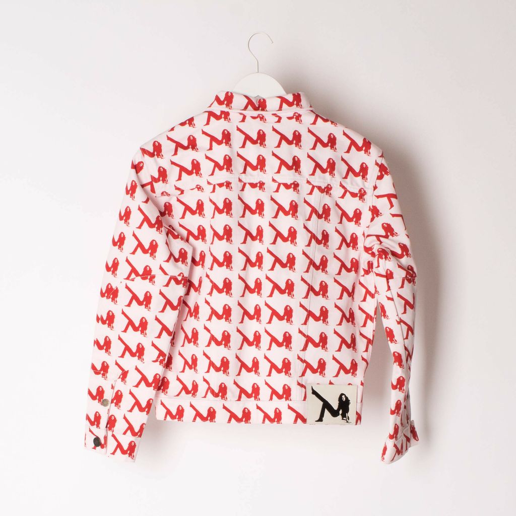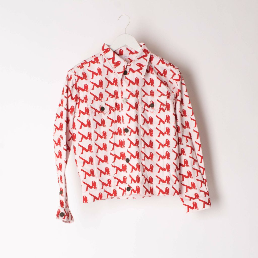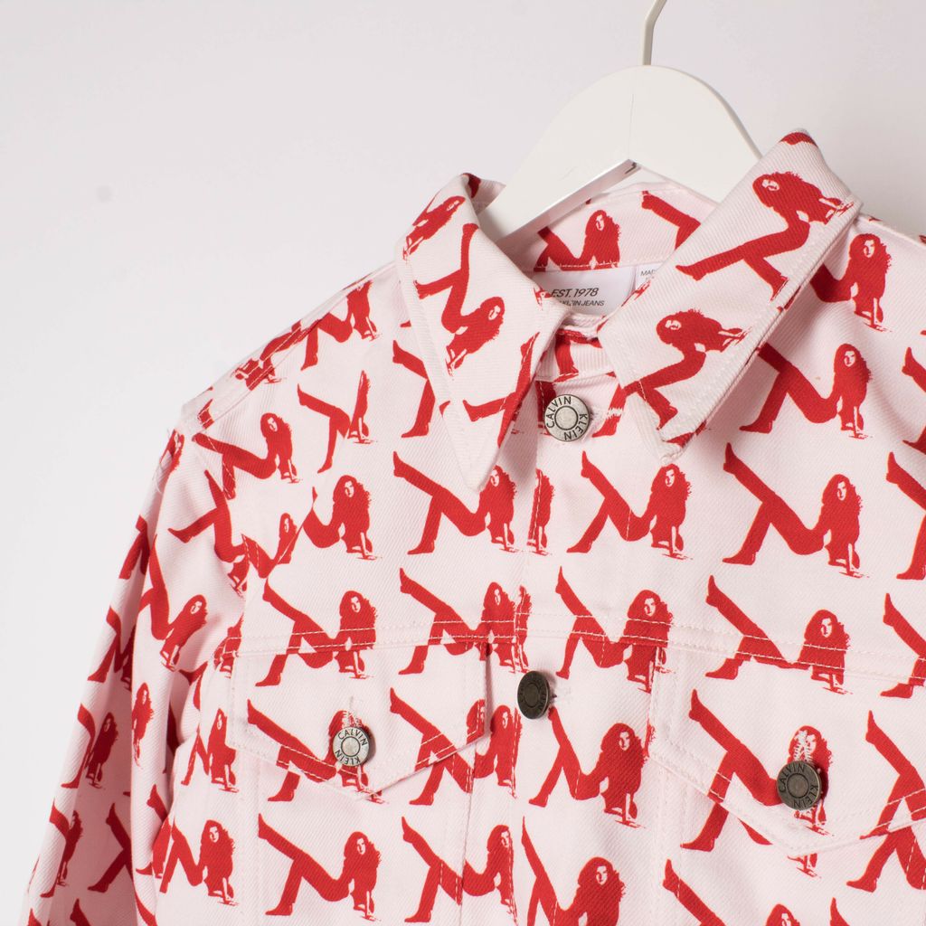 Brand new with tags, trucker jacket from Calvin Klein. Features all-over print, point collar, button cuffs, dual chest pockets and heavy seaming details.