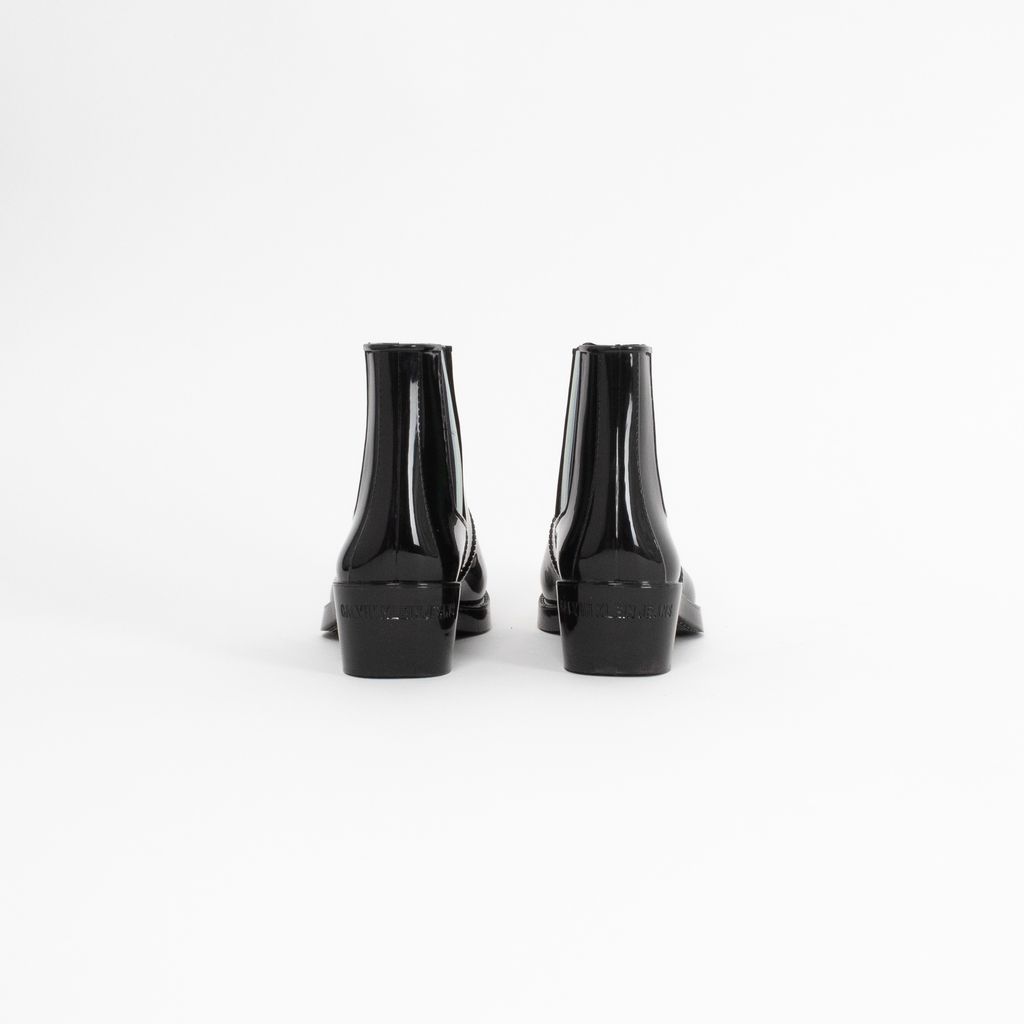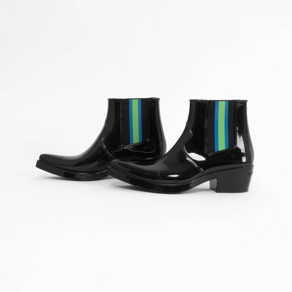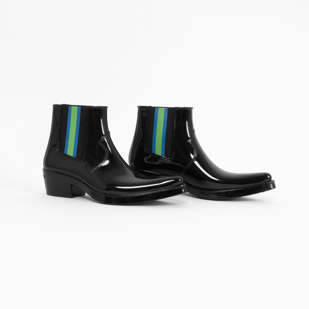 A style traditionally done in leather, these western style boots from Calvin Klein Jeans get a rubberized treatment that's perfect for a rainy day. Features glossy body, pointed toe, low heel with Calvin Klein Jeans logo embossed in the back, and tri-toned elastic panels for ease of wear.