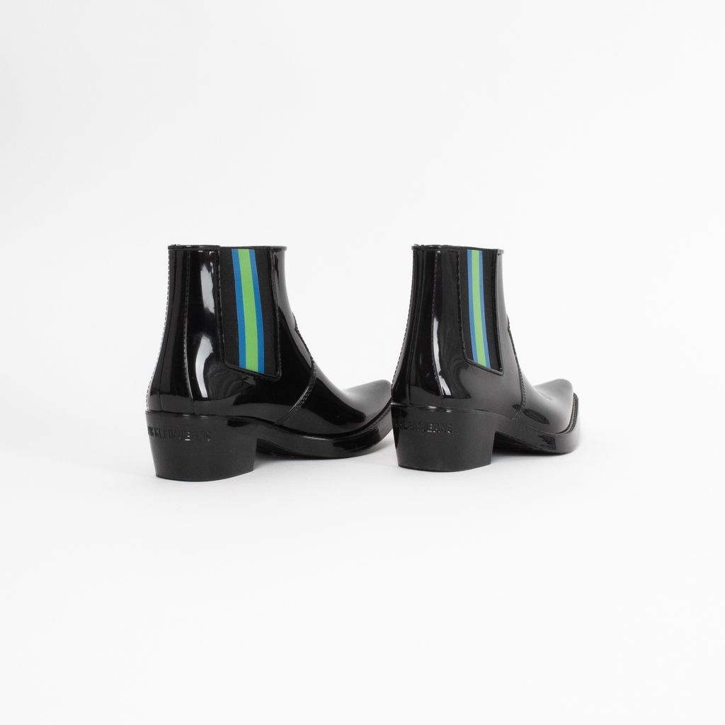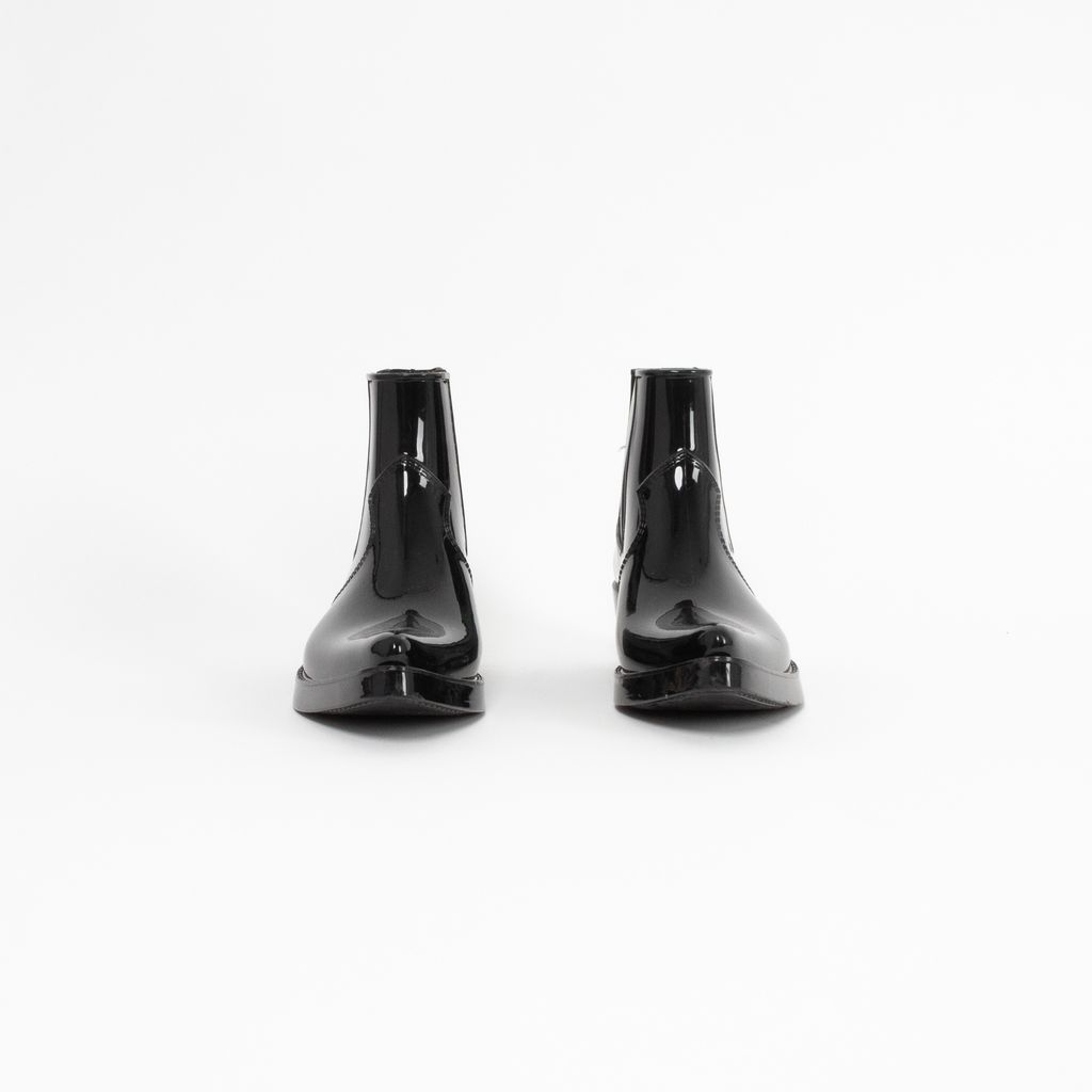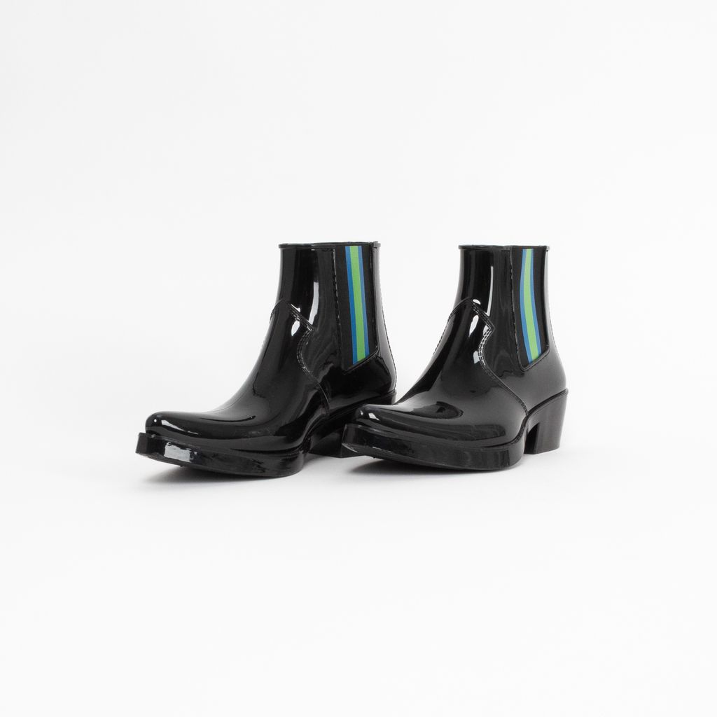A style traditionally done in leather, these western style boots from Calvin Klein Jeans get a rubberized treatment that's perfect for a rainy day. Features glossy body, pointed toe, low heel with Calvin Klein Jeans logo embossed in the back, and tri-toned elastic panels for ease of wear.