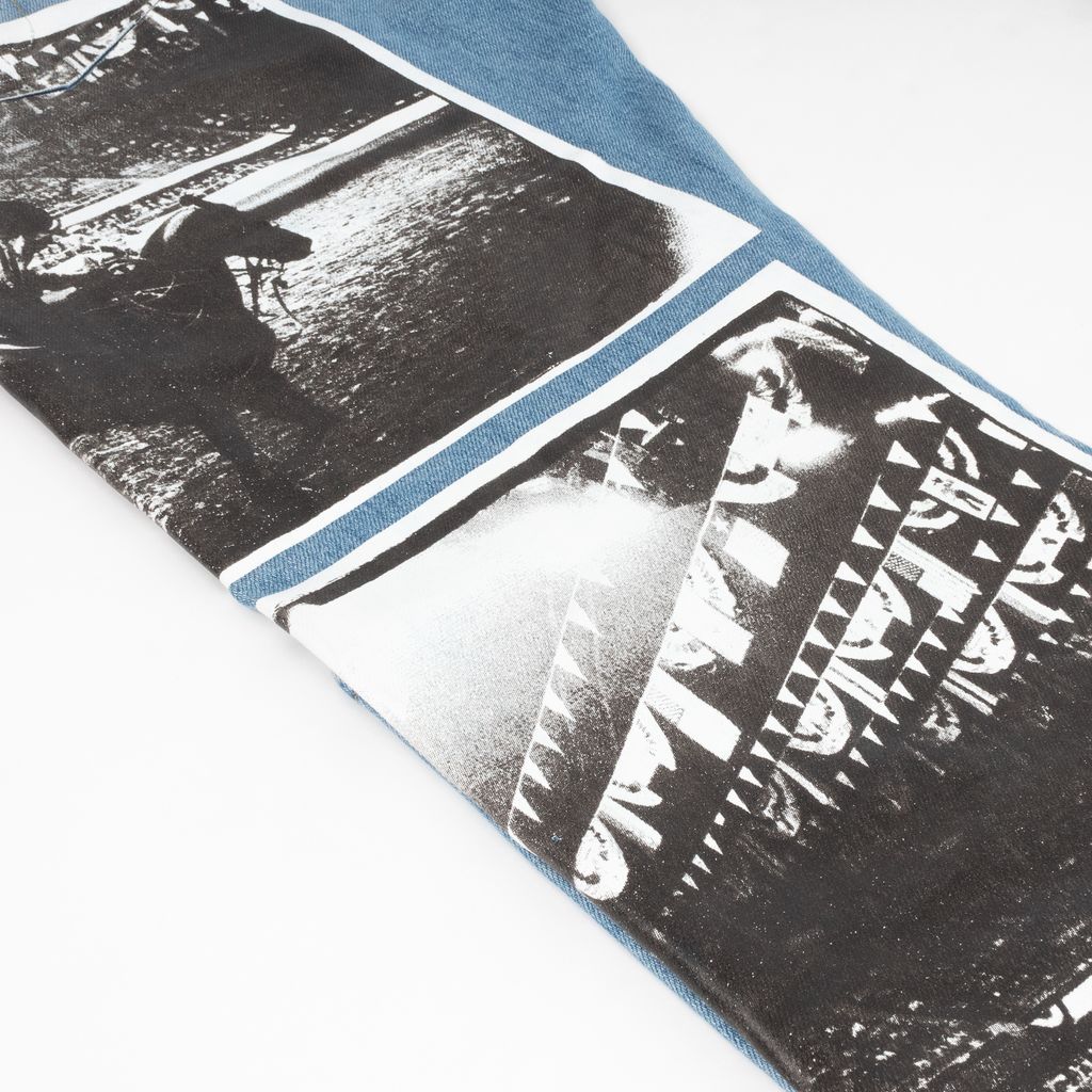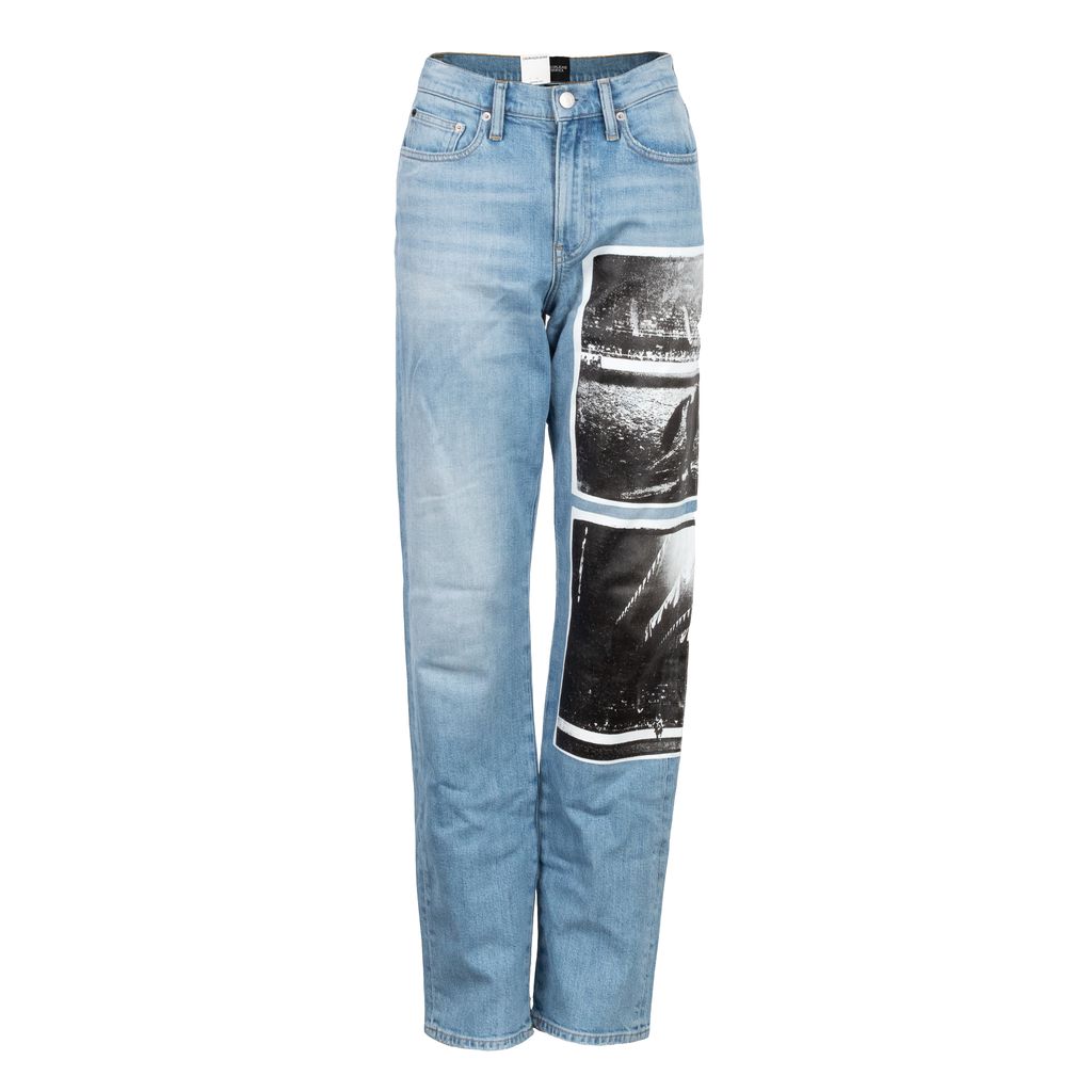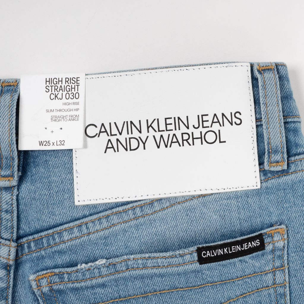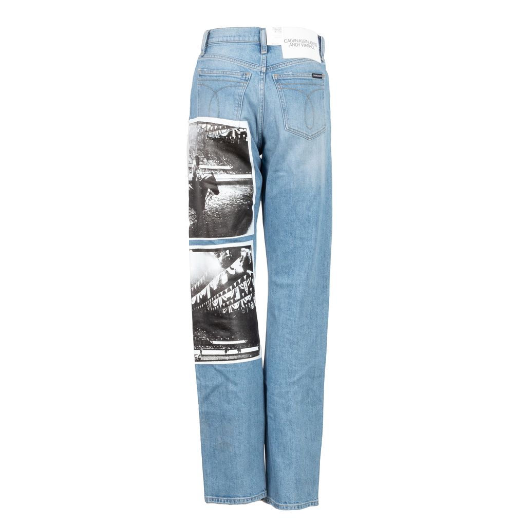 A part of the fantastic art world meets fashion world collaboration between Calvin Klein Jeans and the Andy Warhol Foundation, these jeans are made special with a rubberized overlay of his 1978 Rodeo photos. Features high rise and straight leg silhouette, wrap around printed photographs taken by Andy Warhol, zip and button closure at waist, and Calvin Klein Jeans x Andy Warhol leather patch at back waist.