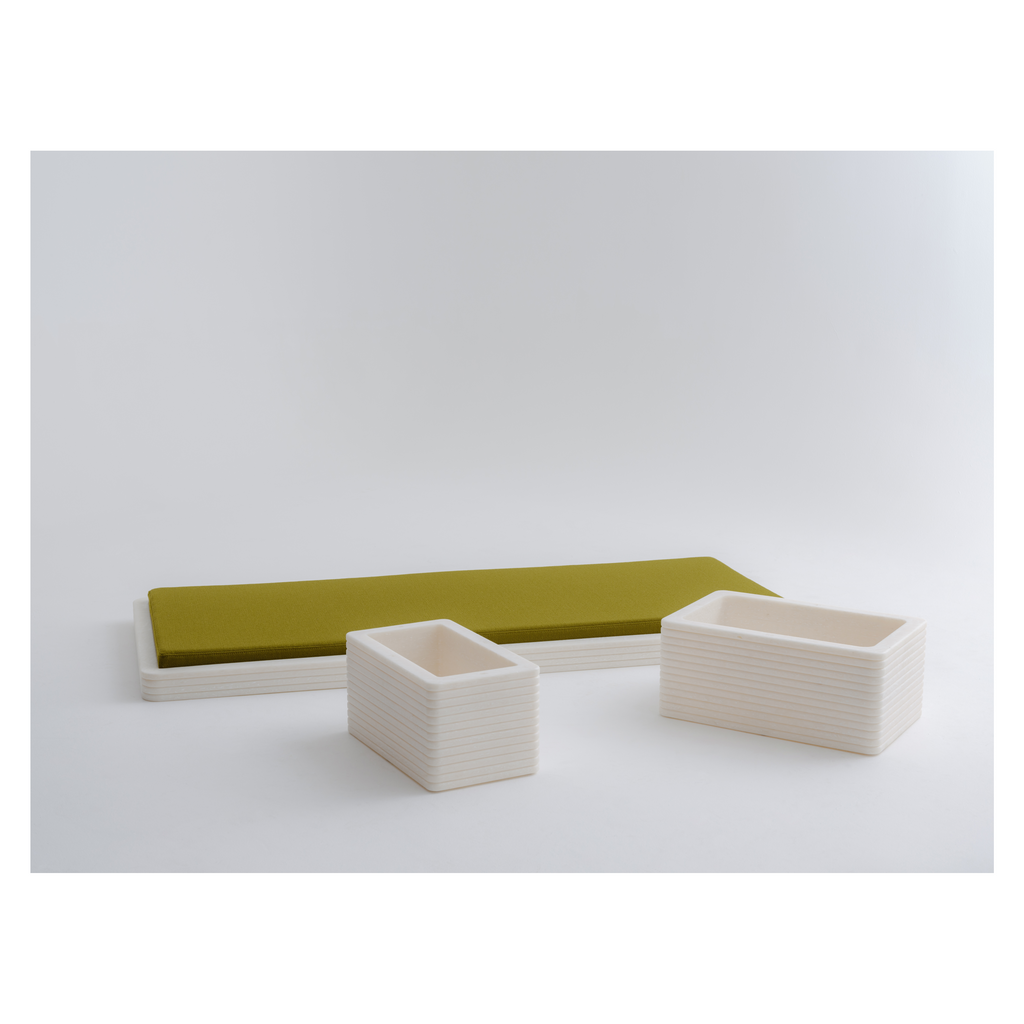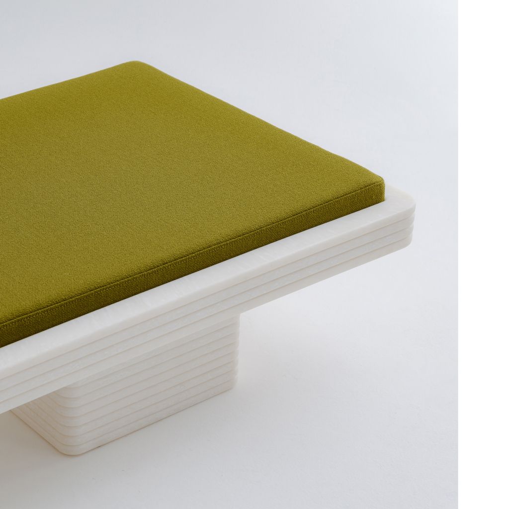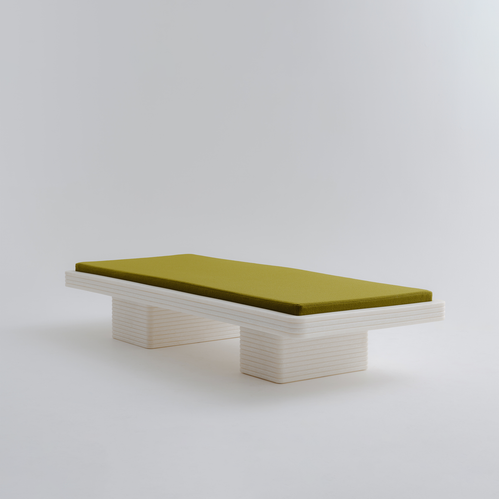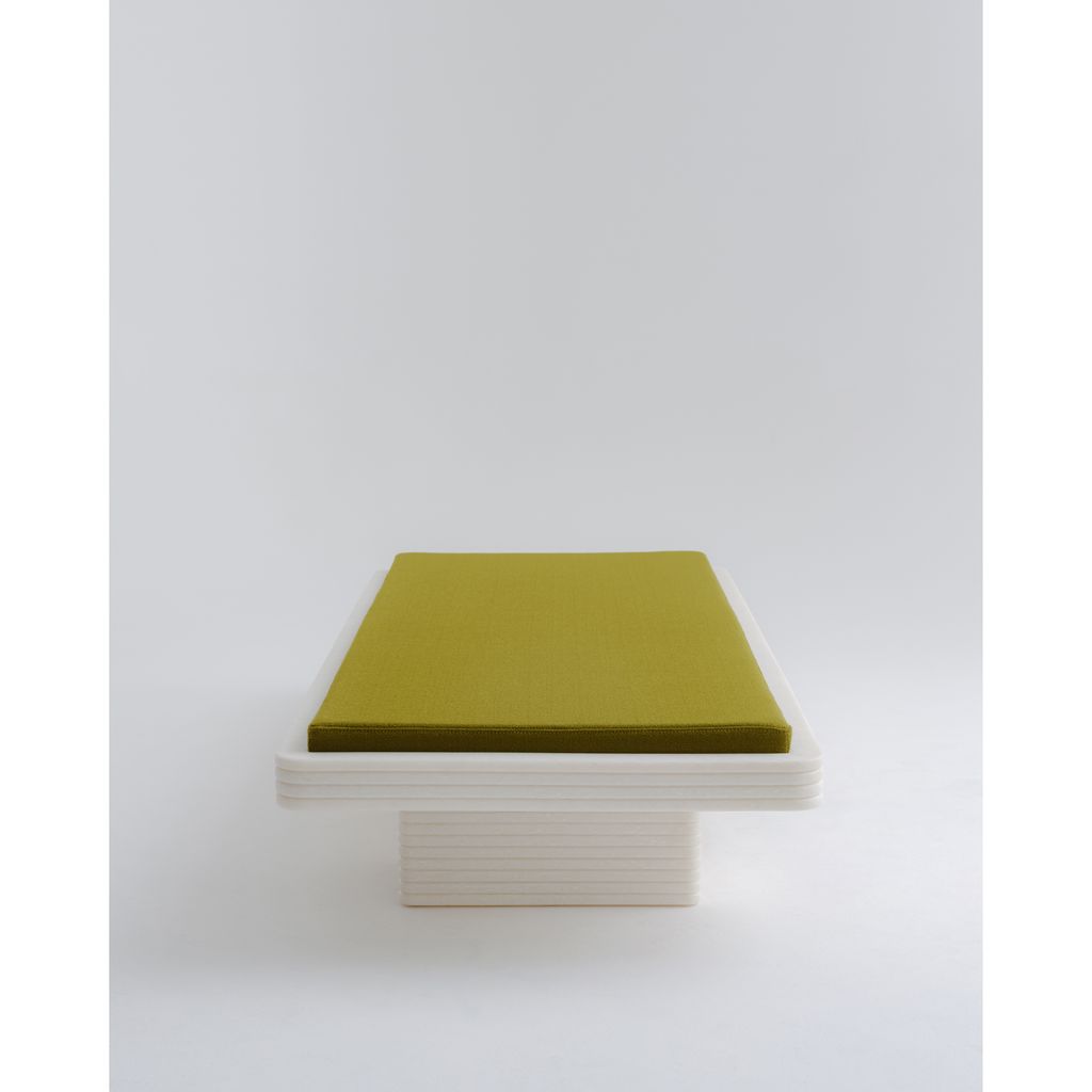 Reimagining waste in the form of contemporary design. The Camada daybeds innovative construction uses no glue or fixings with a layering aesthetic representing a full bodied design. Fabricated from 100% recycled sheets, the Camada daybed can be produced from plastic recycling manufacturers world wide thus avoiding shipping emissions and furthering the environmental benefits of the design. Tightly laid in the Vidar 4 contrasting in colour and material, the soft warm vibrant fabric complements the plastic frame.