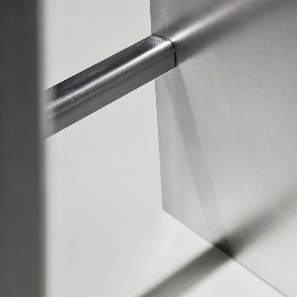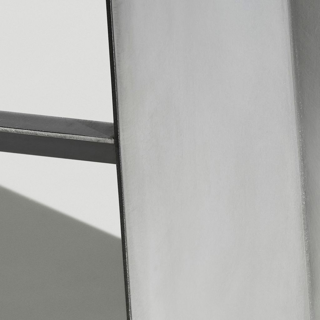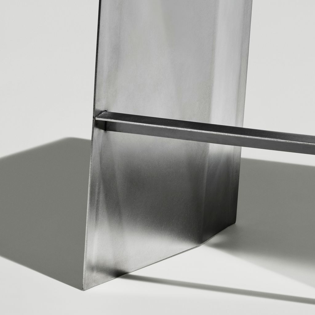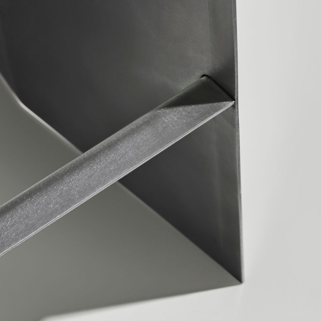 The Camber collection originated from the idea of manufacturing a piece of furniture from a single piece of sheet metal. The inclining angle of the seat formed the basis for the rest of the design, with each cut and fold having the same 5 degree angle. Starting with a flat rectangle, two angular cuts are made. The first three folds are then made lengthwise by machine, after which the legs are finally bend into the right angle by hand.