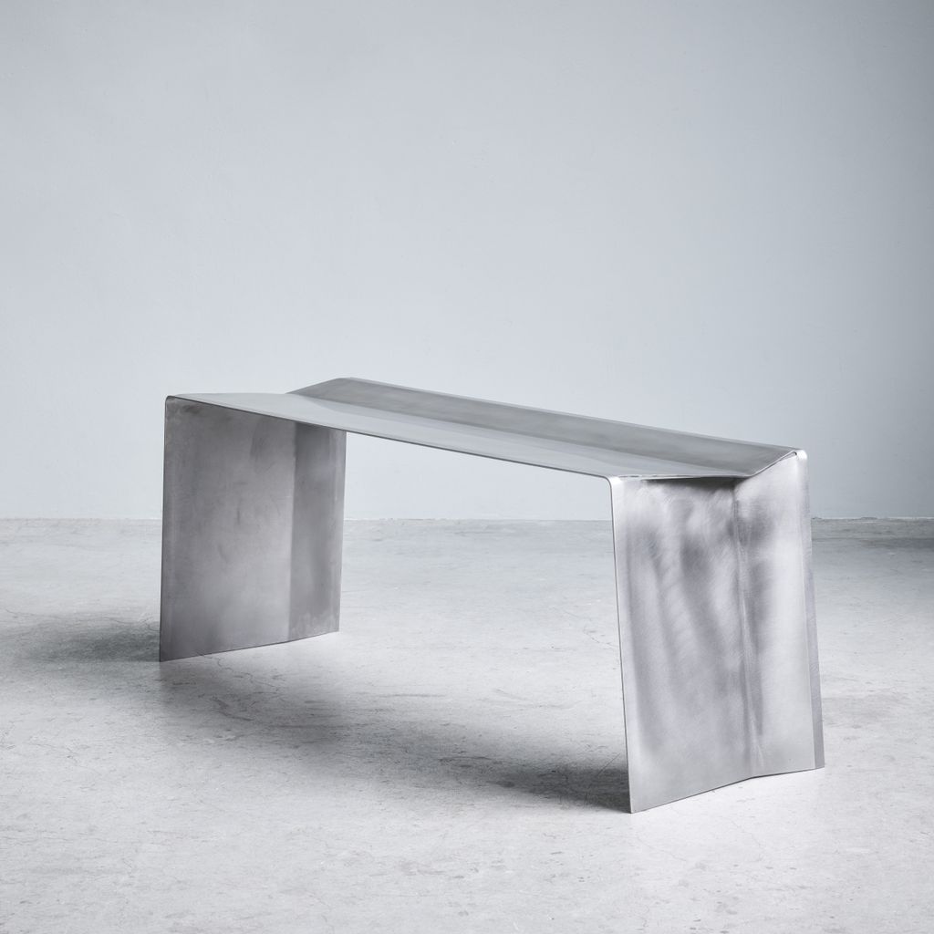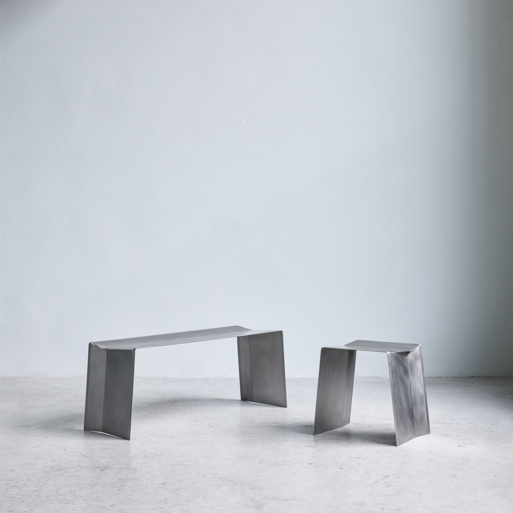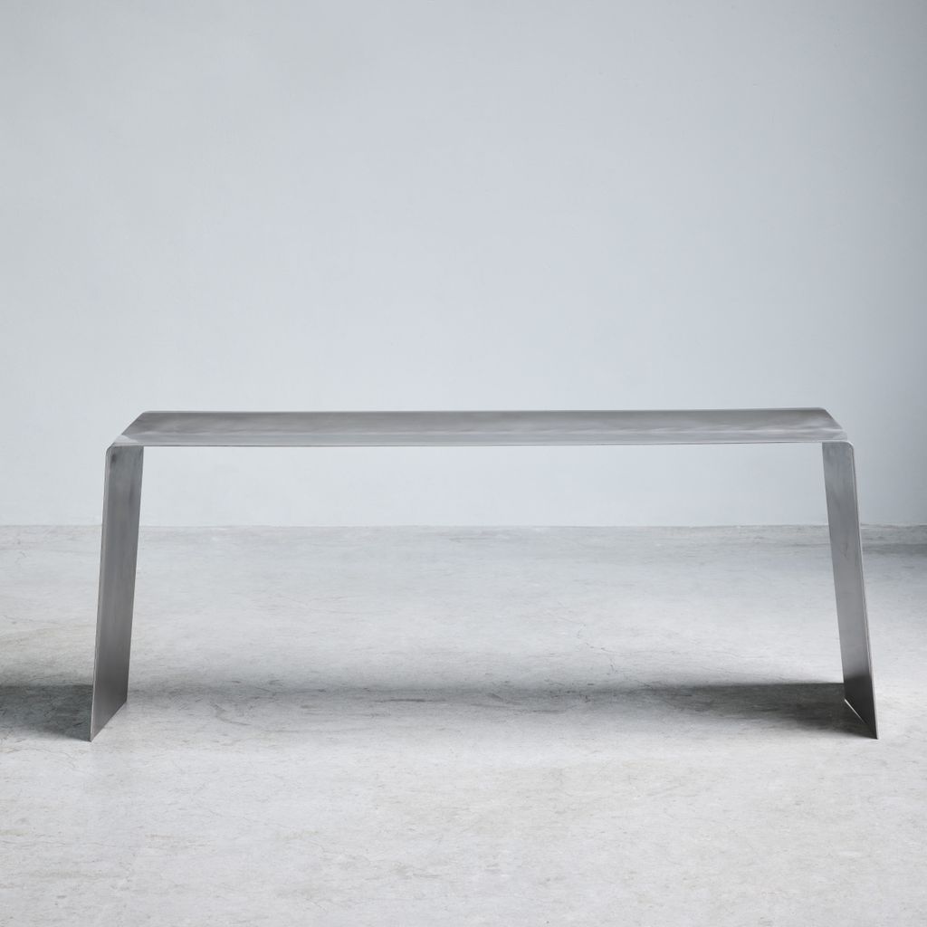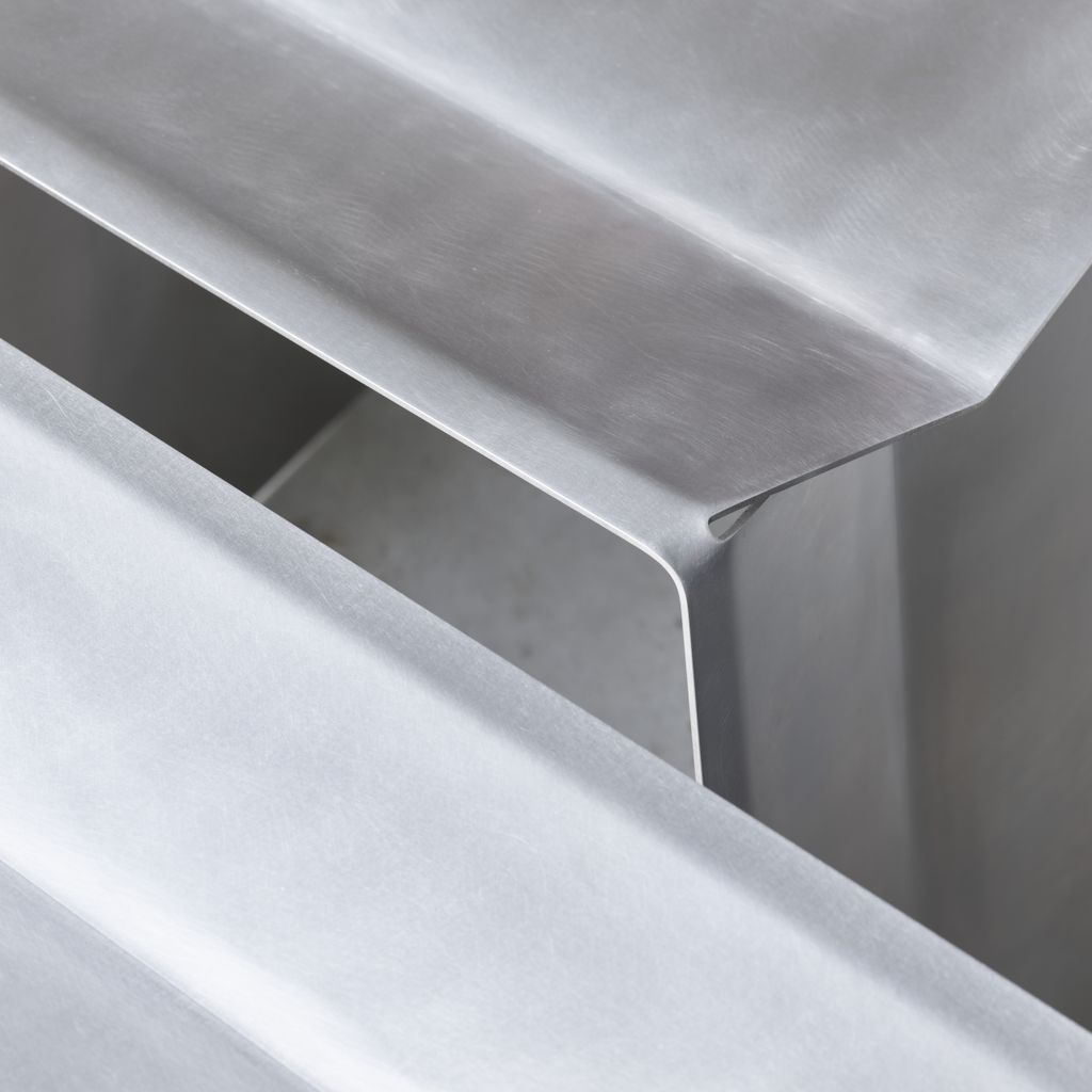 The Camber bench originated from the idea of manufacturing a piece of furniture from a single piece of sheet metal. The inclining angle of the seat formed the basis for the rest of the design, with each cut and fold having the same 5 degree angle. Starting with a flat rectangle, two angular cuts are made. The first three folds are then made lengthwise by machine, after which the legs are finally bent into the right angle by hand.
