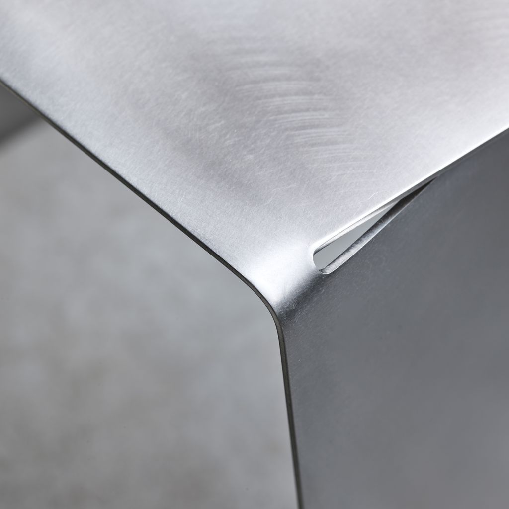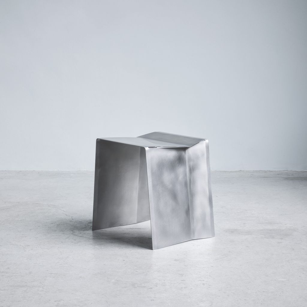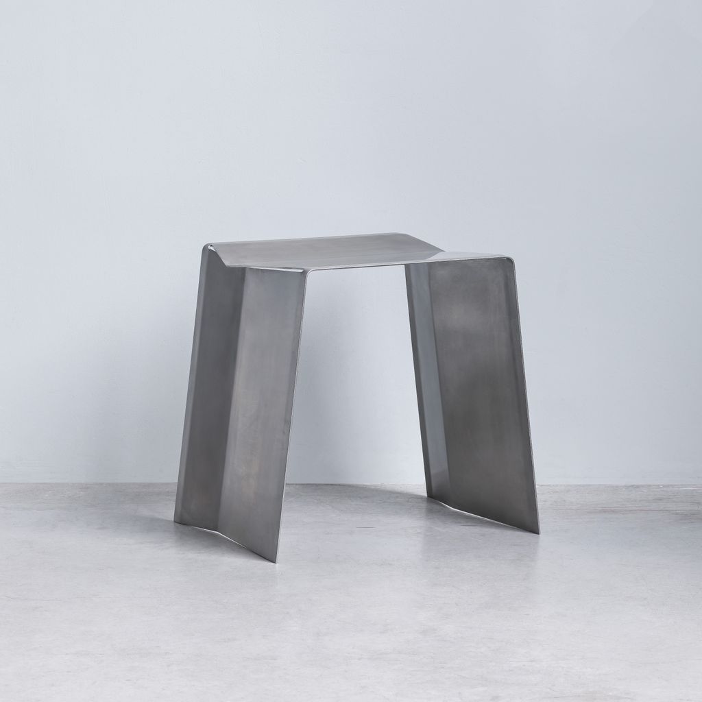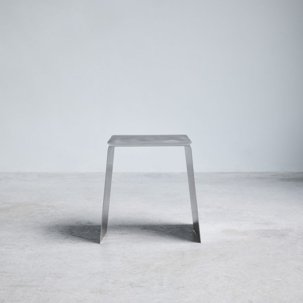 The Camber stool originated from the idea of manufacturing a piece of furniture from a single piece of sheet metal. The inclining angle of the seat formed the basis for the rest of the design, with each cut and fold having the same 5 degree angle. Starting with a flat rectangle, two angular cuts are made. The first three folds are then made lengthwise by machine, after which the legs are finally bent into the right angle by hand.