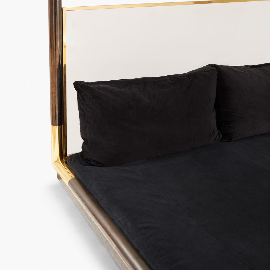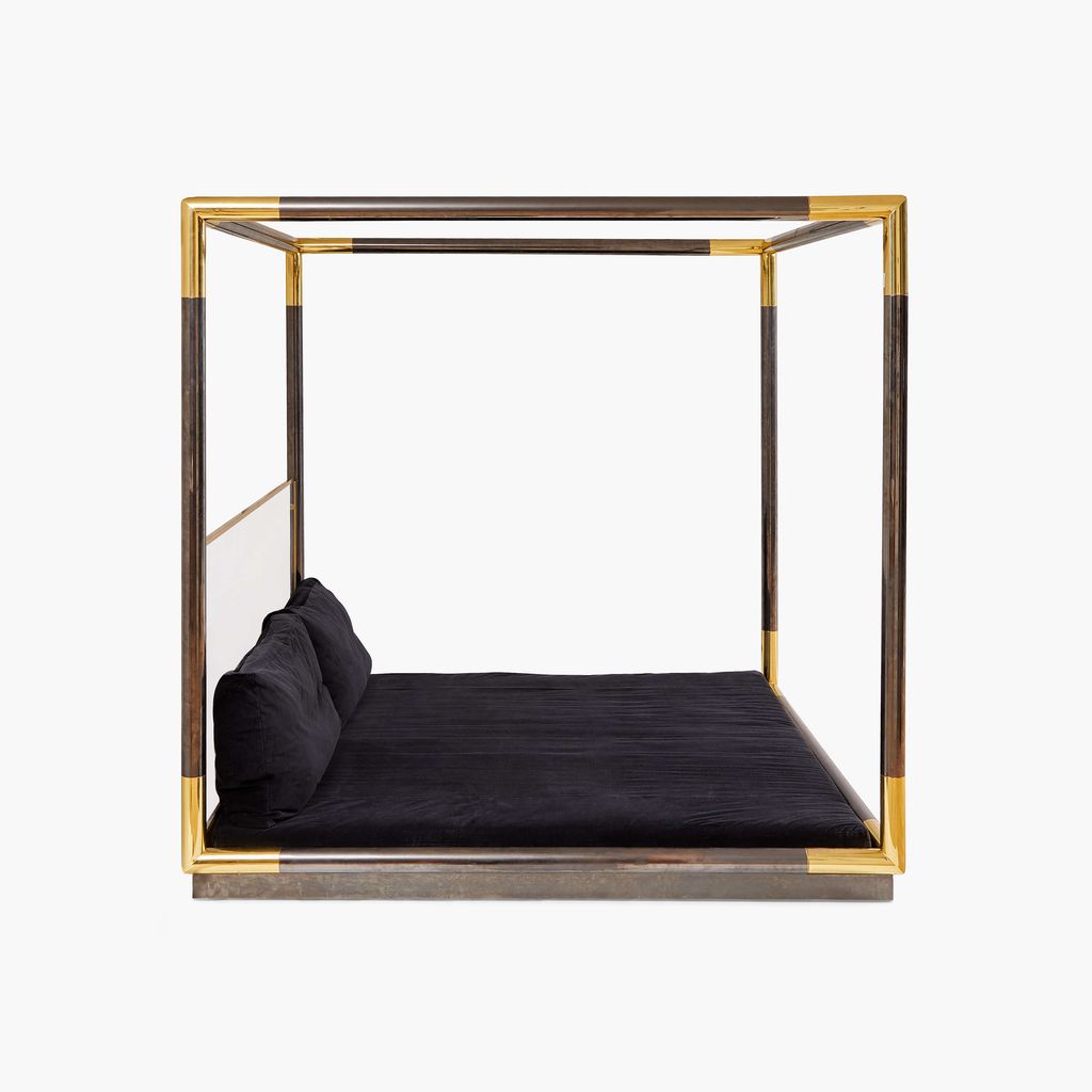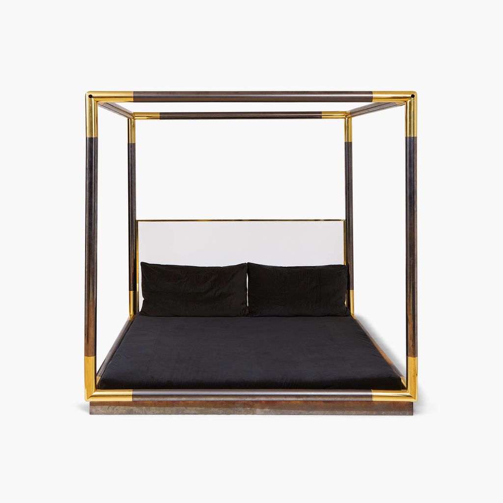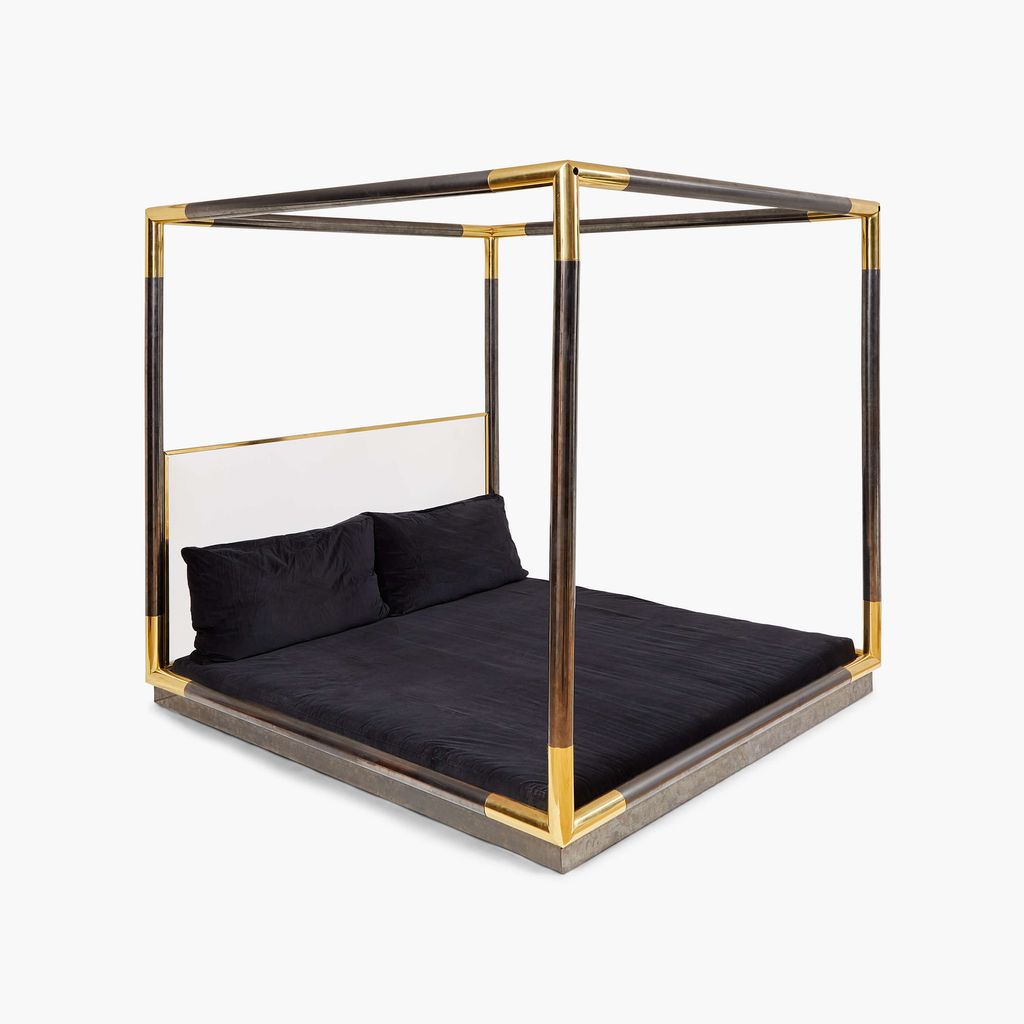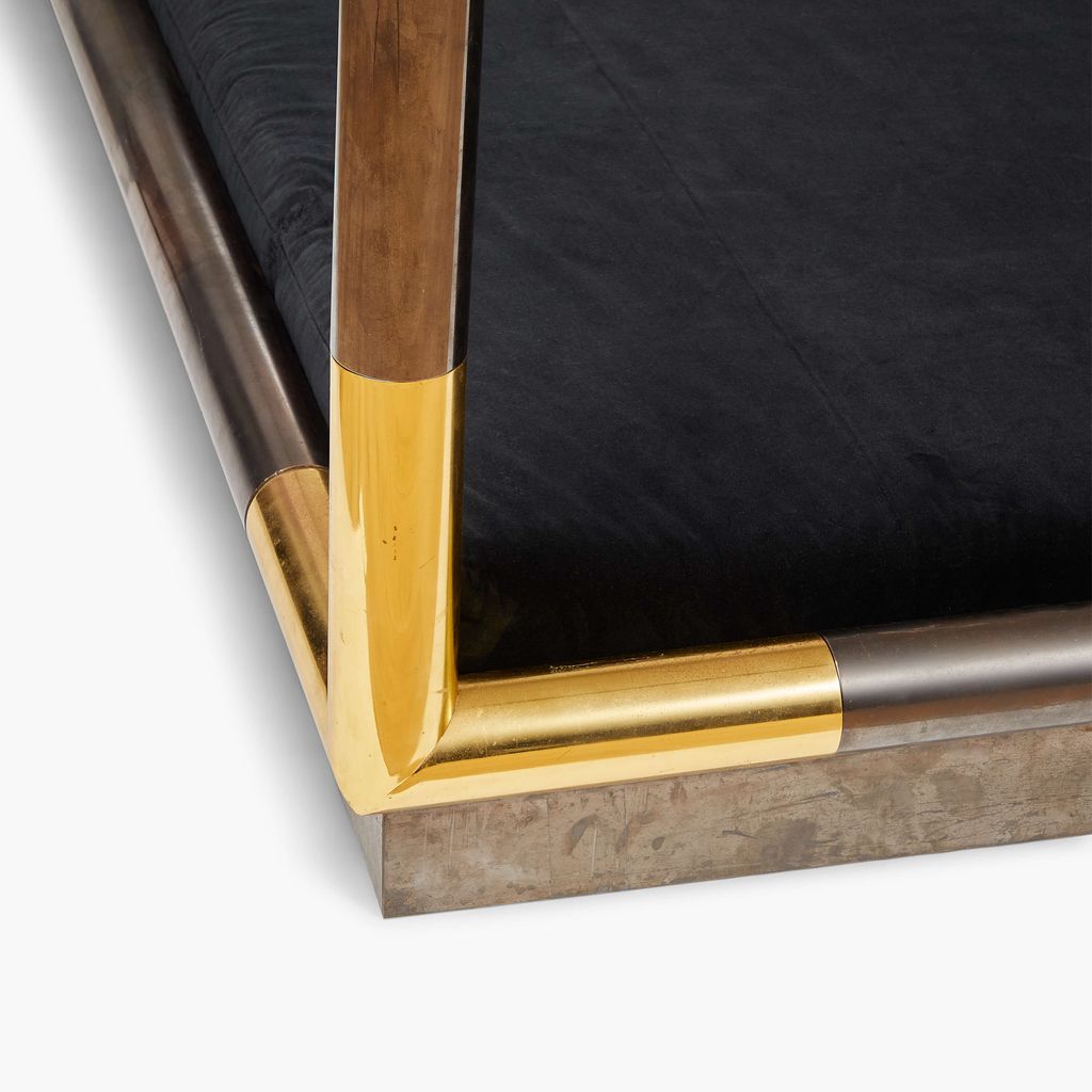 Karl Springer's sleek and inviting canopy bed captures his unparalleled eye for fusing unusual materials into the ultimate statement piece. The frame, constructed from exquisitely finished gunmetal with brass corners, and lucite headboard, framed in brass, rest on a wood base.