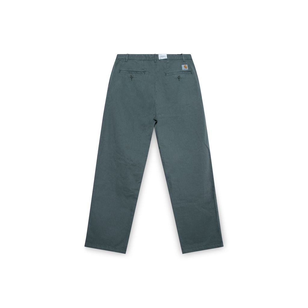 Carhartt Work in Progress Salford pants features herringbone texture throughout, straight legs, four pockets, front zip and button closure, and patch logo at back.