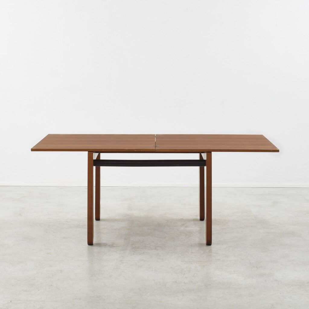 Poised on unusual curved feet, this solid oak dining table by Carlo Scarpa reveals a playful construction in rounded forms. Two ebonised crossbars provide support, while a flip top and sliding mechanism enables the table to extend to double the original width. Four matching dining chairs are available.