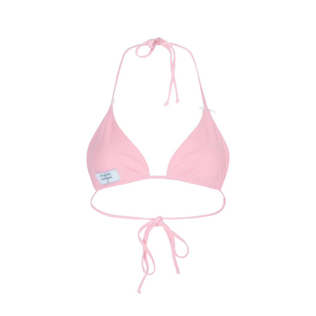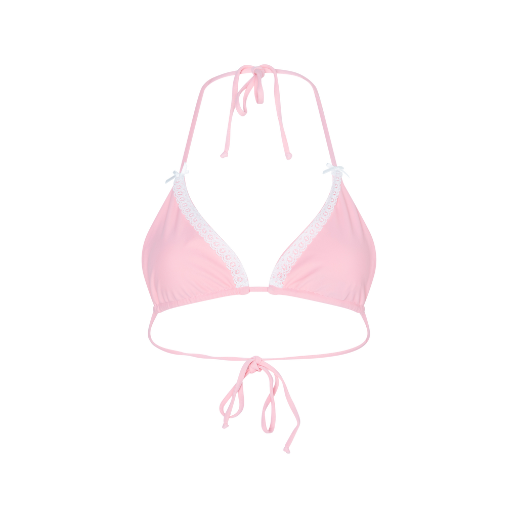 Carmen Pink Bikini Top features white lace edges, delicate bow, and ultra thin straps.