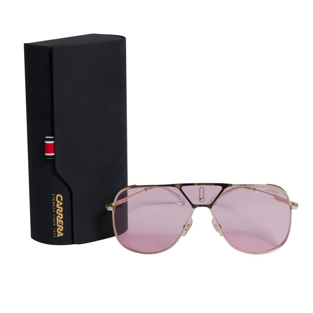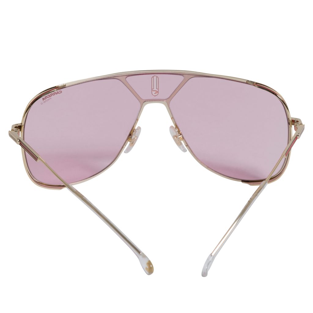 These oversized square profile sunglasses from Carrera come with rose gold-tone metal rims and arms. Features iconic flag temples, C-logo on central lens, logo lettering on the left lens and along both arms. Pink photochromic PHOTO-C lenses adapt their level of tint as the sunlight changes throughout the day! Comes with sunglass case.
