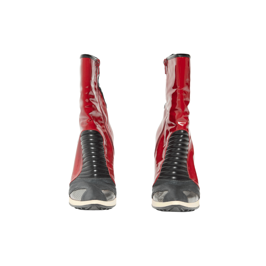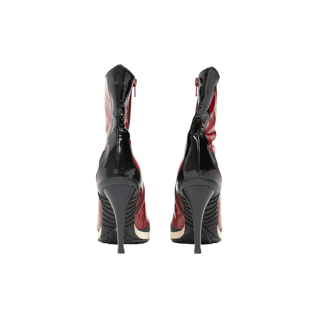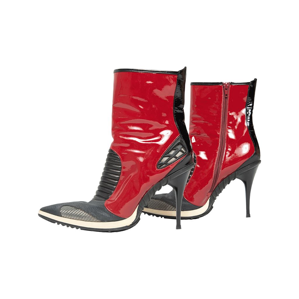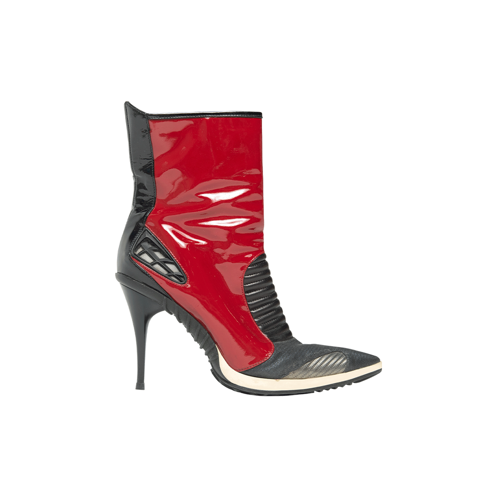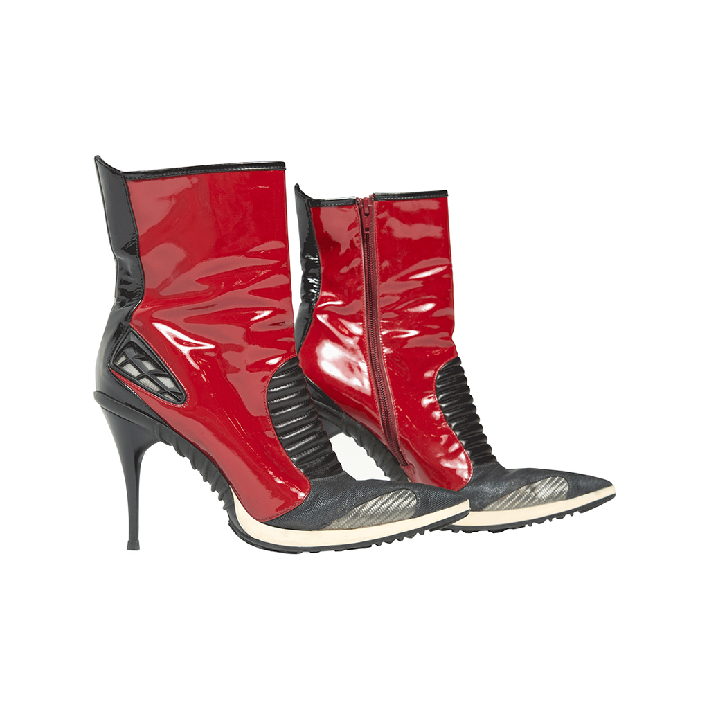 Casadei Red Patent Leather Boots features stiletto heel, pointed toe, inner zip closure, red patent leather body, and black toe and counter.