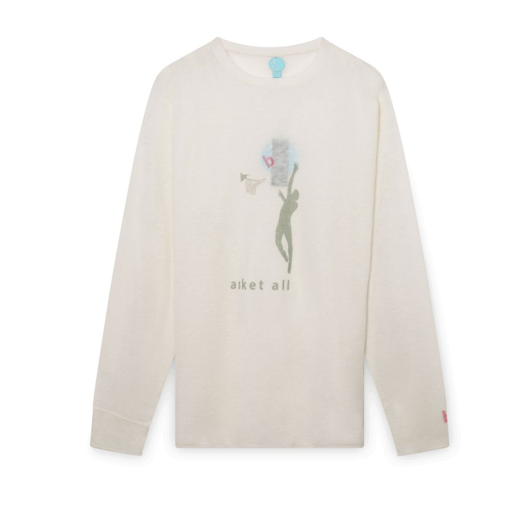 This long sleeve shirt features a basketball graphic designed by artist Adrian Schachter. It is 100% cashmere, semi-sheer, has a slightly oversized fit, and is the most comfortable shirt you'll ever own.