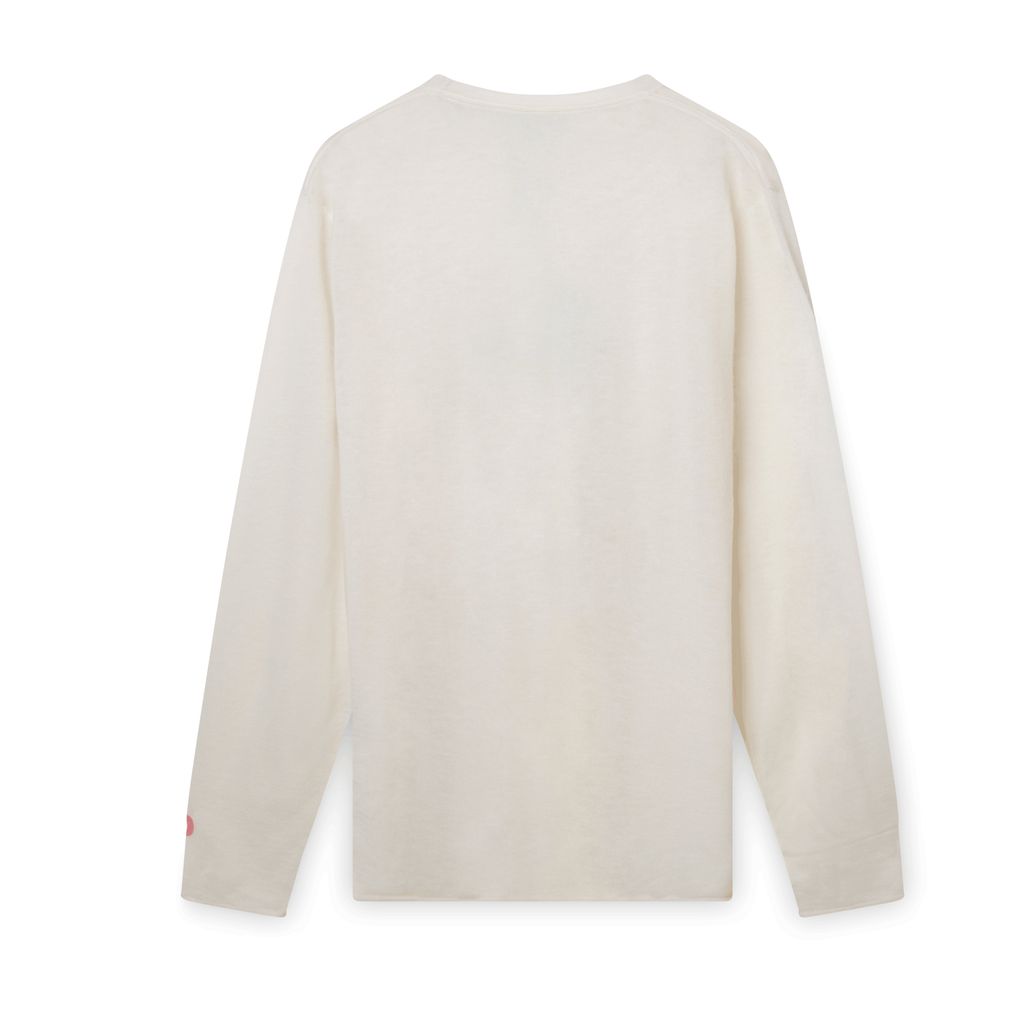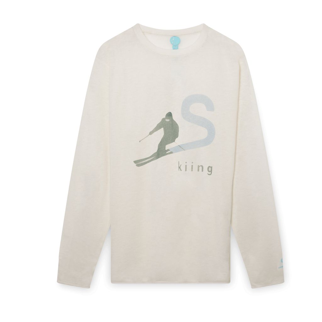 This long sleeve shirt features a skiing graphic designed by artist Adrian Schachter. It is 100% cashmere, semi-sheer, has a slightly oversized fit, and is the most comfortable shirt you'll ever own.